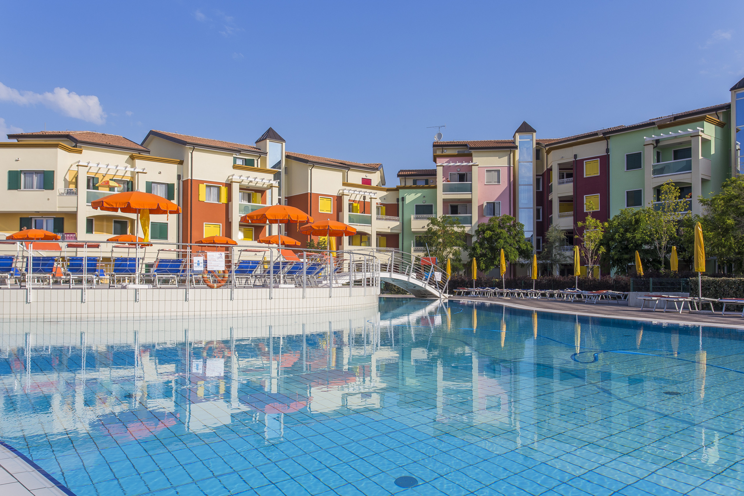 Gli appartamenti hanno diverse esposizioni e viste, alcune affacciate sulla piscina, altre sul vialetto interno, garantendo un’atmosfera sempre piacevole e rilassante.