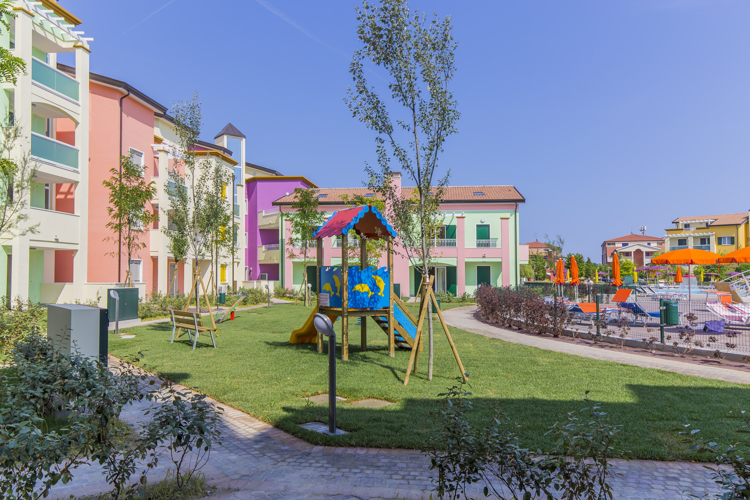 Gli appartamenti offrono diverse esposizioni, alcune affacciate sulla piscina, altre sul vialetto interno, per garantire sempre una vista piacevole e rilassante.