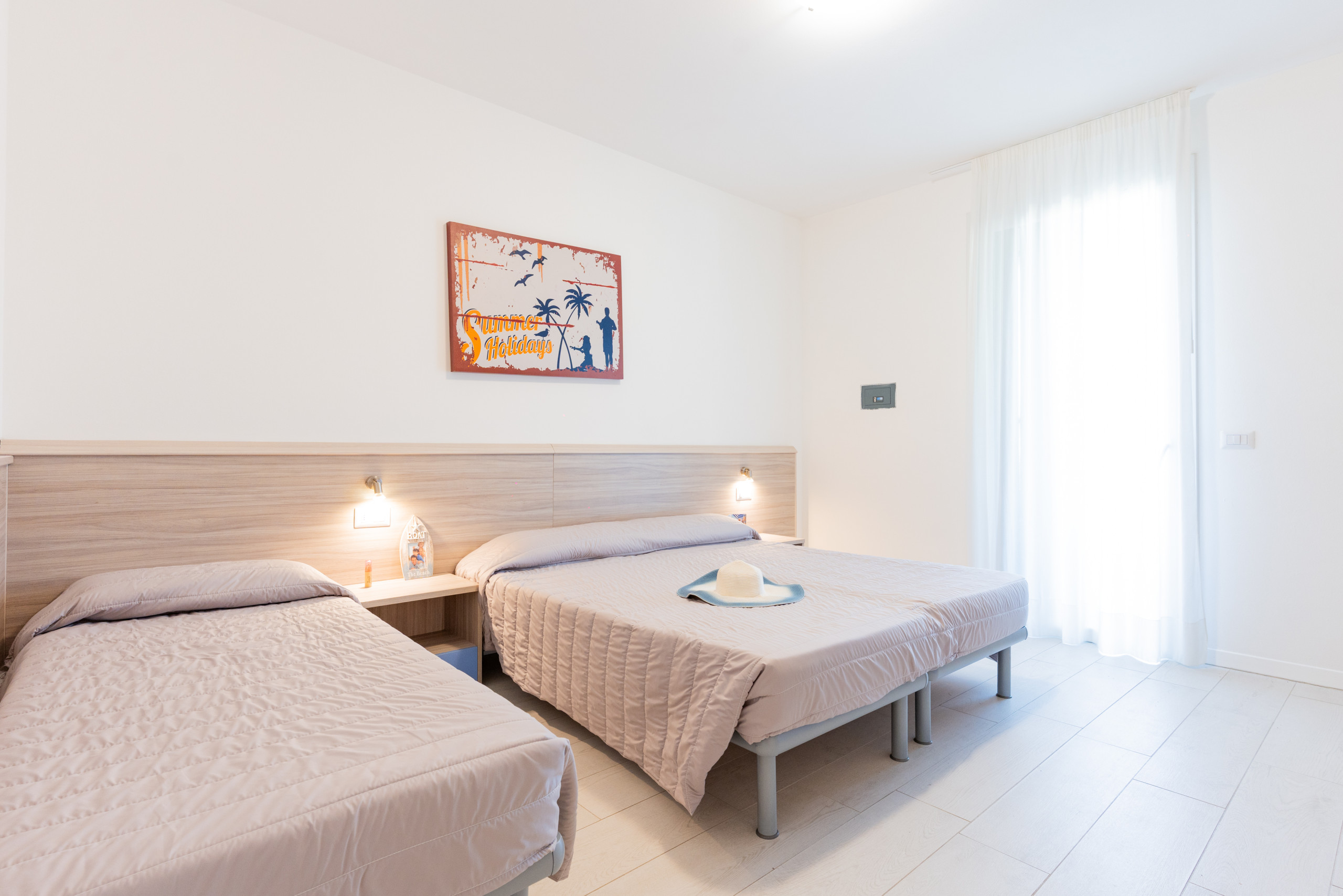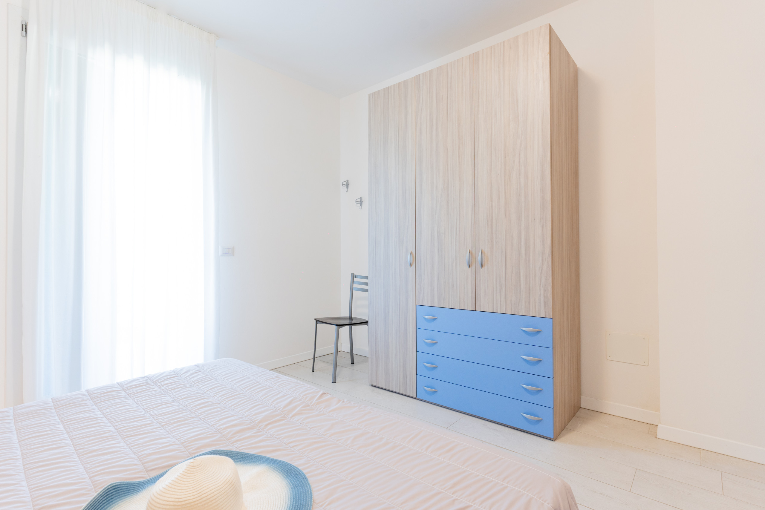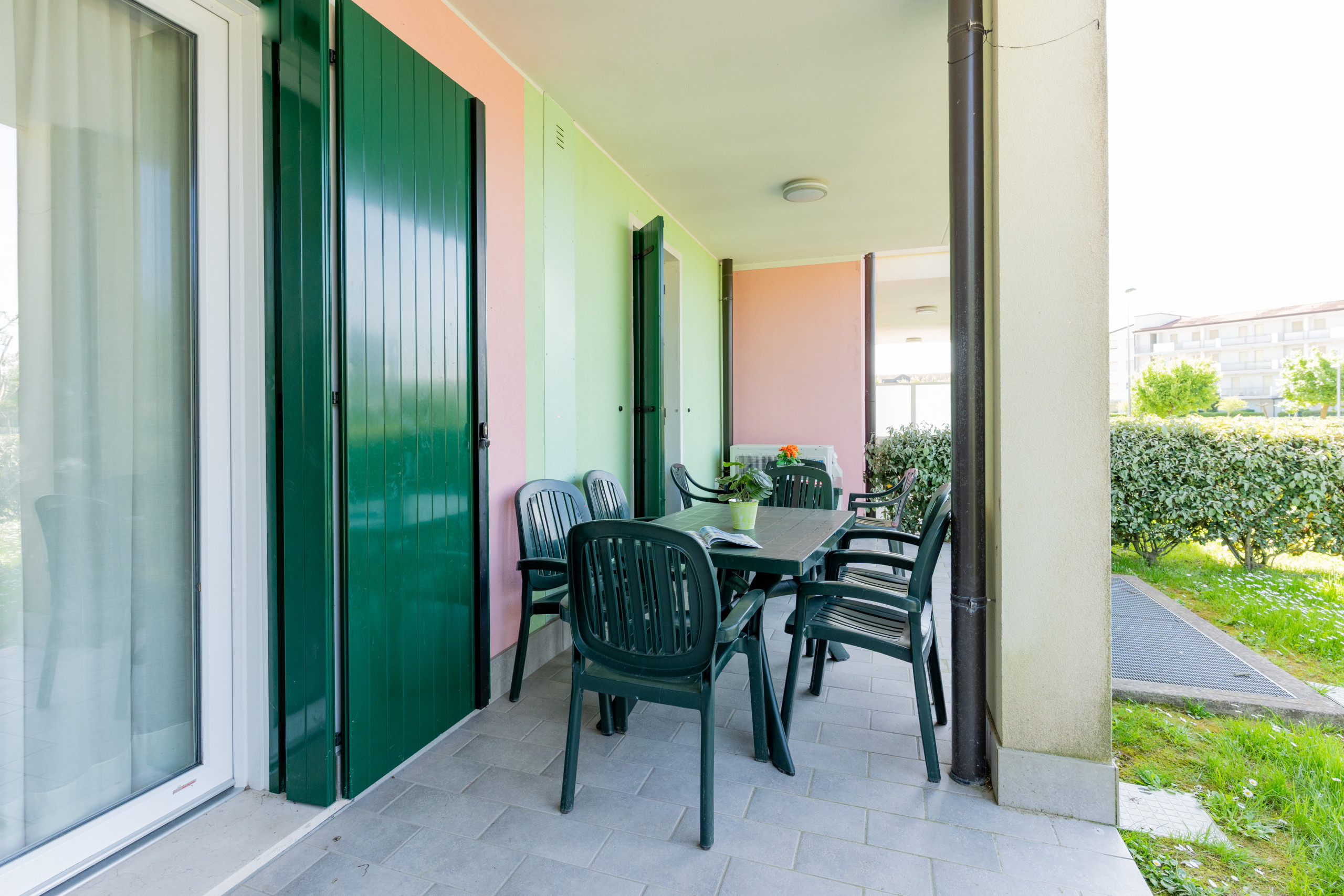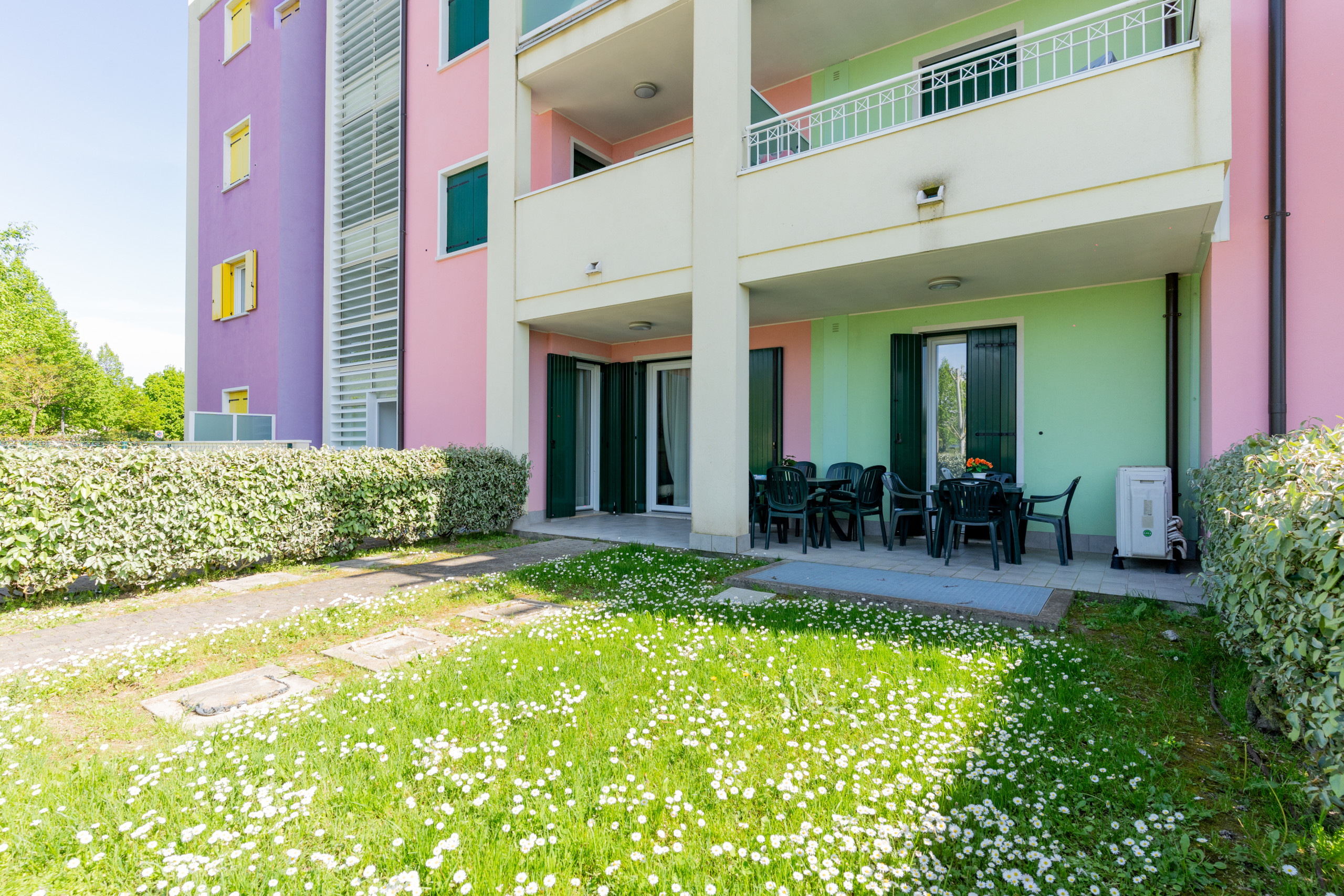 Tutti gli appartamenti si sviluppano su un unico livello e alcuni offrono la vista sulla piscina e altri con vista lateralmente. Il soggiorno dispone di angolo cottura attrezzato, tavolo, sedie e divano letto matrimoniale alla francese, con accesso al balcone o al giardino, ideale per pranzi e cene all’aperto. La camera principale è arredata con letto matrimoniale e letto singolo, mentre la seconda camera offre due letti singoli. Il bagno è spazioso e dotato di box doccia.
