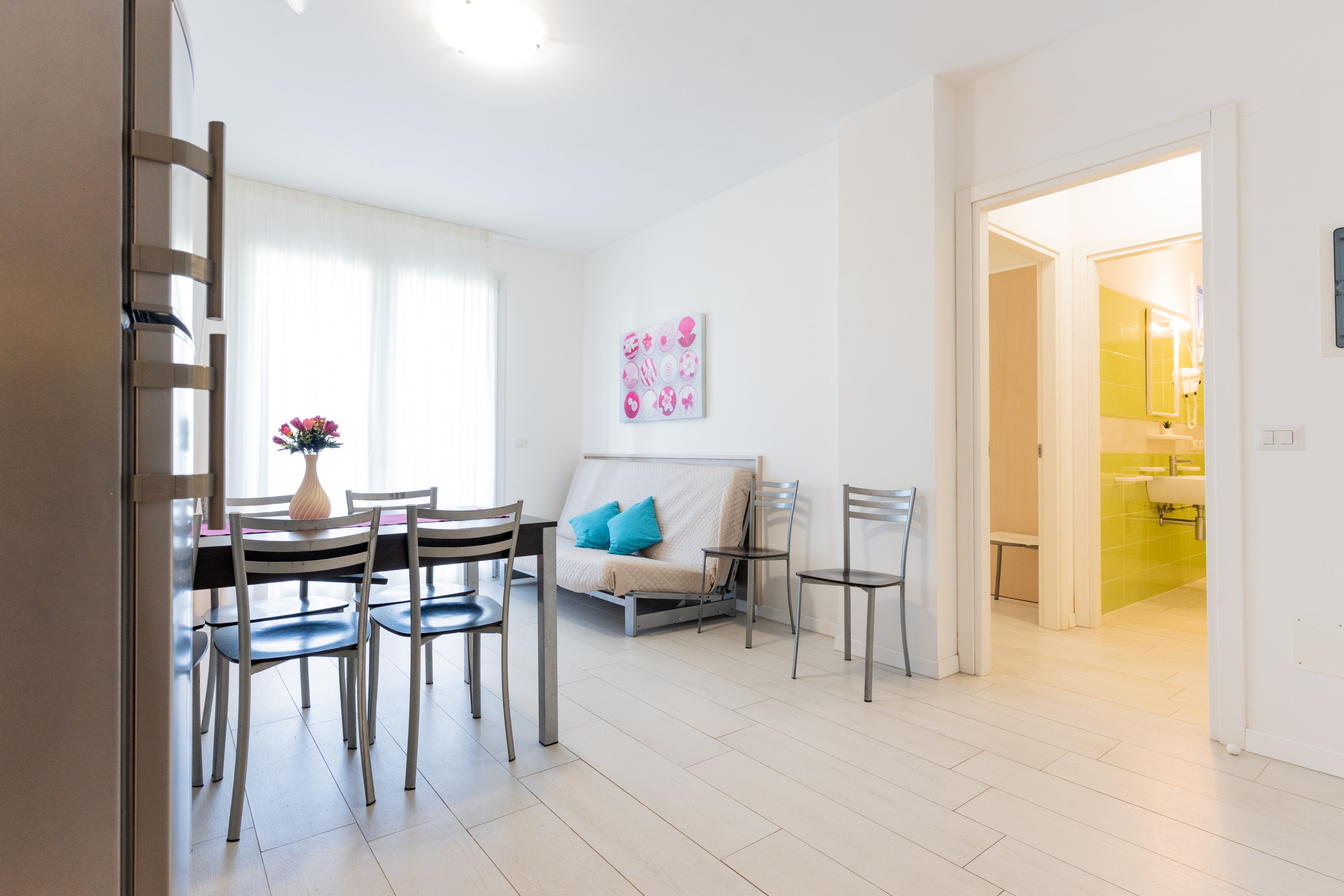 • soggiorno luminoso con angolo cottura attrezzato, tavolo da pranzo, divano letto matrimoniale alla francese e accesso a terrazzo o balcone;