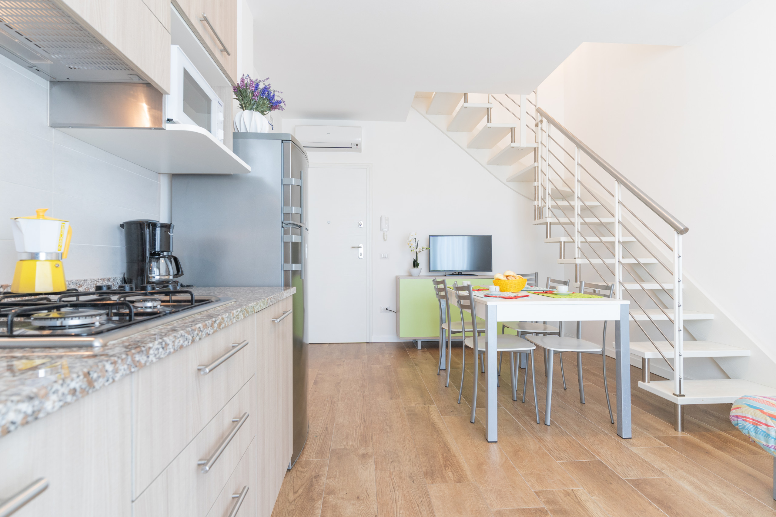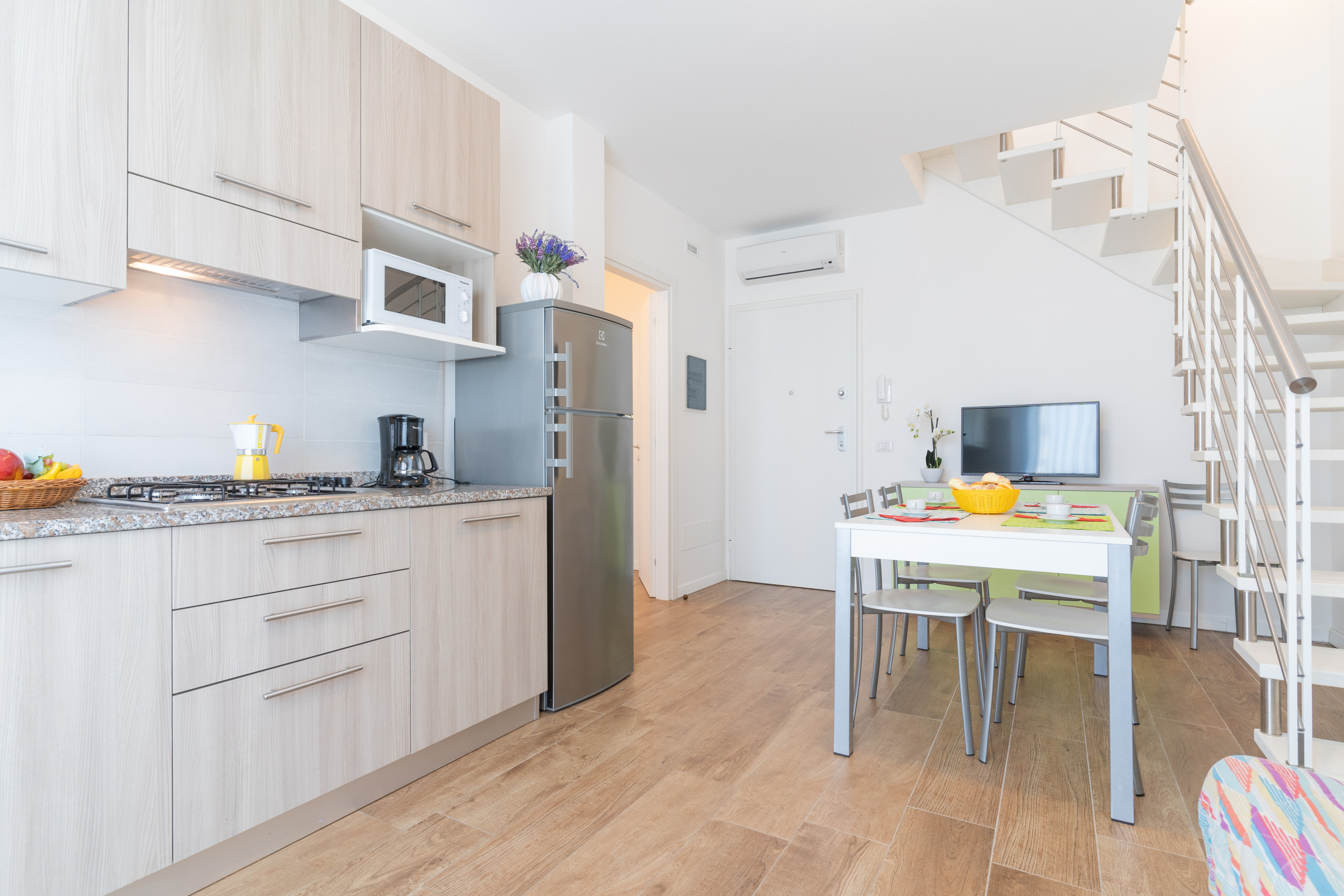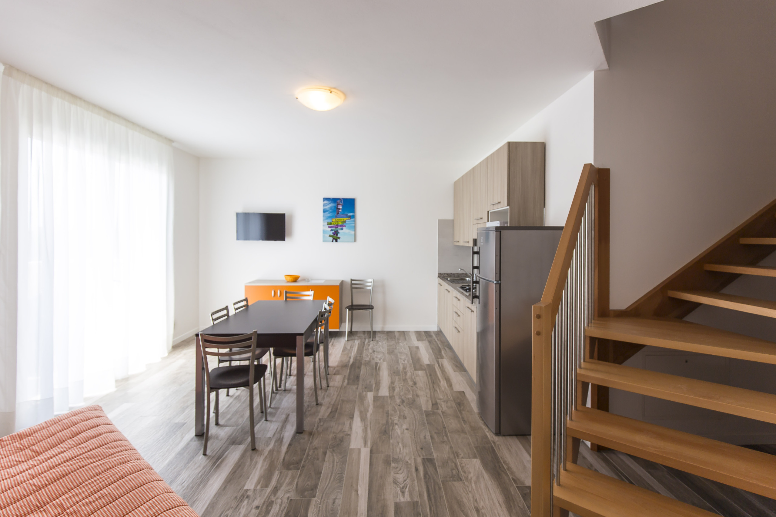 • soggiorno luminoso con angolo cottura attrezzato, tavolo da pranzo, divano letto matrimoniale alla francese e accesso a terrazzo o balcone;
