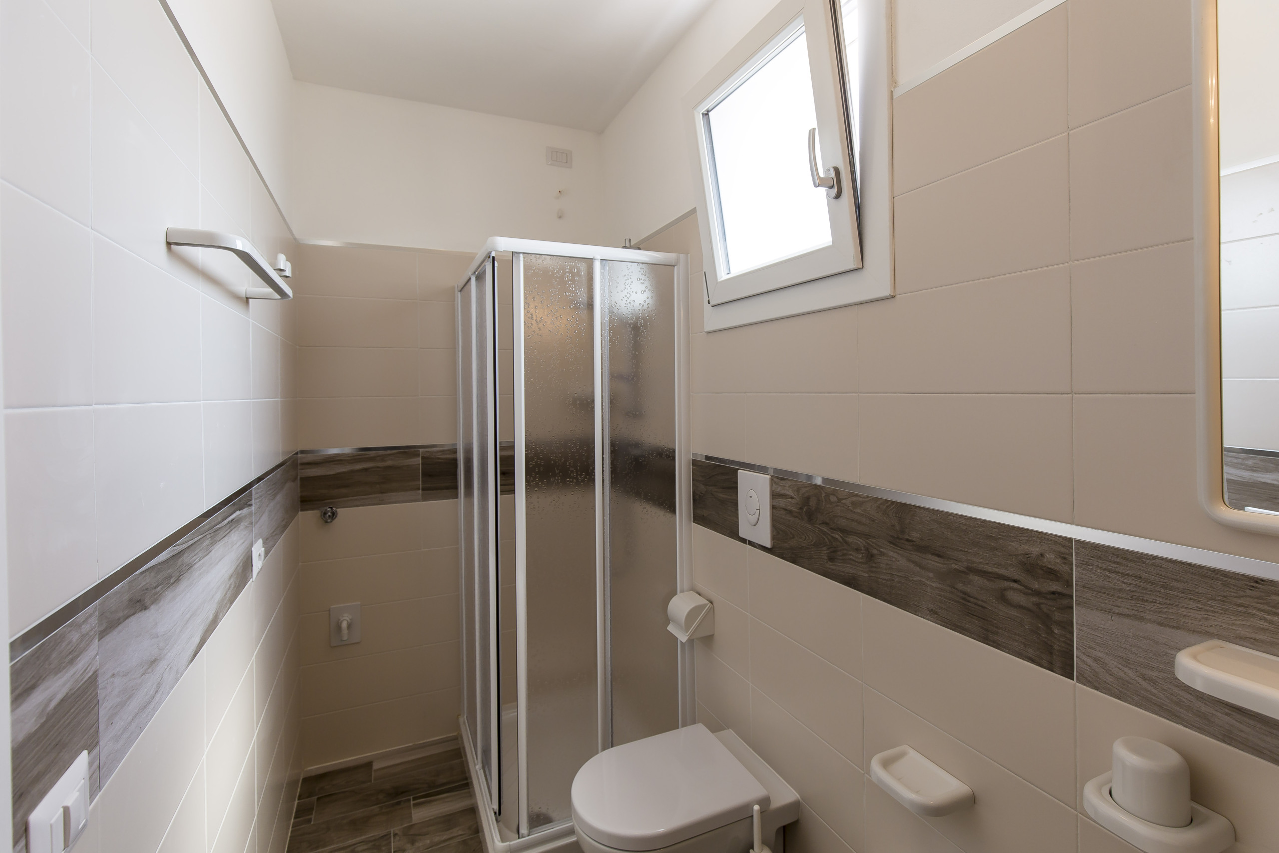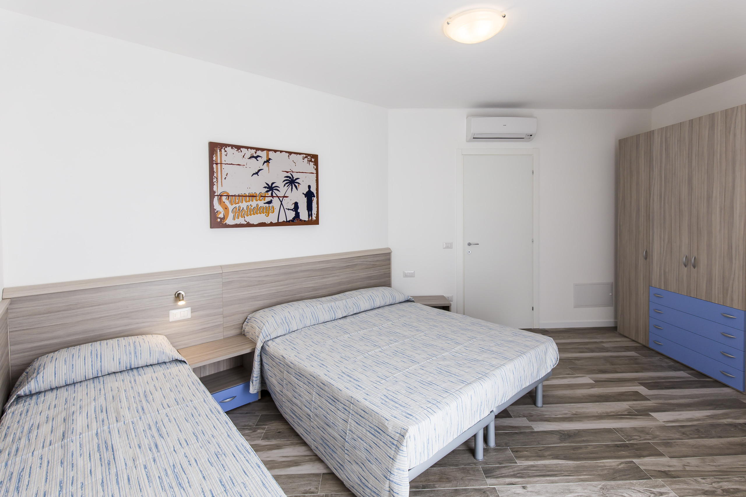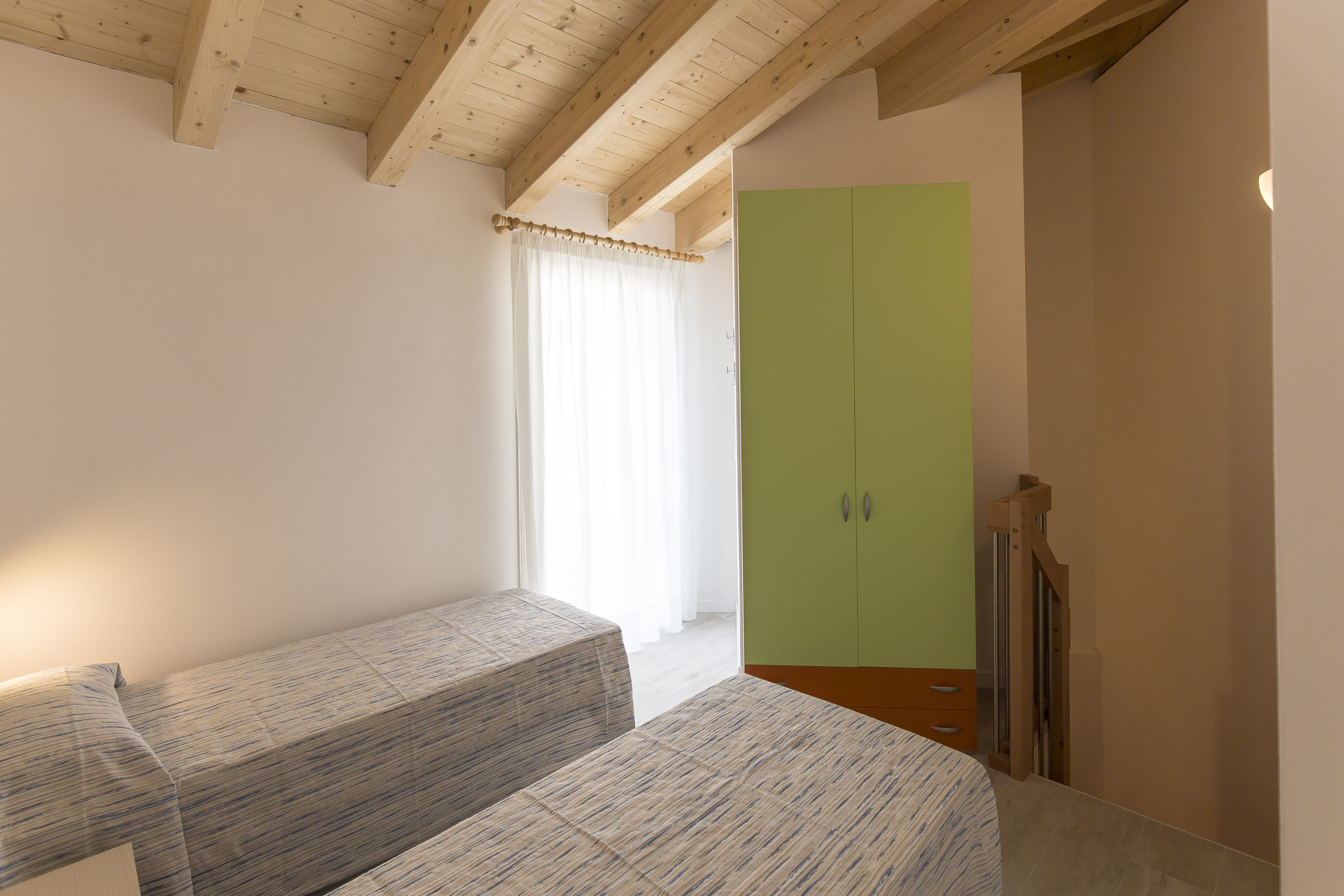 Tutti gli appartamenti si sviluppano su un unico livello e alcuni offrono la vista sulla piscina e altri con vista lateralmente. Il soggiorno dispone di angolo cottura attrezzato, tavolo, sedie e divano letto matrimoniale alla francese, con accesso al balcone o al giardino, ideale per pranzi e cene all’aperto. La camera principale è arredata con letto matrimoniale e letto singolo, mentre la seconda camera offre due letti singoli. Il bagno è spazioso e dotato di box doccia.