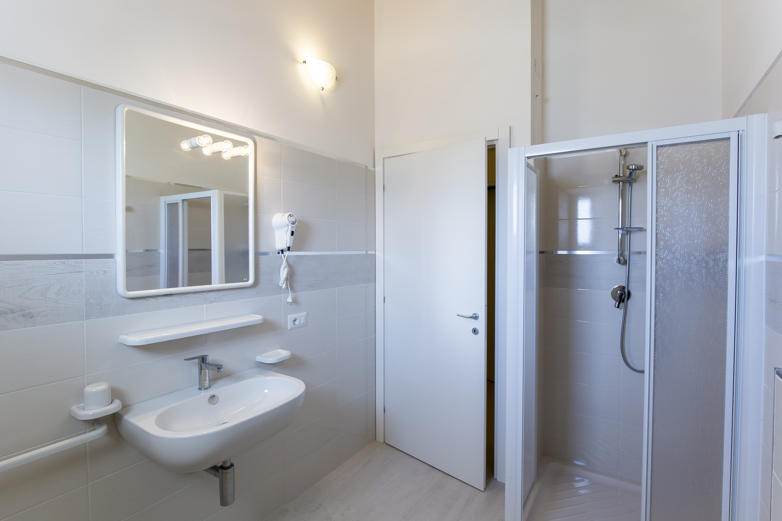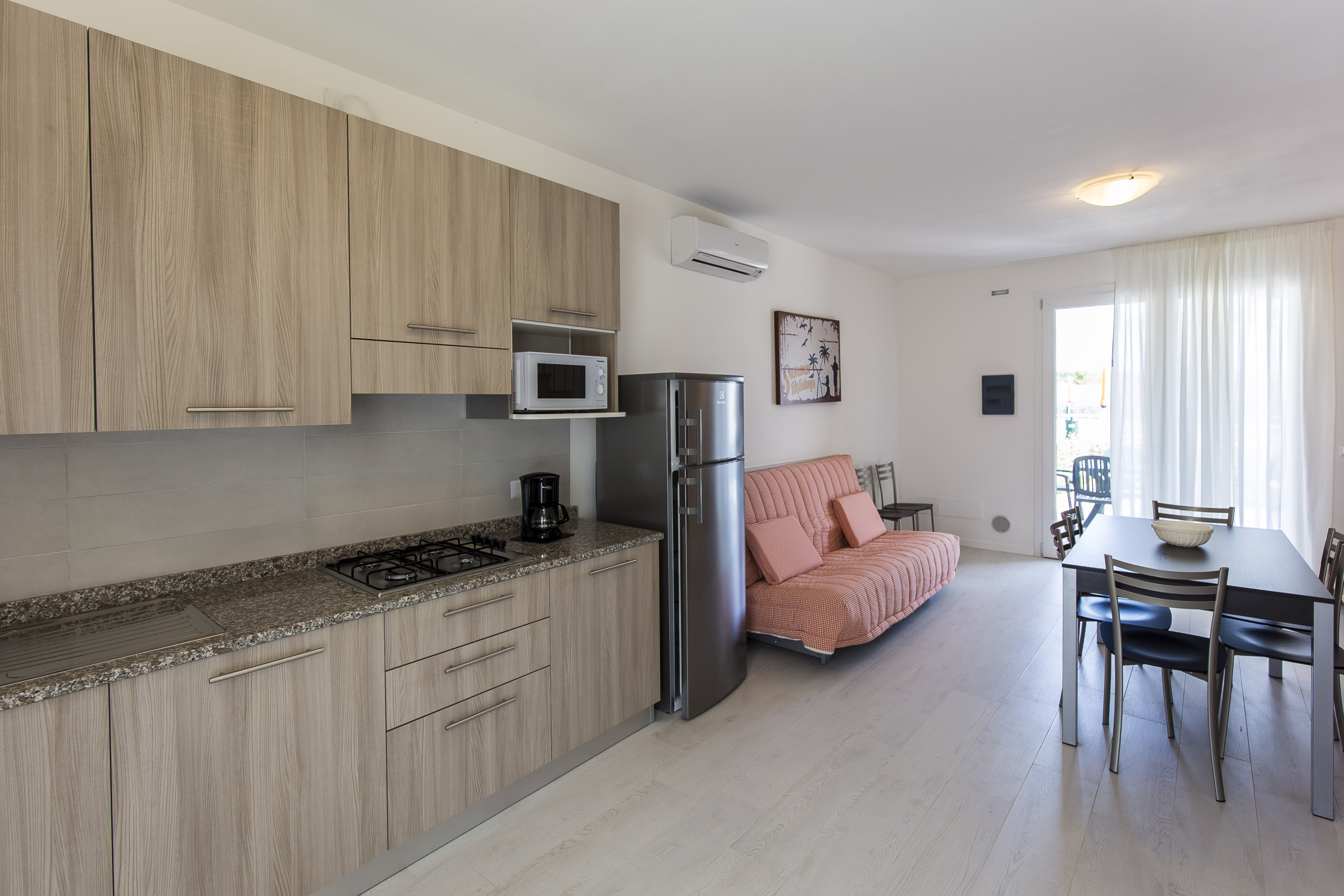 Tutti gli appartamenti si sviluppano su un unico livello e alcuni offrono la vista sulla piscina e altri con vista lateralmente. Il soggiorno dispone di angolo cottura attrezzato, tavolo, sedie e divano letto matrimoniale alla francese, con accesso al balcone o al giardino, ideale per pranzi e cene all’aperto. La camera principale è arredata con letto matrimoniale e letto singolo, mentre la seconda camera offre due letti singoli. Il bagno è spazioso e dotato di box doccia.