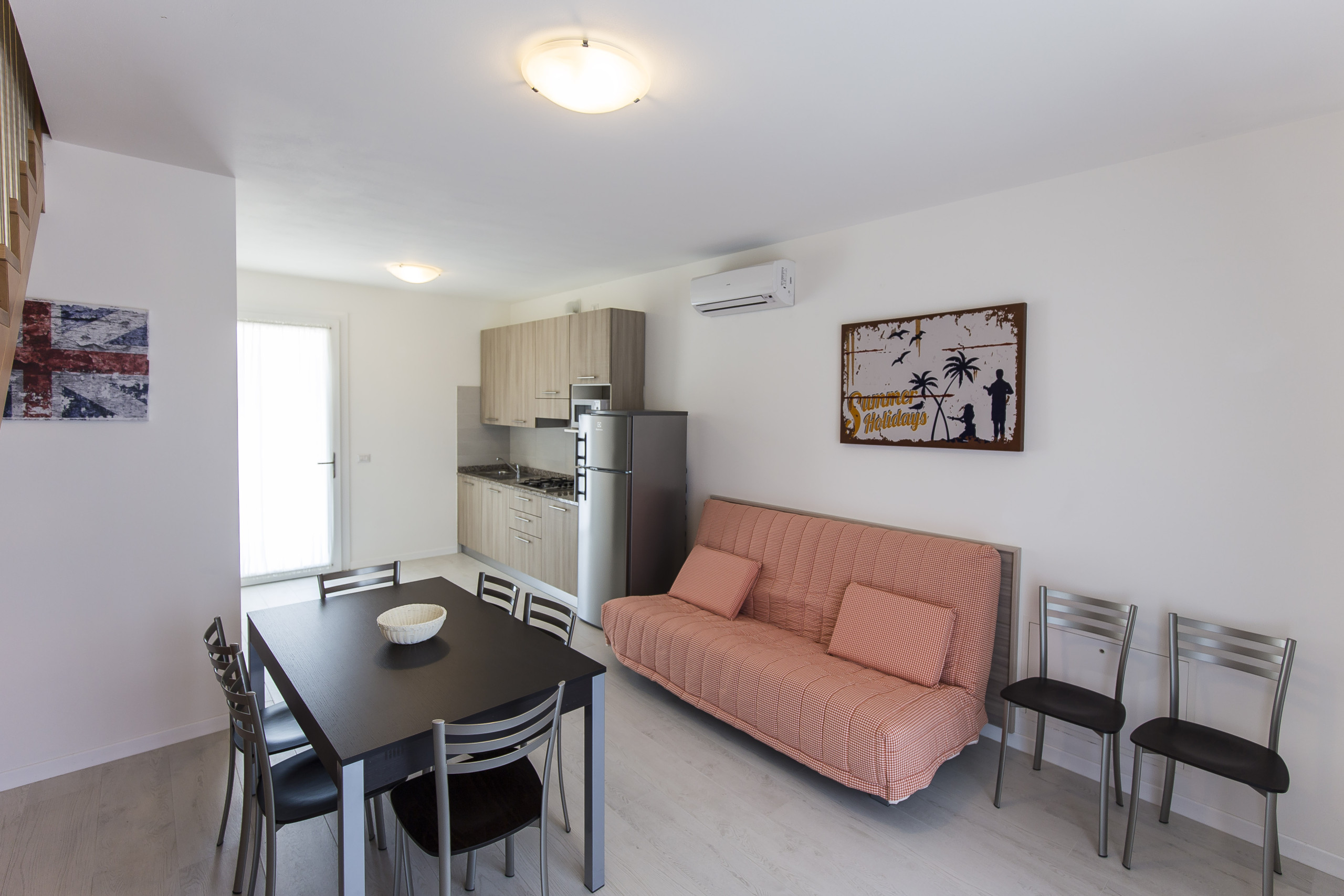 • soggiorno luminoso con angolo cottura attrezzato, tavolo da pranzo, divano letto matrimoniale alla francese e accesso a terrazzo o balcone;