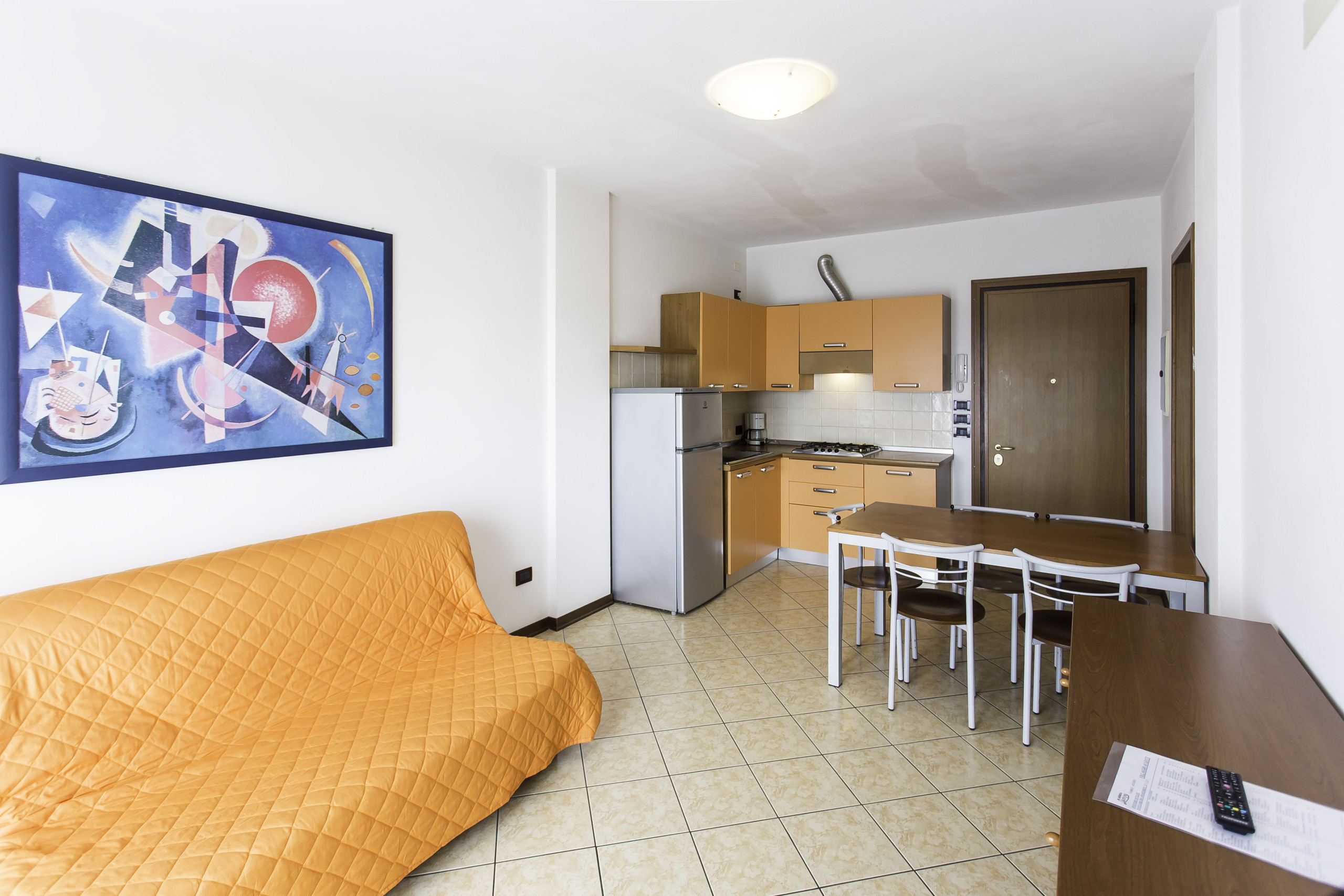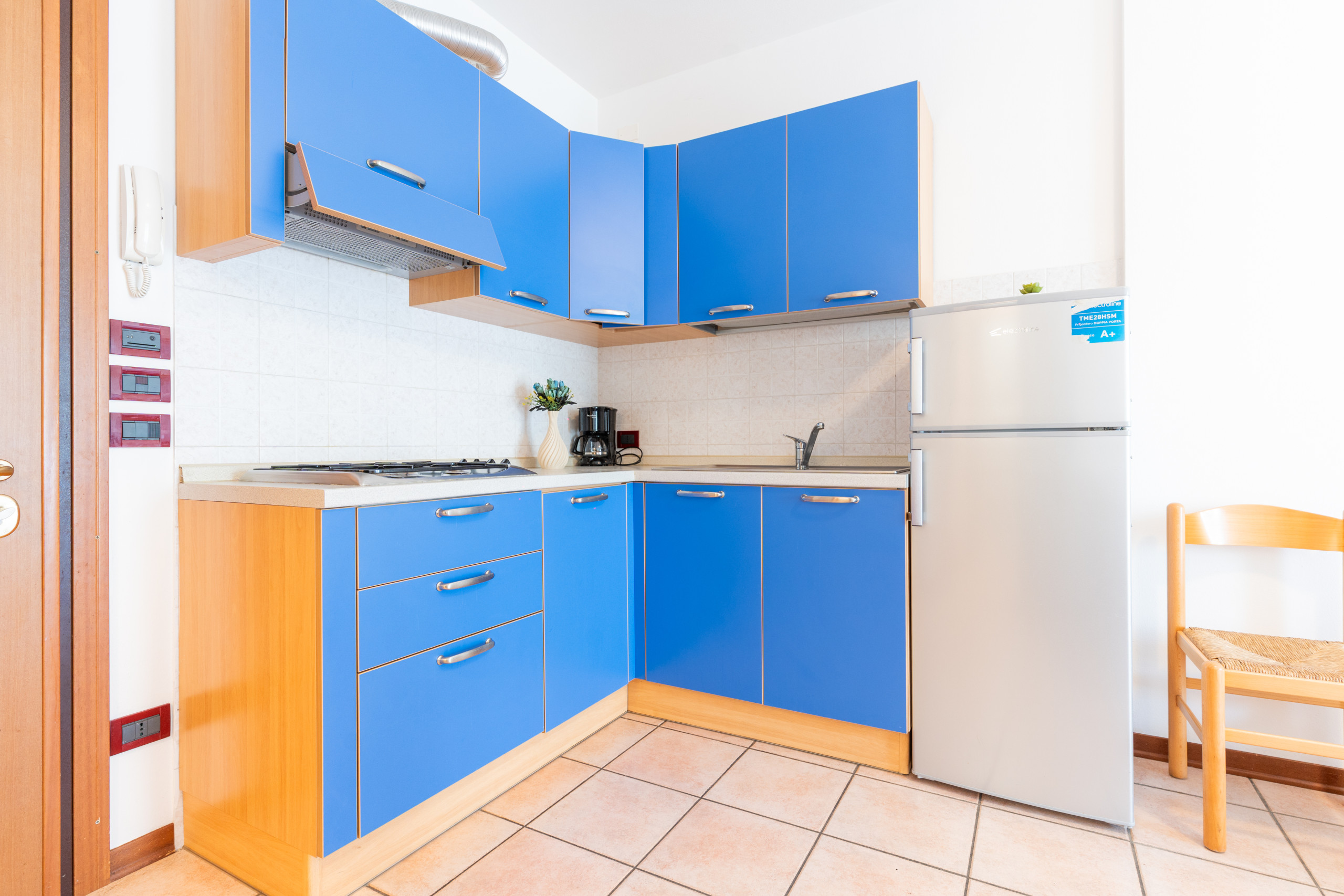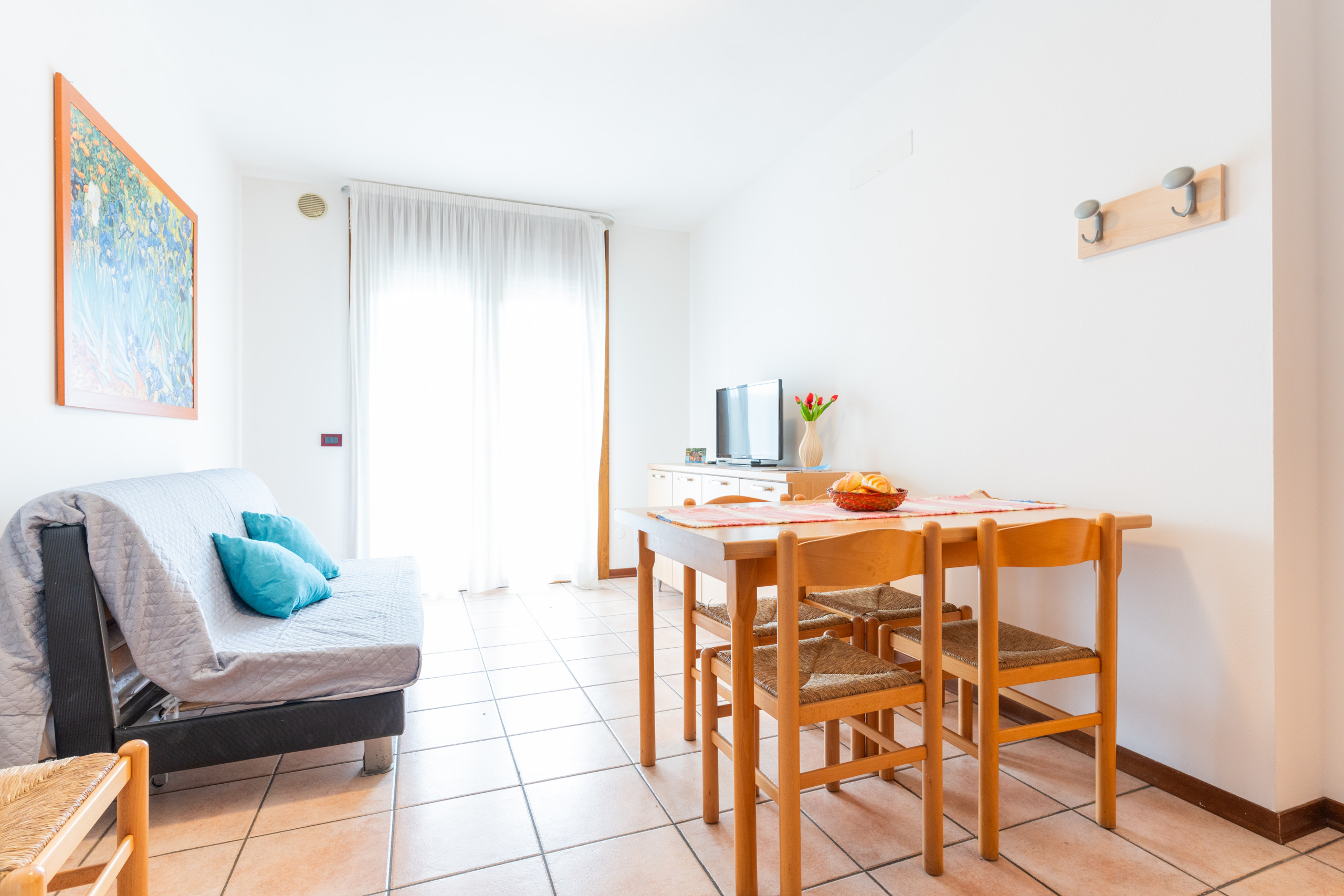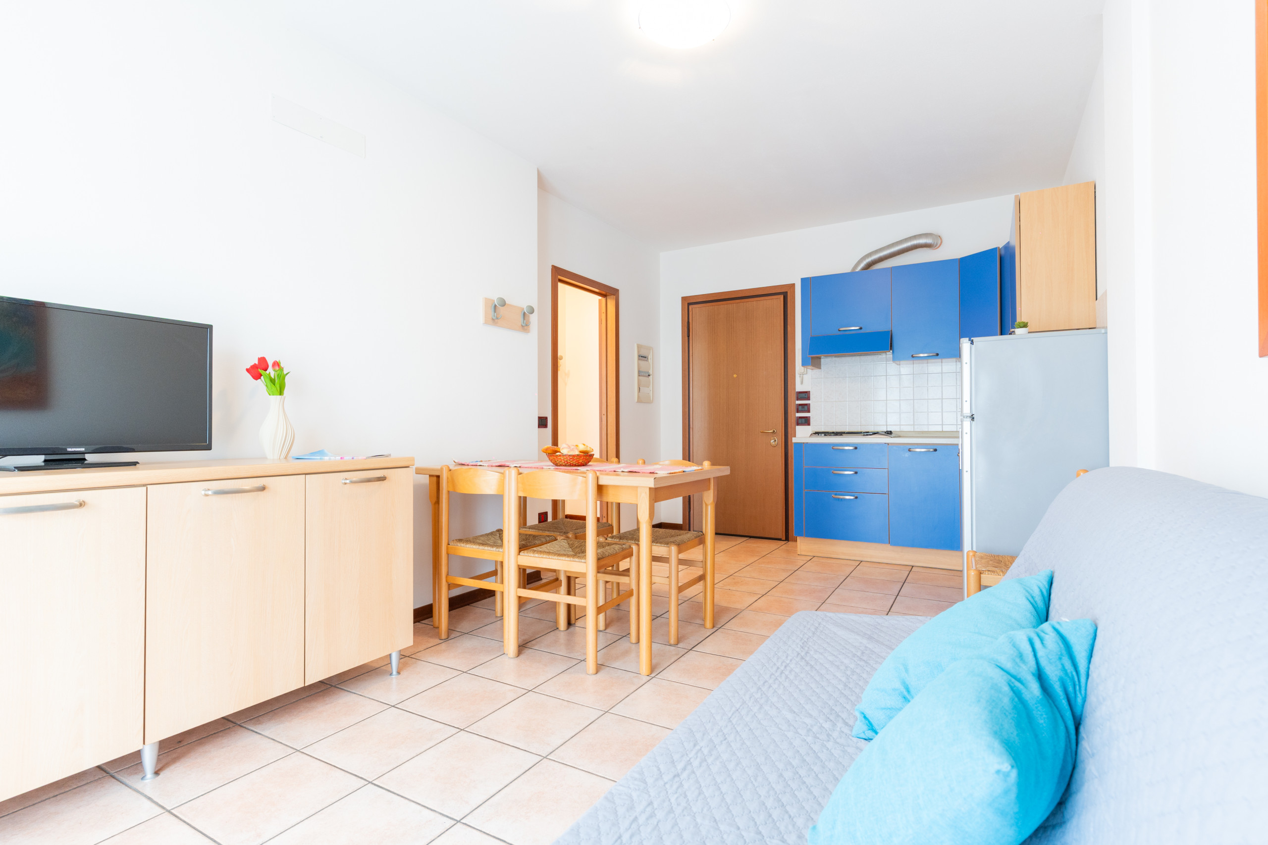 Ogni appartamento presenta un soggiorno accogliente con angolo cottura attrezzato, tavolo, sedie, un divano letto matrimoniale alla francese e un balcone funzionale, perfetto per pranzi e cene all’aperto. Quelli al piano terra sono dotati di uno scoperto esterno piastrellato o di un giardino privato.