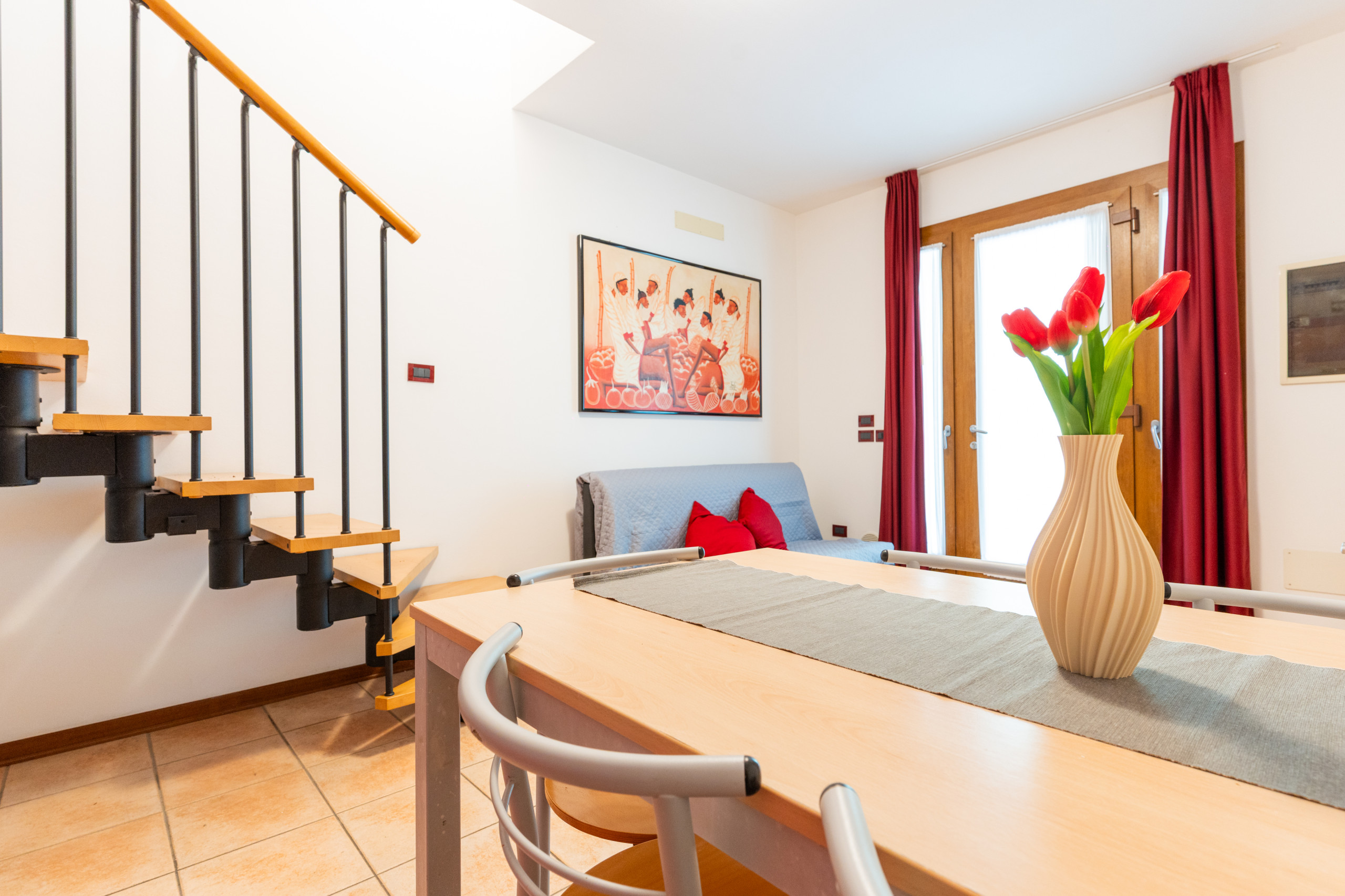 Al piano terra, si trova un soggiorno con angolo cottura e un divano letto matrimoniale alla francese, creando un ambiente pratico e ospitale. Salendo al primo piano tramite scala interna, si accede a una camera da letto con balcone, dotata di letto matrimoniale e letto singolo, oltre a un ampio bagno con box doccia.