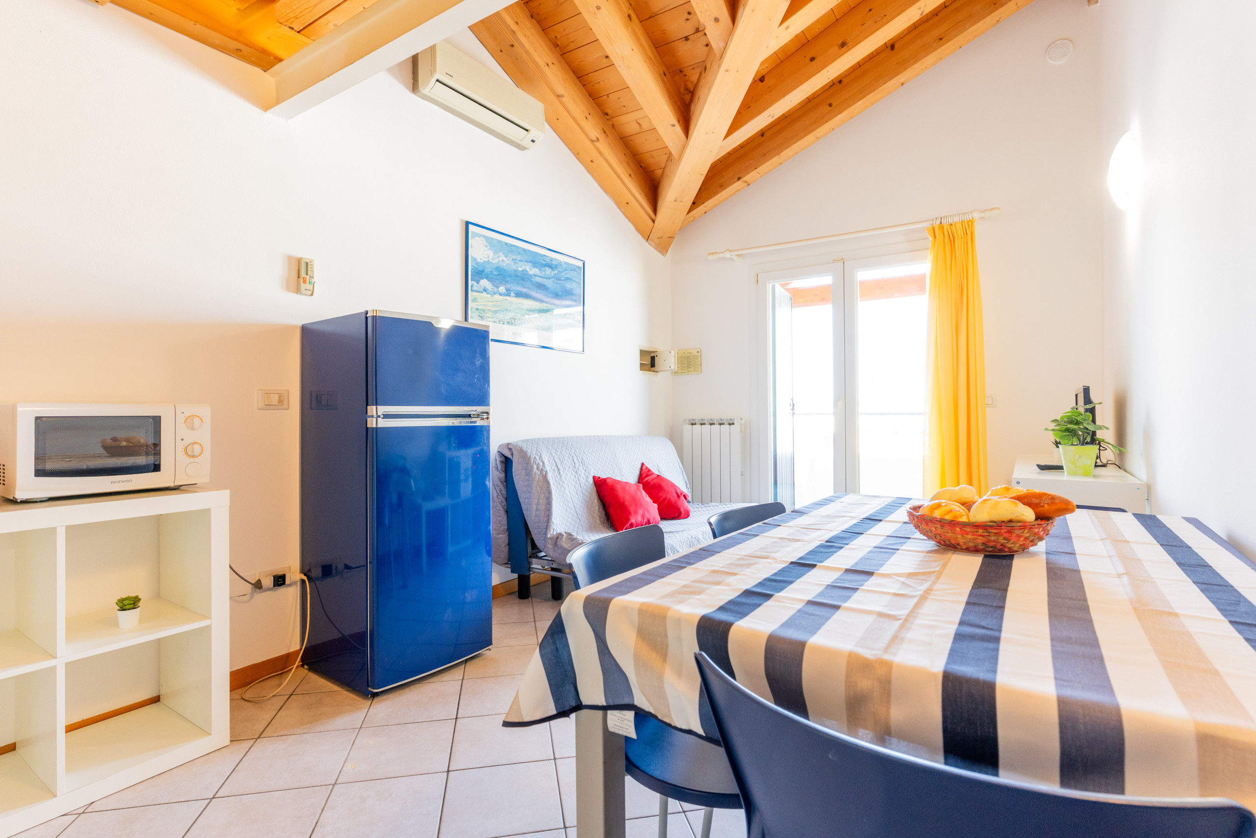 L'appartamento disposto su due piani con scala interna, dispone di un'ampia camera da letto con un letto matrimoniale queen size e bagno al primo piano e un divano letto in soggiorno al piano terra, ideale per ospitare comodamente fino a 4 persone. In camera potete trovare unche una cassaforte.