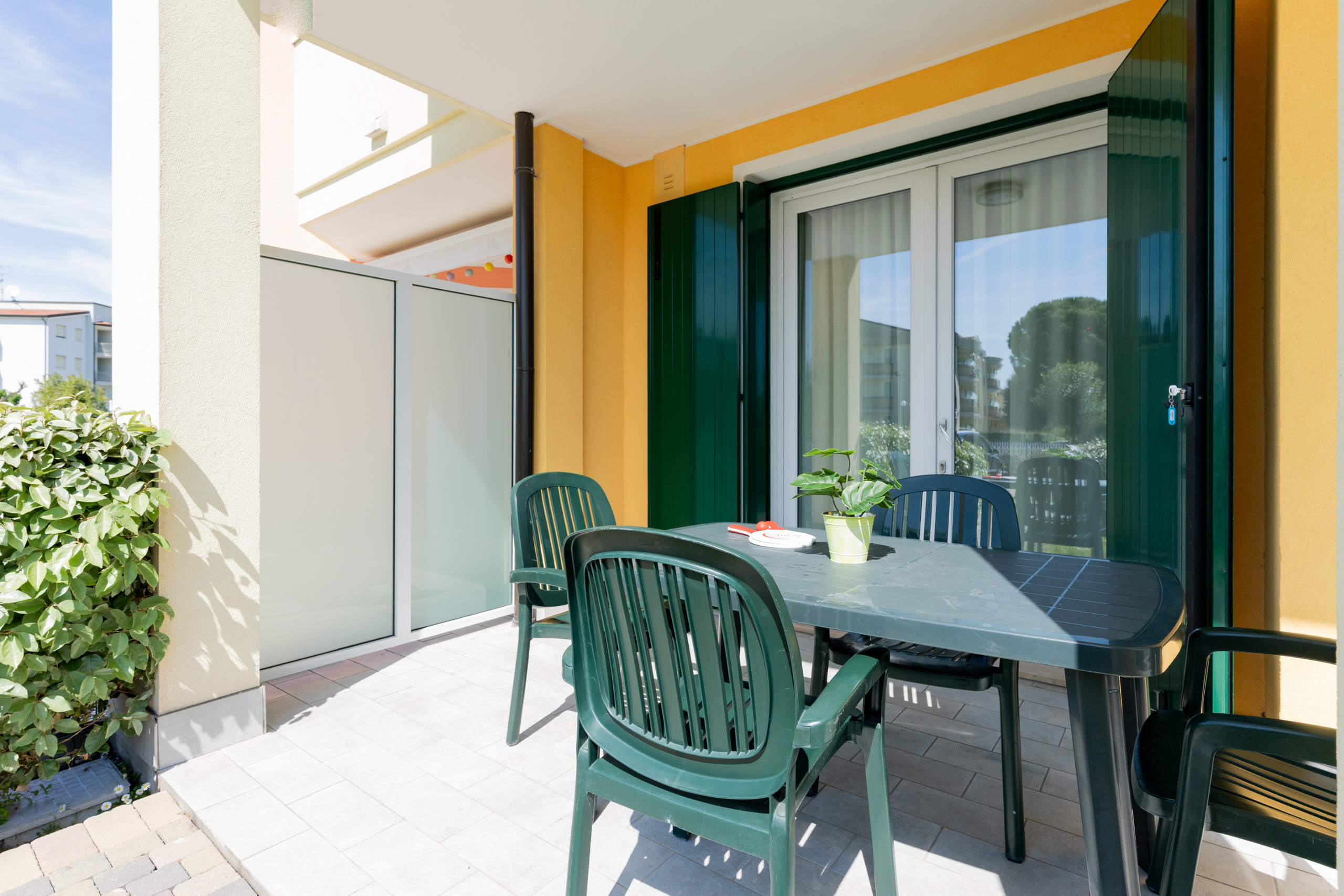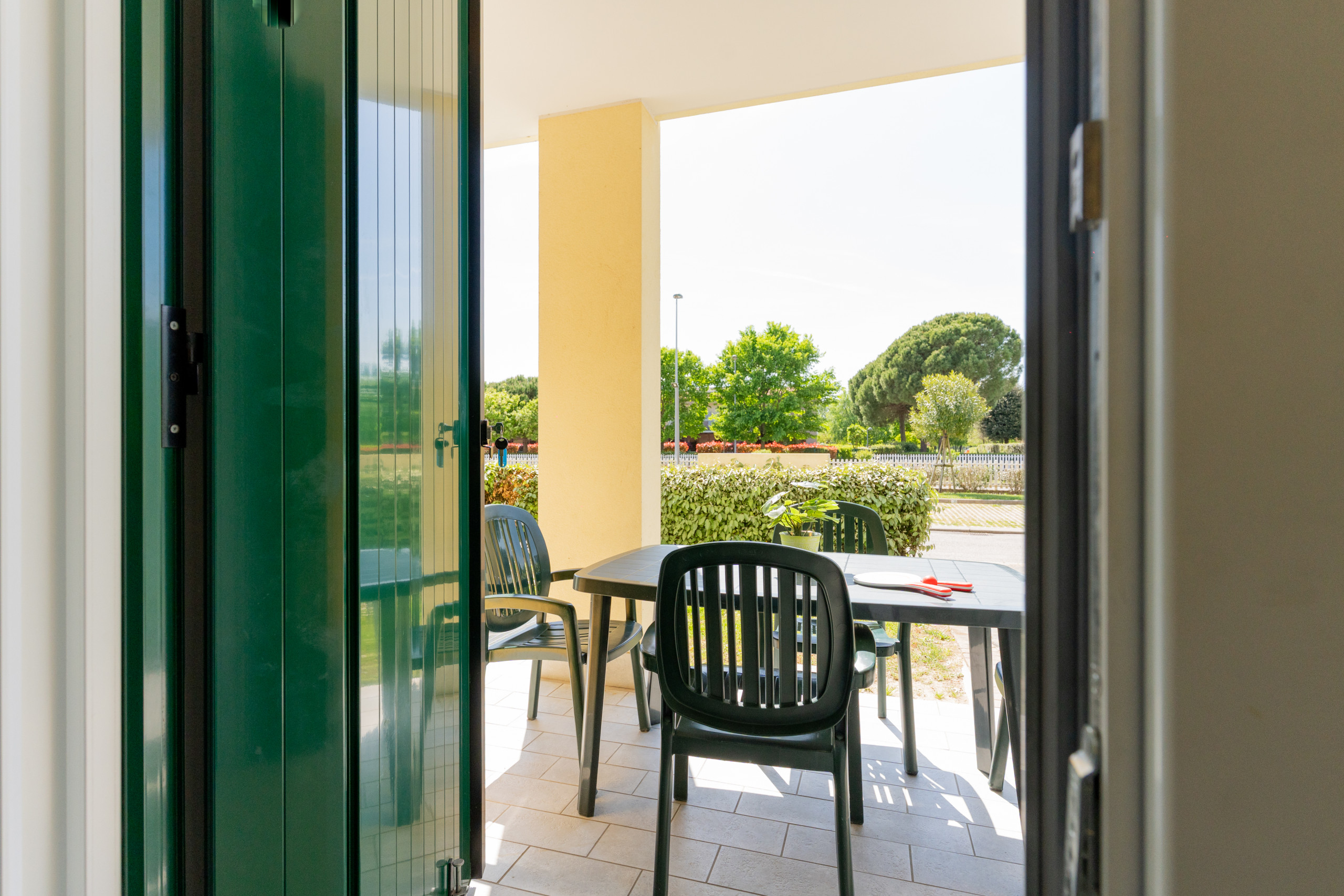 Le villette godono di esposizioni diverse: verso la piscina oppure verso il vialetto interno. Alcune unità dispongono di giardino e portico arredato, altre di solo portico, sempre attrezzato con tavolo e sedie esterne, ideale per pranzi e cene all’aperto.