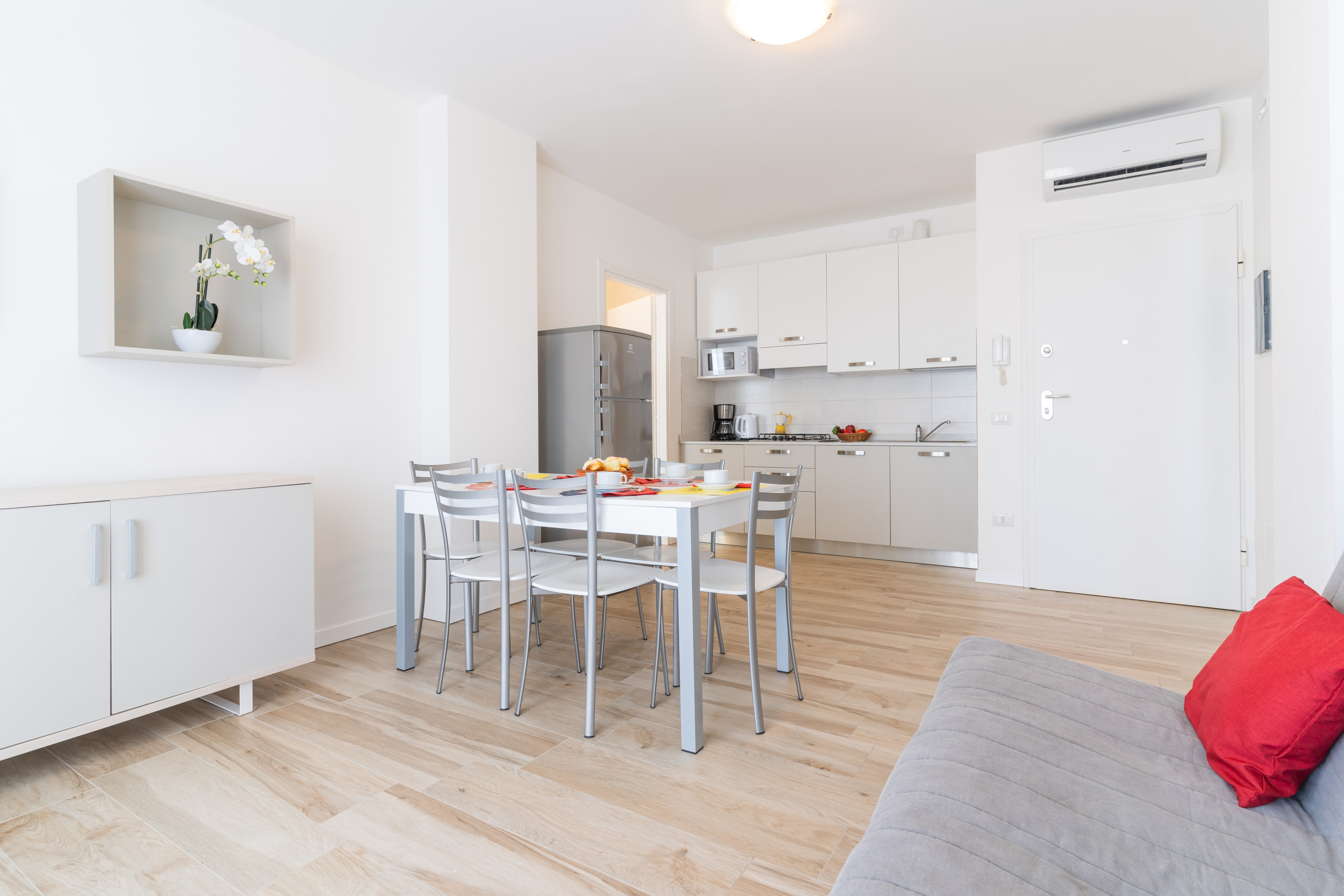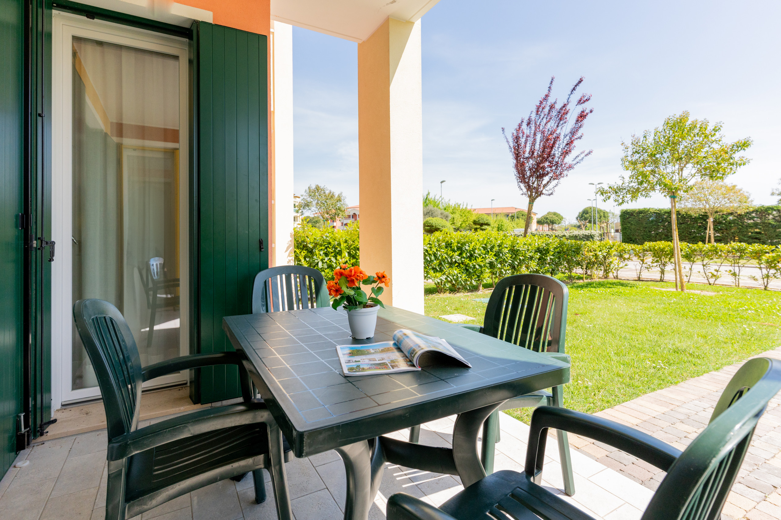 Gli appartamenti trilocali da 55 mq, situati al 1° o 2° piano, dispongono di un ampio balcone arredato con mobili da esterno, perfetto per colazioni, pranzi e cene all’aperto. Le unità sono servite da ascensore, per un accesso ancora più comodo.