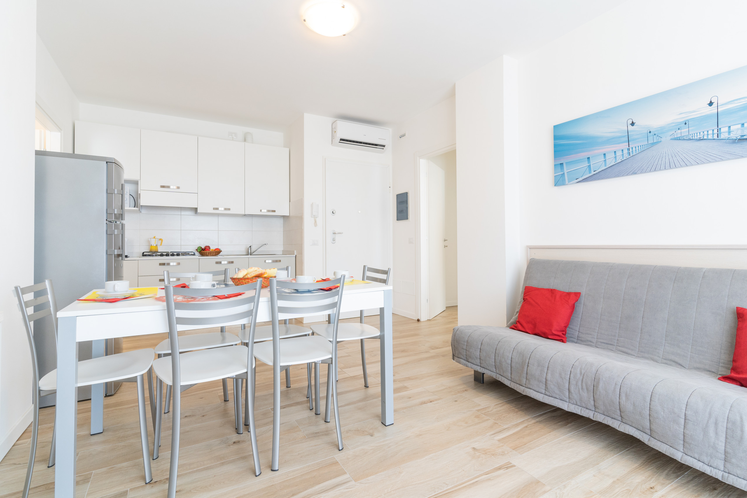 - soggiorno accogliente con angolo cottura attrezzato, tavolo con sedie, divano letto matrimoniale alla francese e accesso diretto al balcone arredato;