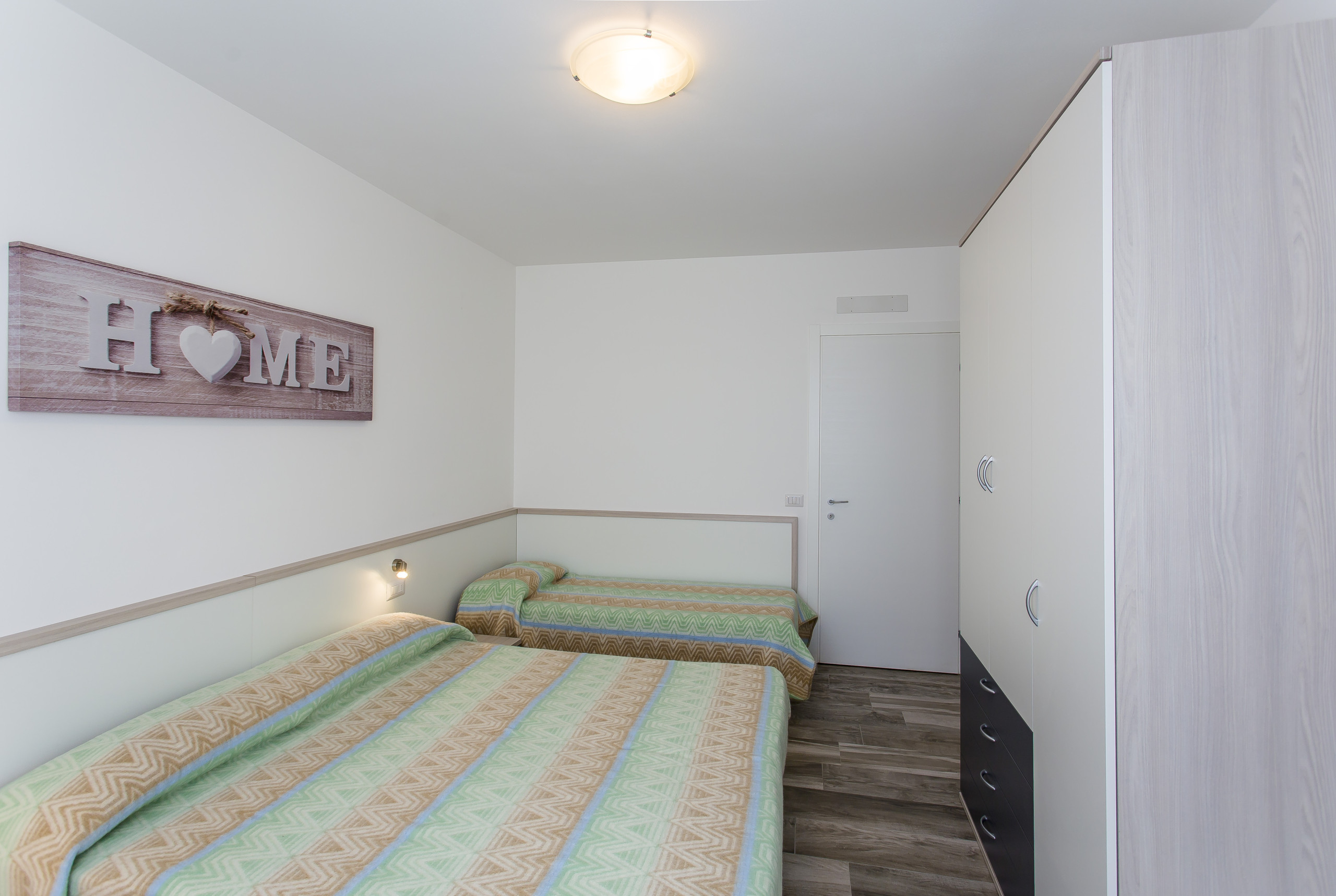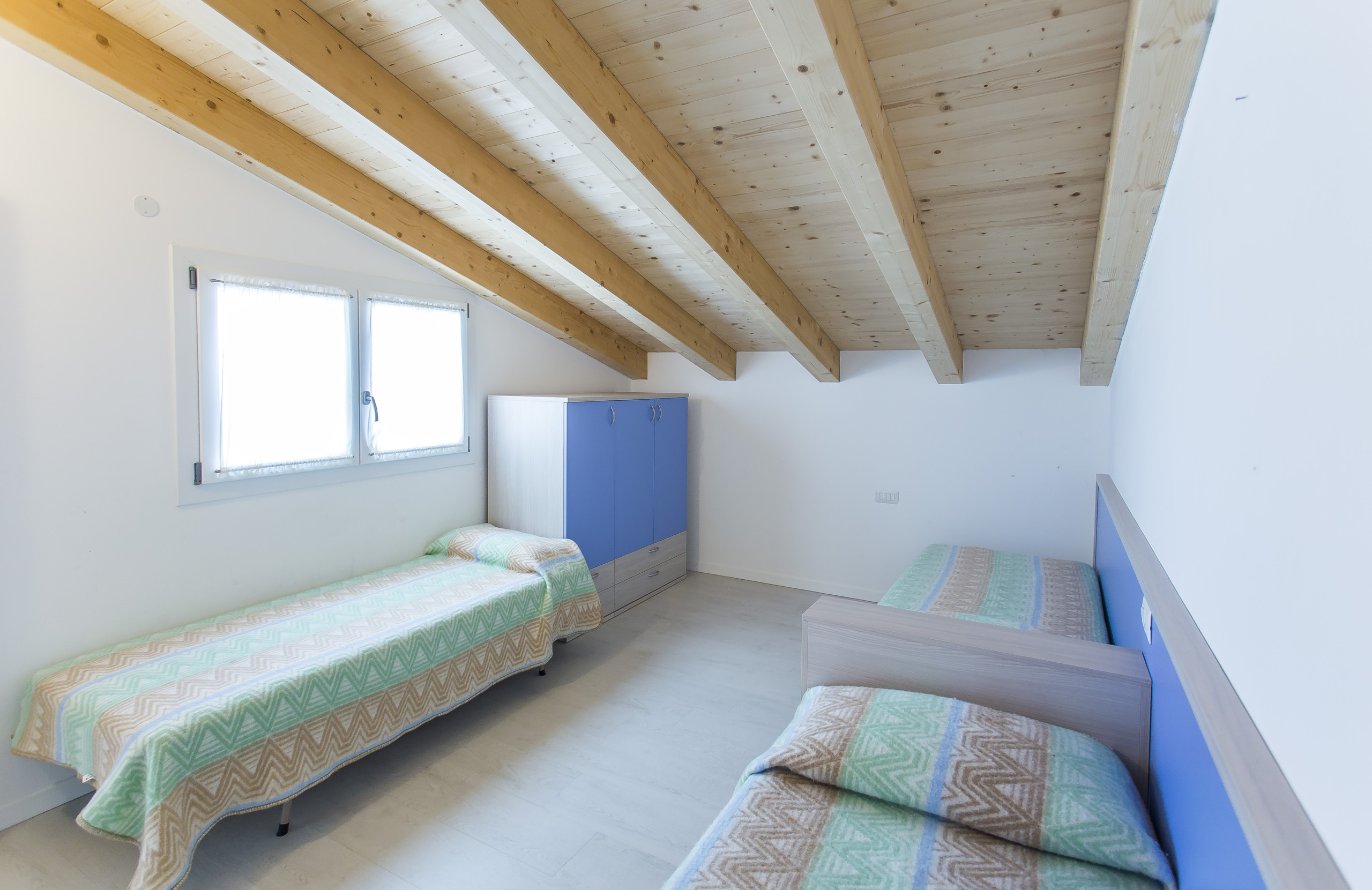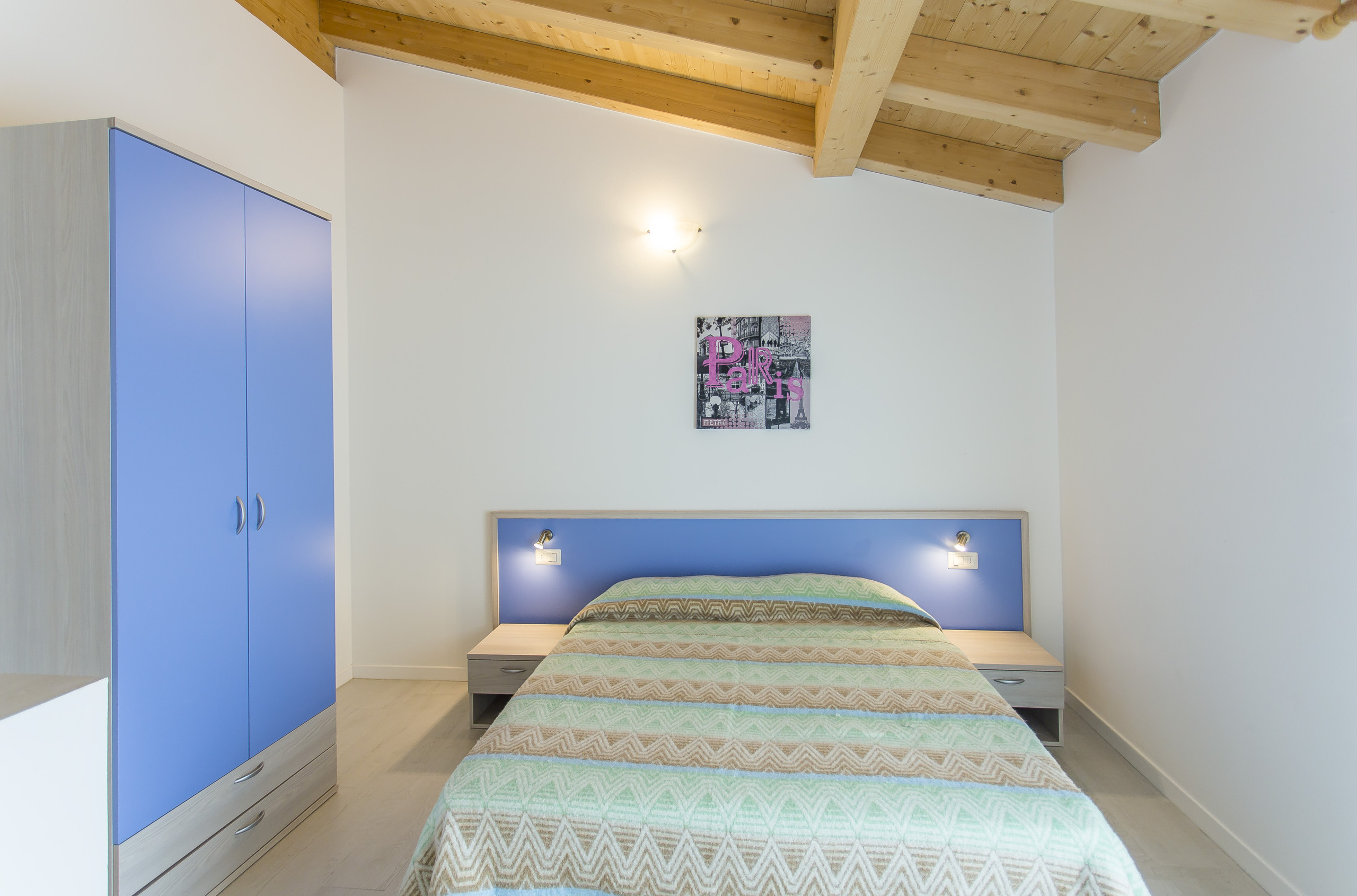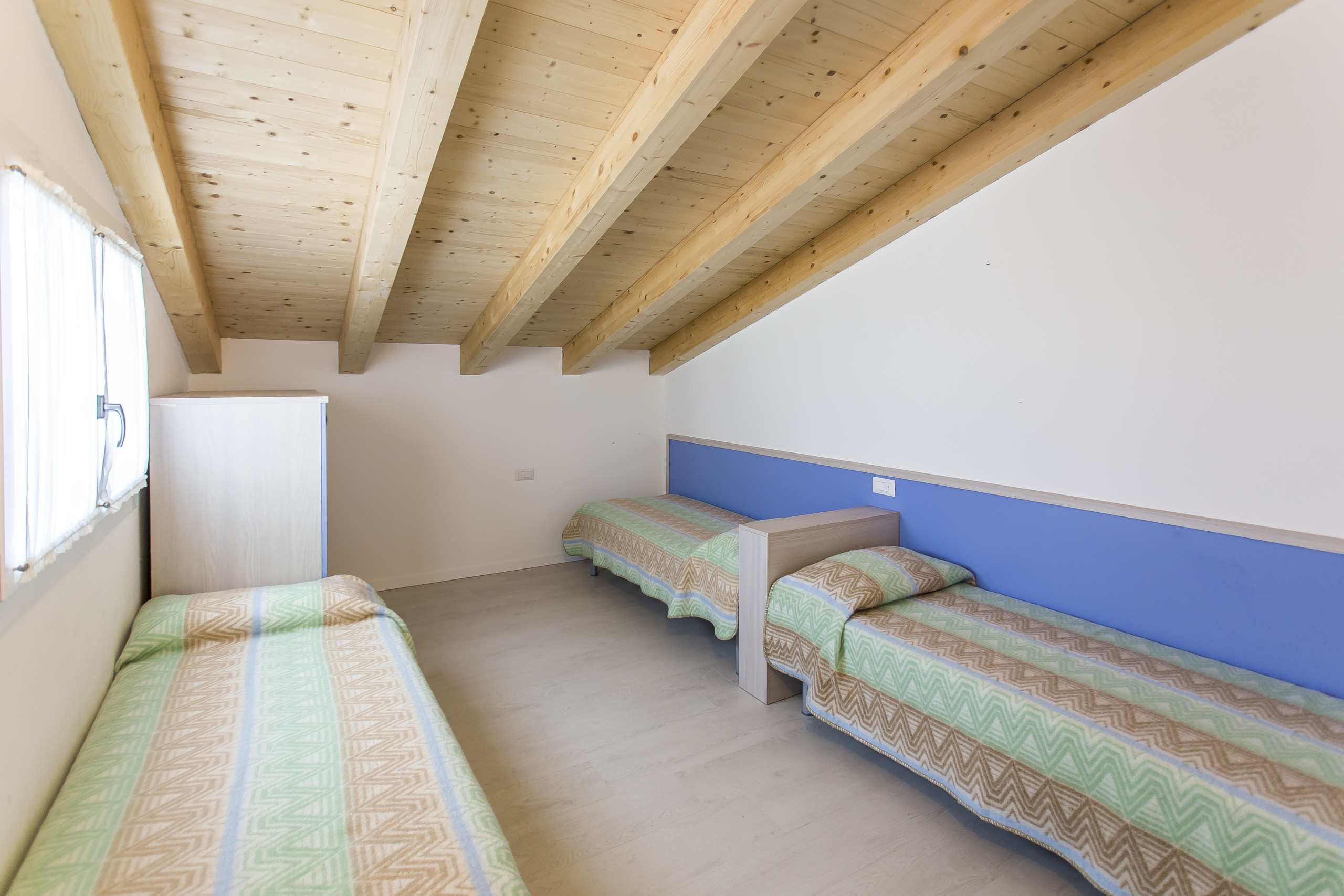 Al piano superiore si trova un’ulteriore camera con due/tre letti singoli o un letto matrimoniale e un secondo bagno con doccia. Ogni appartamento dispone di un ampio balcone, perfetto per pranzi e cene all’aperto, con vista sul viale interno o sulla piscina.