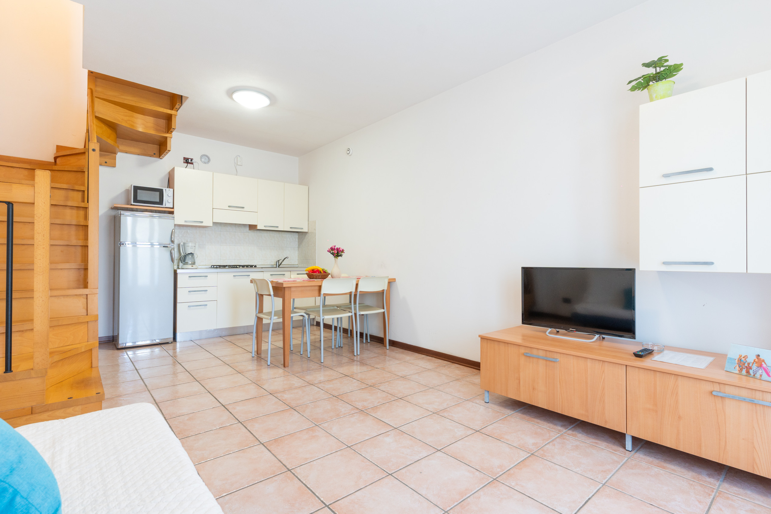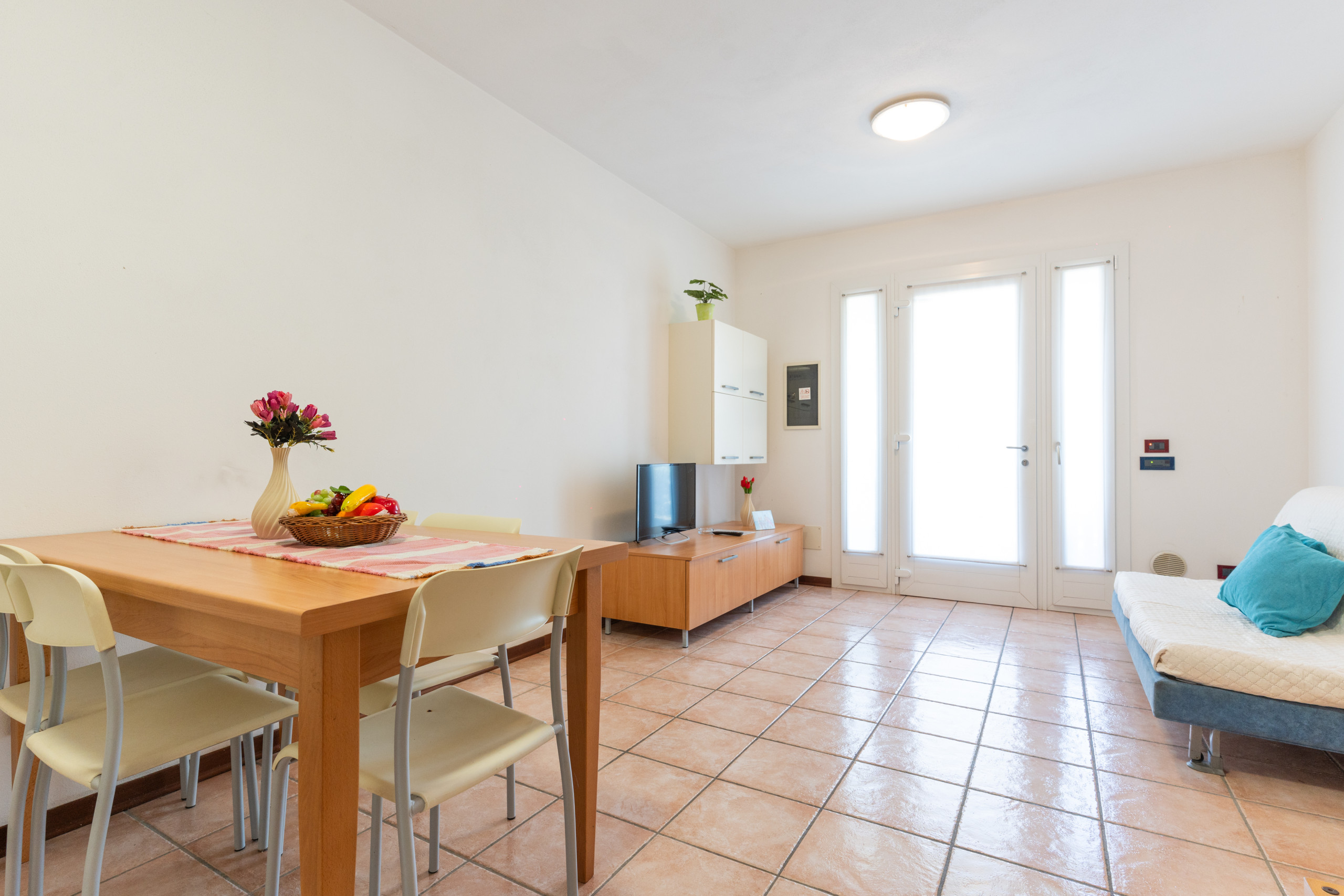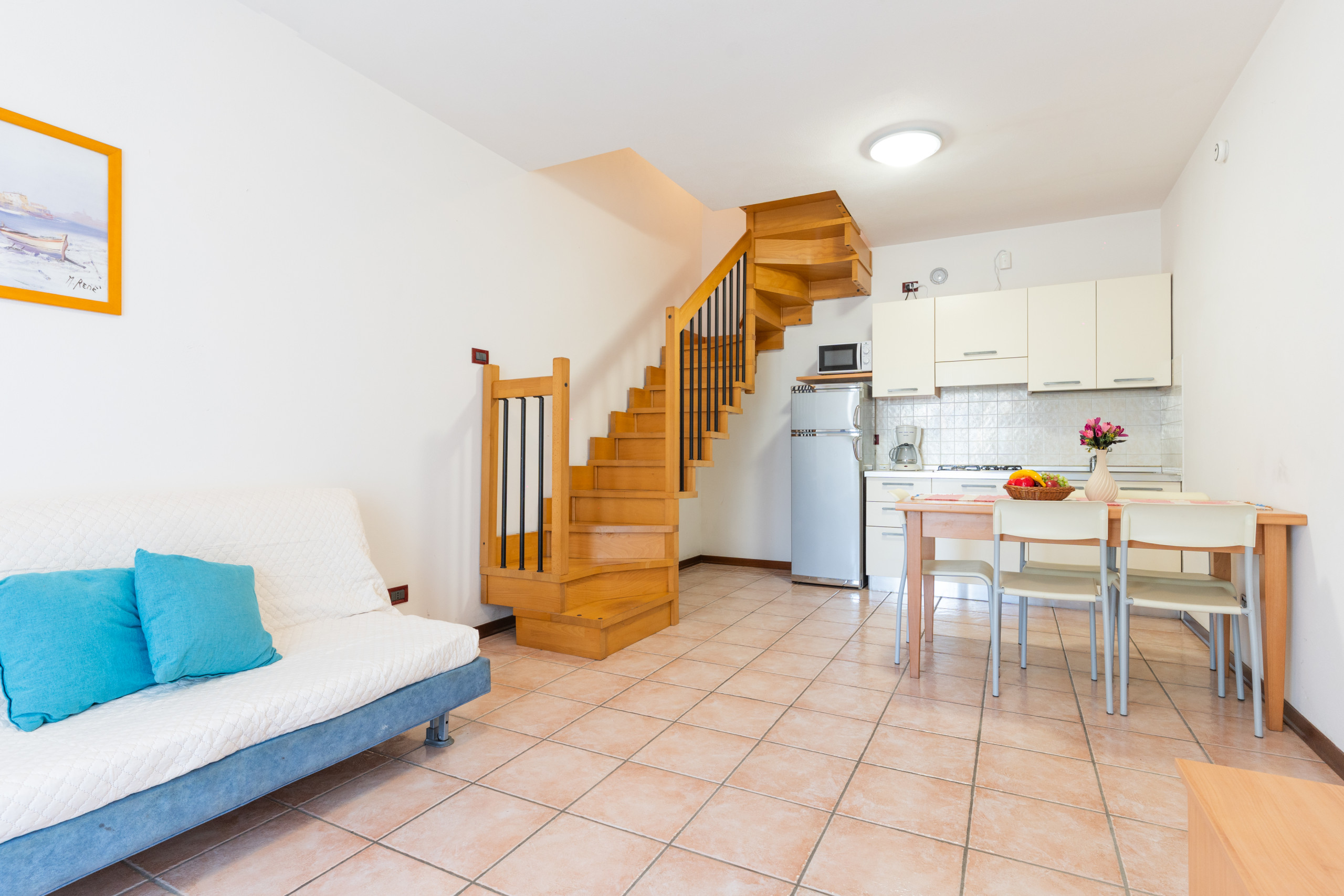 • soggiorno con angolo cottura attrezzato, tavolo da pranzo e divano letto matrimoniale alla francese;