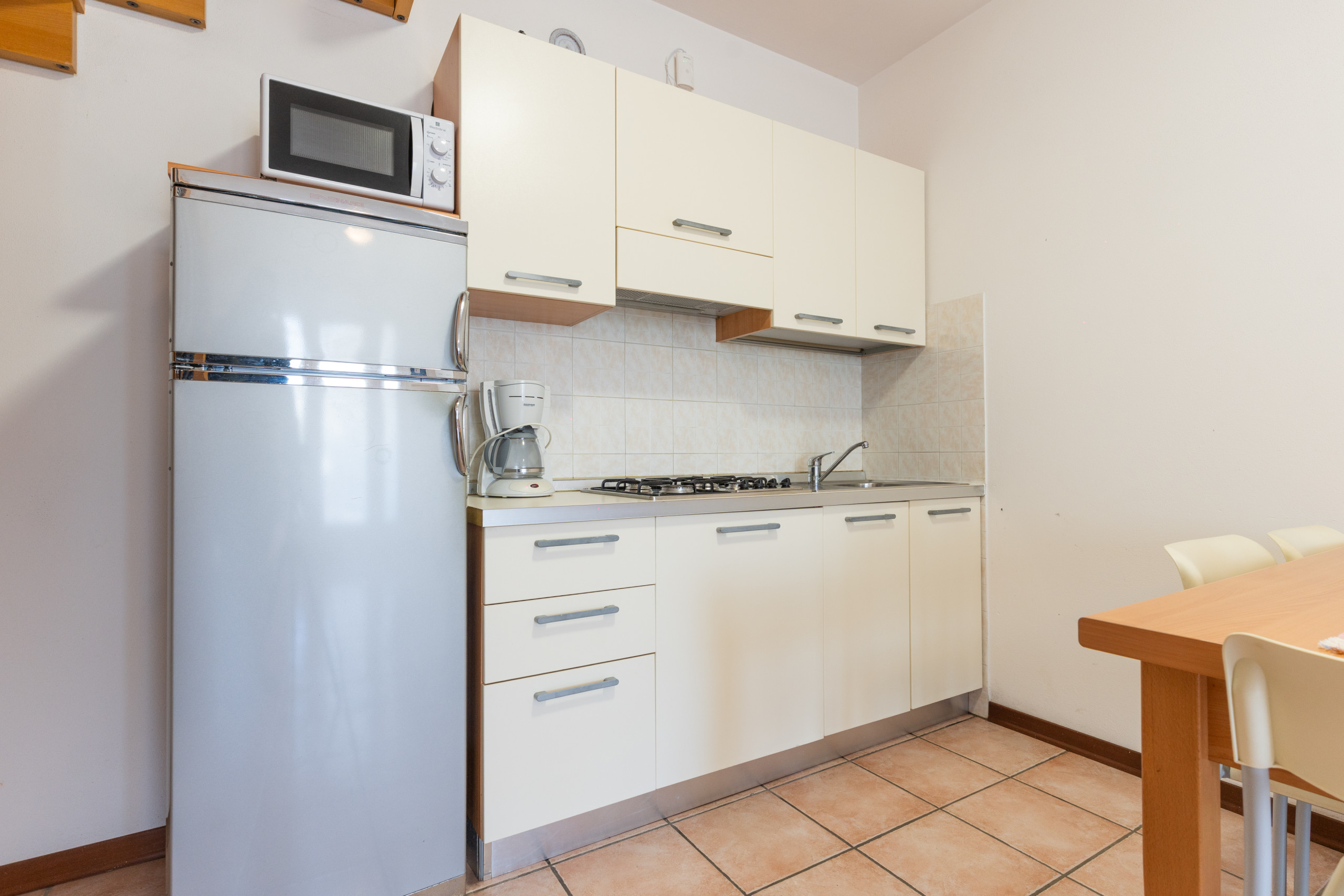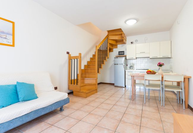 🏡 Le villette bilocali (45 mq), disposte su due piani, sono ideali per famiglie e coppie che desiderano indipendenza e comfort. Al piano terra troverai un giardino privato con terrazza coperta e arredamento da esterno, perfetto per pranzi e cene all’aperto. Le abitazioni si affacciano sulla piscina, sul viale interno o regalano scorci sulla Chiesa di San Benedetto e sul Camping Marelago.