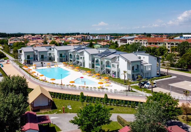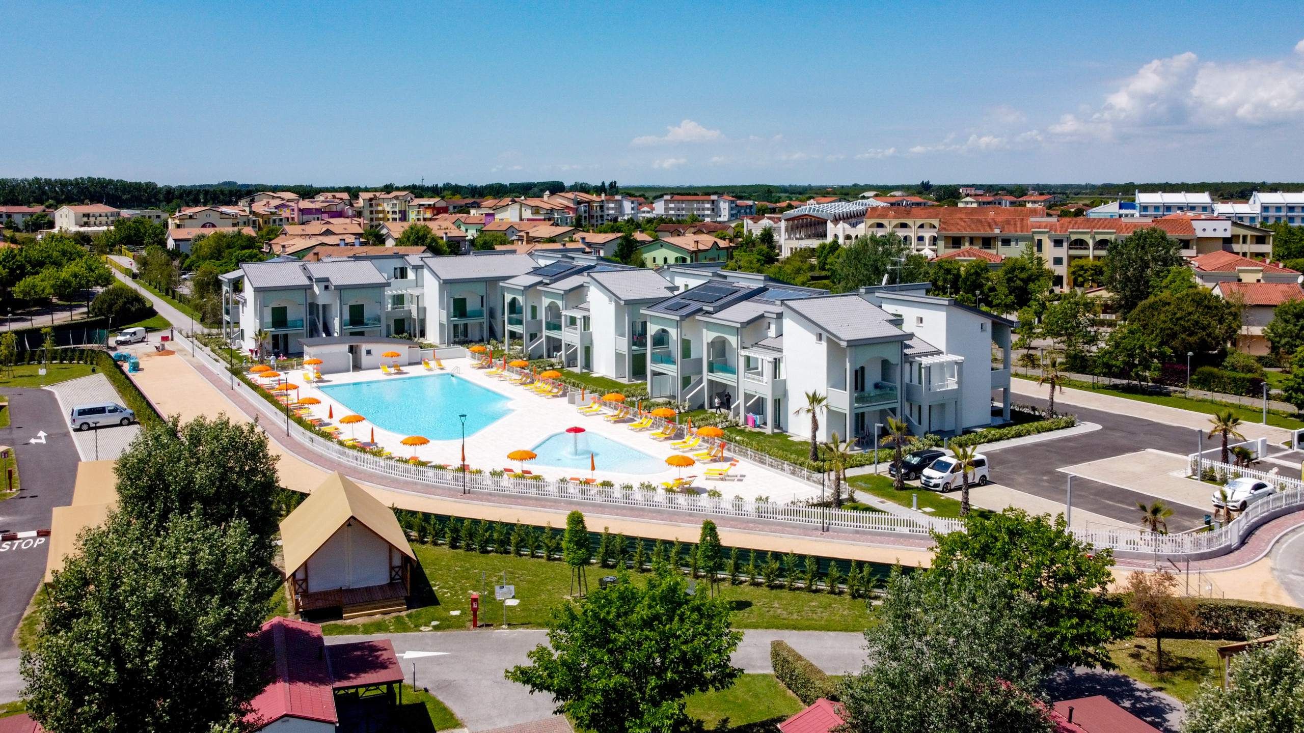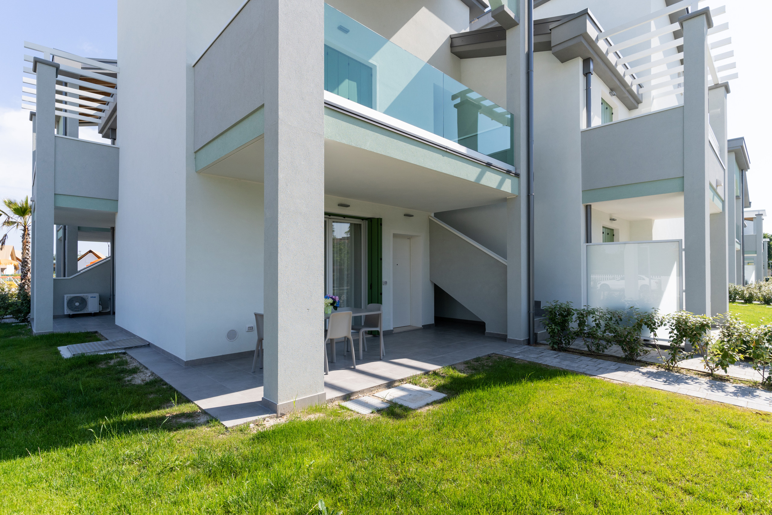 Le villette godono di esposizioni diverse: verso la piscina oppure verso il vialetto interno. Alcune unità dispongono di giardino e portico arredato, altre di solo portico, sempre attrezzato con tavolo e sedie esterne, ideale per pranzi e cene all’aperto.