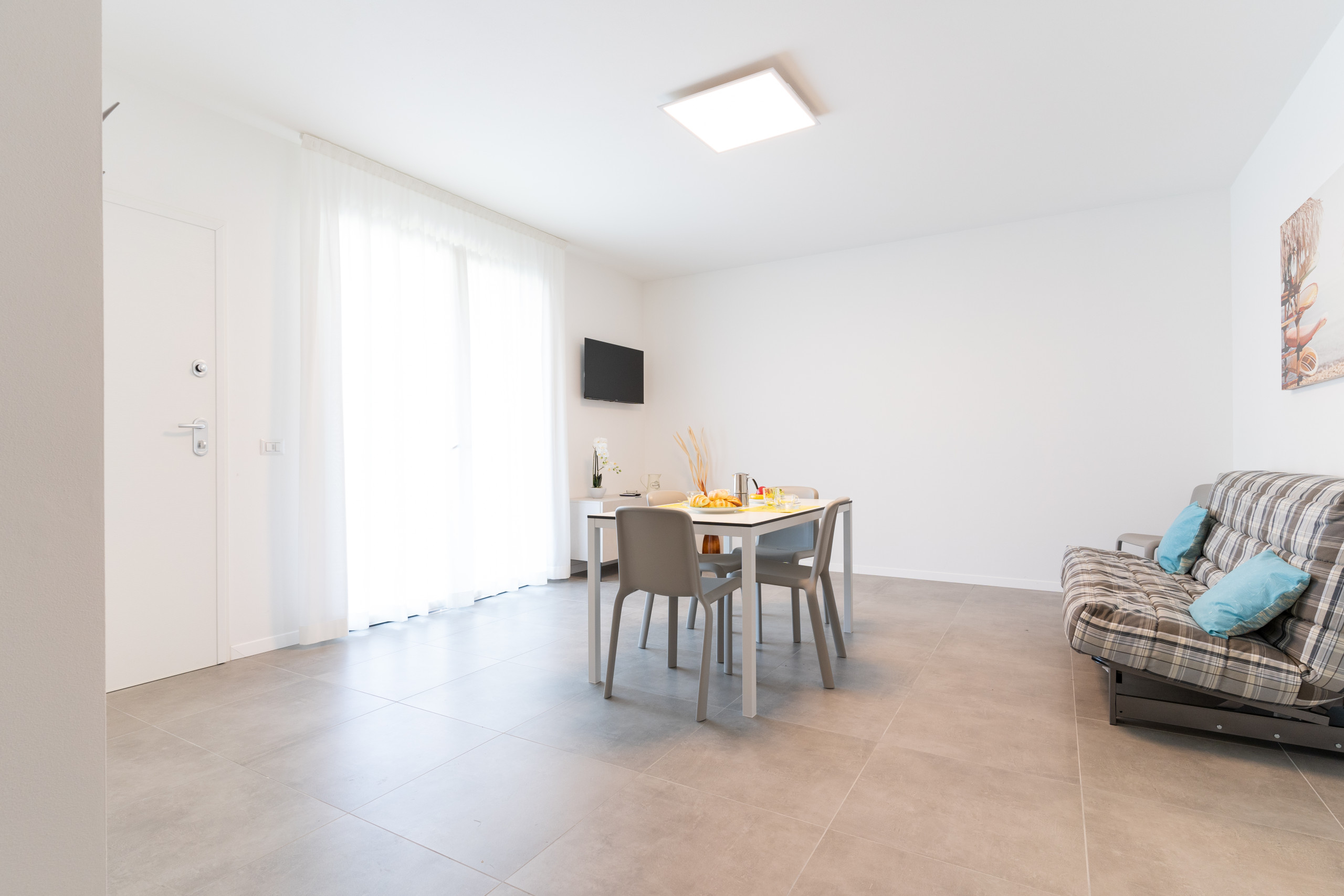 - Soggiorno con angolo cottura attrezzato (lavastoviglie, microonde, frigo a colonna, bollitore), tavolo con sedie e divano letto matrimoniale alla francese.