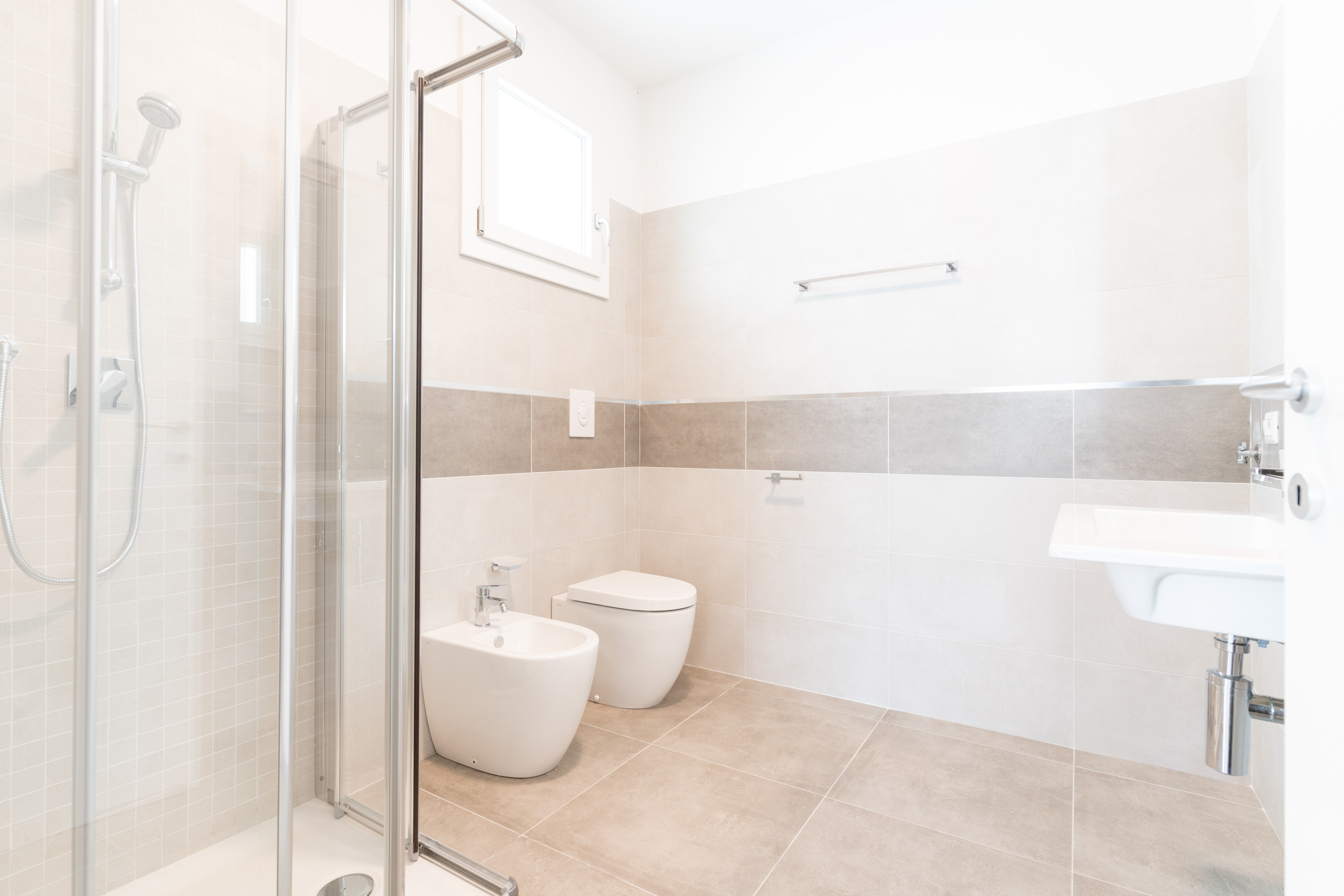 - ampio bagno moderno con grande box doccia e accessori di design.
