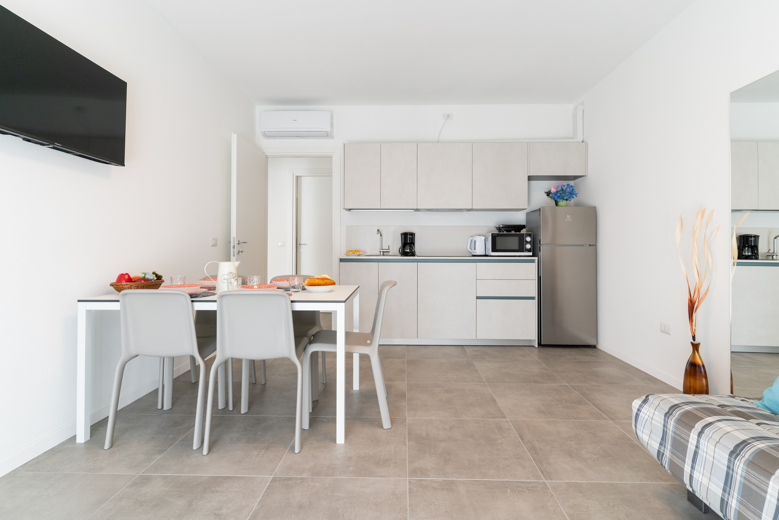 Tutti gli appartamenti si sviluppano su un unico livello e alcuni offrono la vista sulla piscina e altri con vista lateralmente. Il soggiorno dispone di angolo cottura attrezzato, tavolo, sedie e divano letto matrimoniale alla francese, con accesso al balcone o al giardino, ideale per pranzi e cene all’aperto. La camera principale è arredata con letto matrimoniale e letto singolo, mentre la seconda camera offre due letti singoli. Il bagno è spazioso e dotato di box doccia.