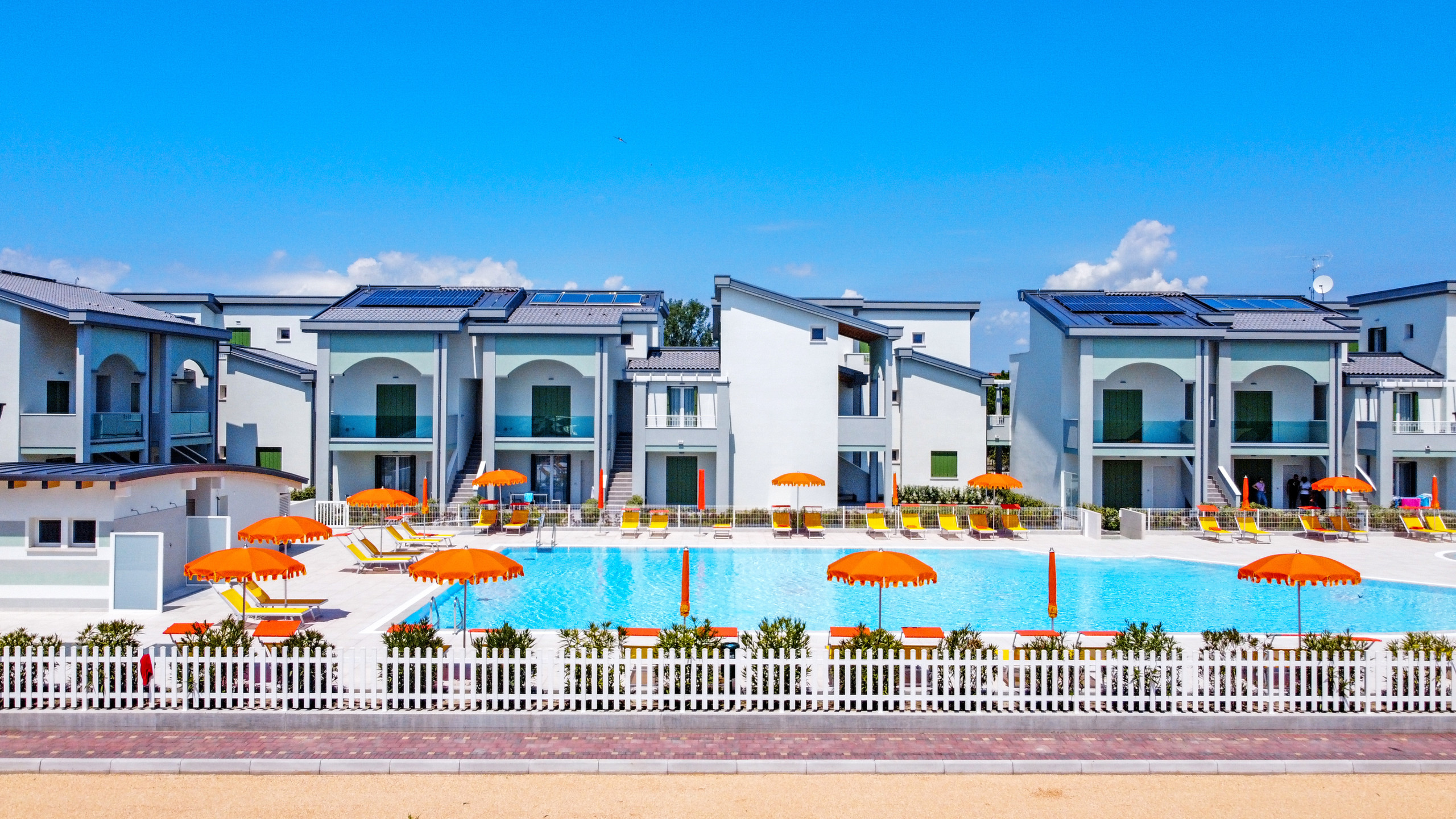 Il villaggio offre ampi giardini comuni con vialetti pedonali, piscina per adulti e piscina dedicata ai bambini, area giochi e zona barbecue. Sono presenti parcheggi scoperti e autorimessa, mentre il Wi-Fi è disponibile gratuitamente nelle aree comuni.