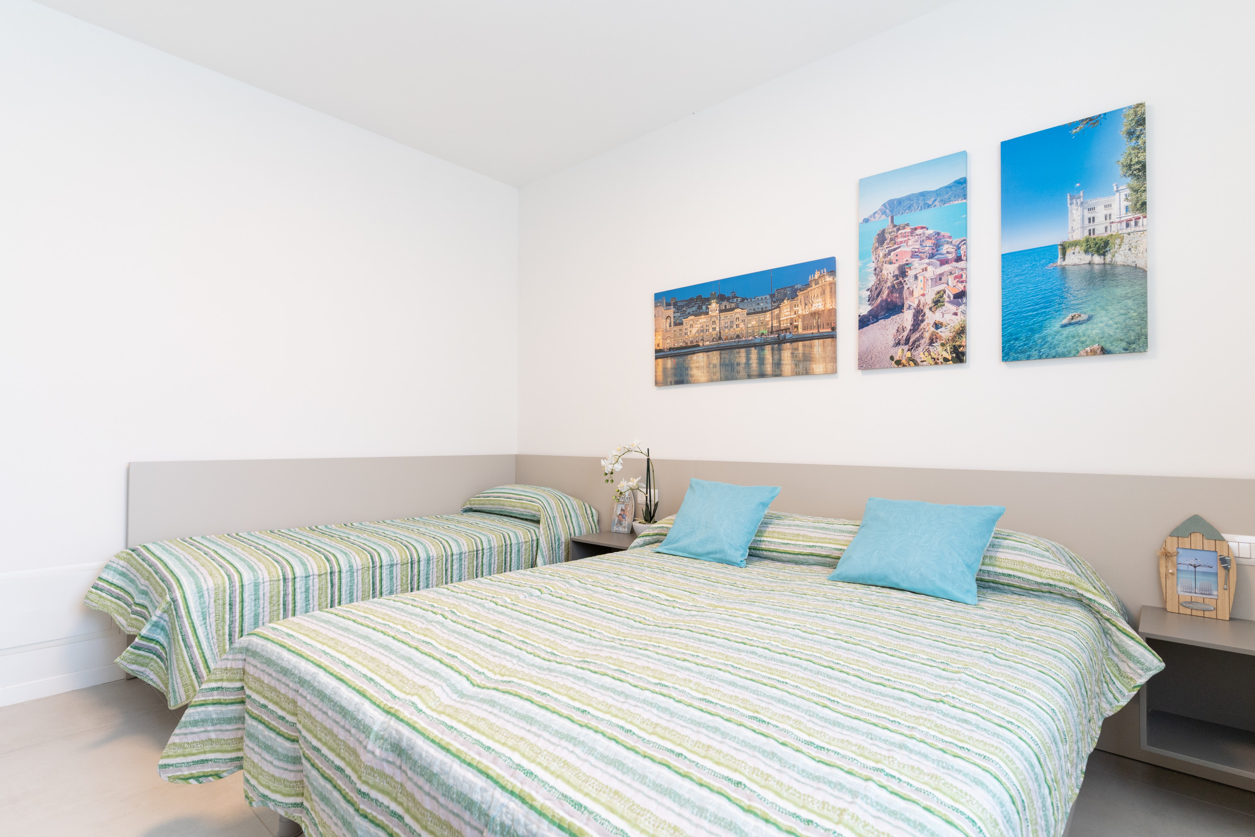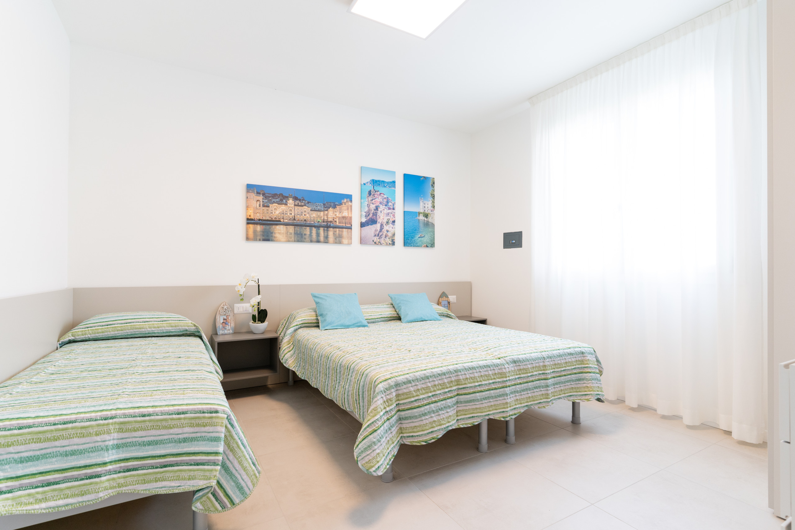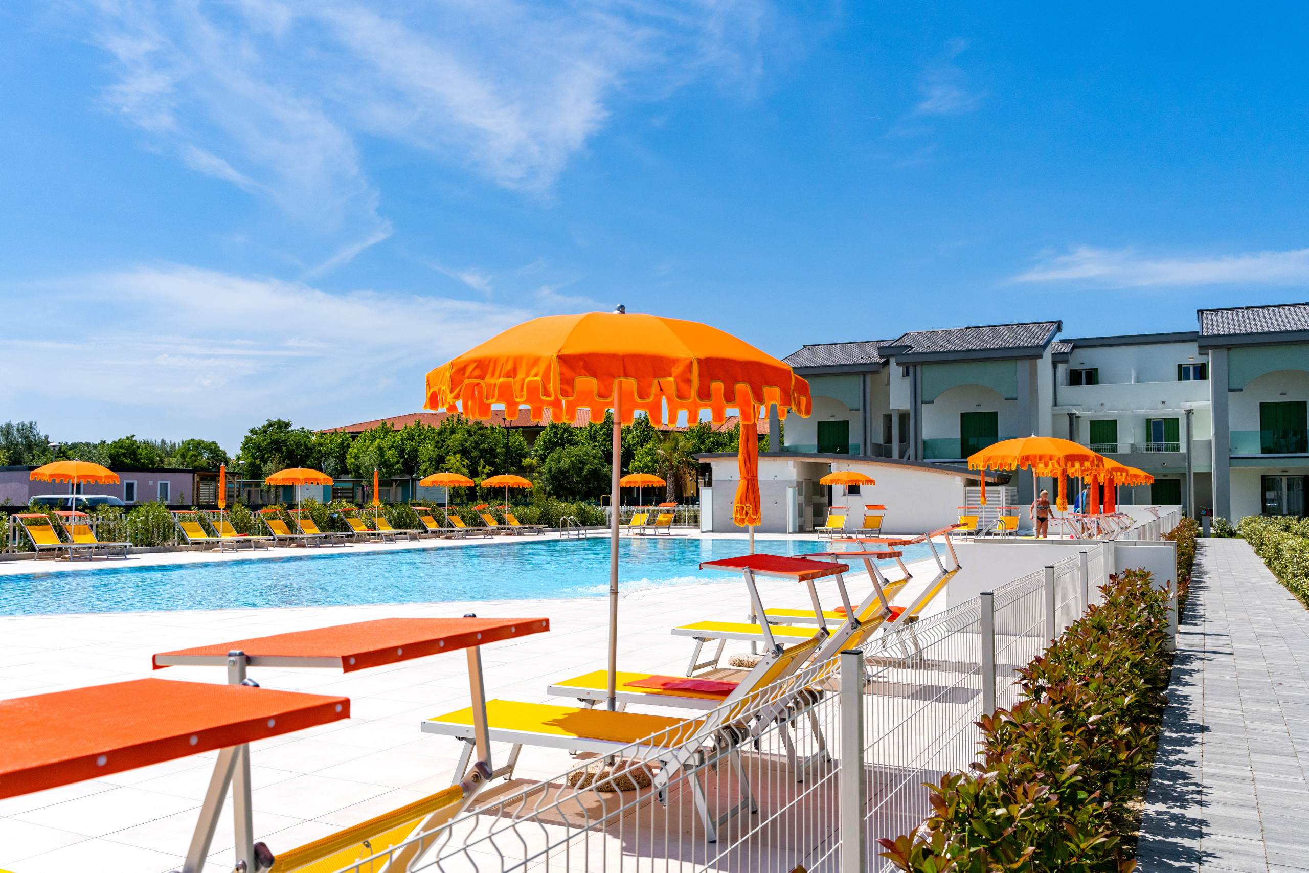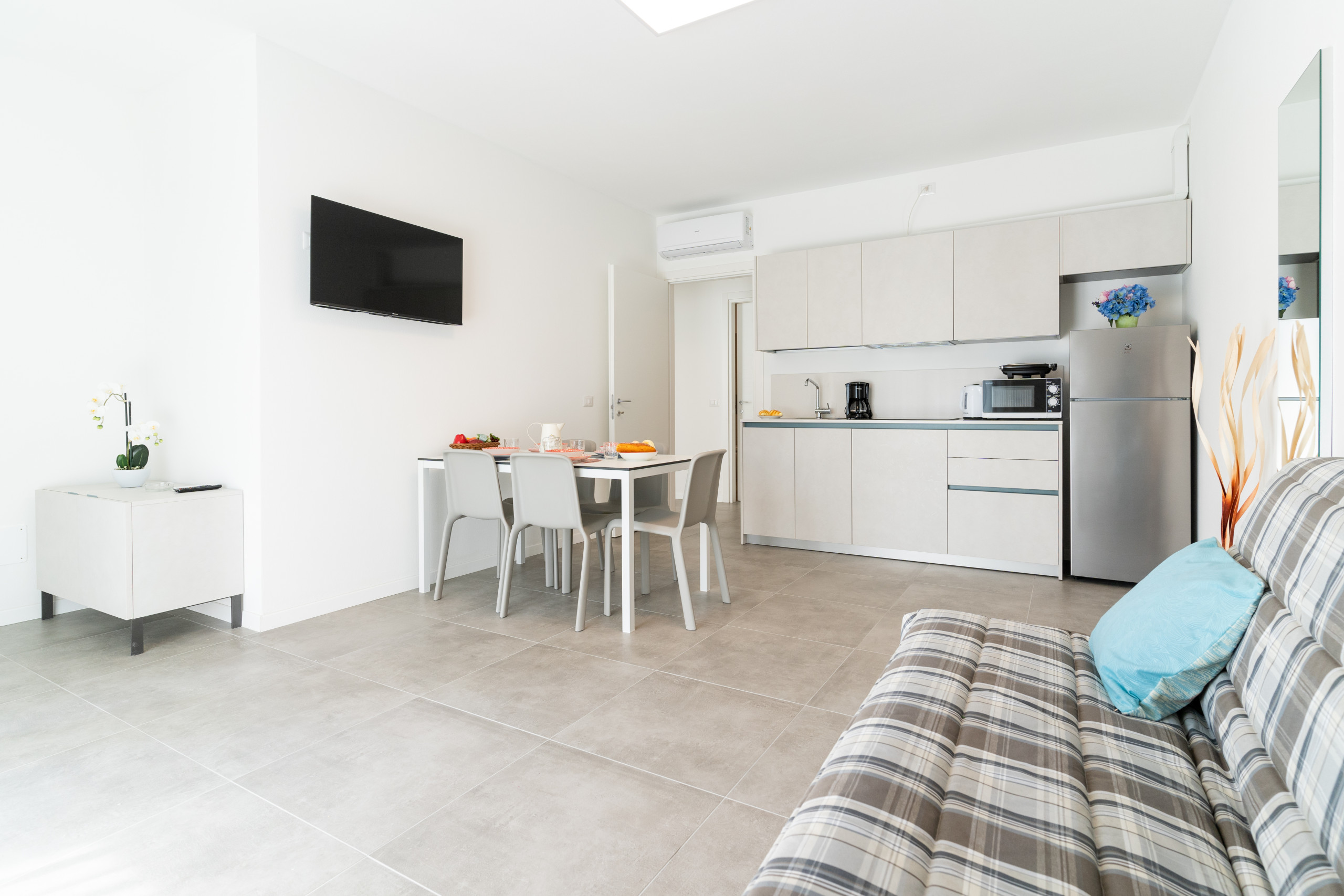 Tutti gli appartamenti si sviluppano su un unico livello e alcuni offrono la vista sulla piscina e altri con vista lateralmente. Il soggiorno dispone di angolo cottura attrezzato, tavolo, sedie e divano letto matrimoniale alla francese, con accesso al balcone o al giardino, ideale per pranzi e cene all’aperto. La camera principale è arredata con letto matrimoniale e letto singolo, mentre la seconda camera offre due letti singoli. Il bagno è spazioso e dotato di box doccia.