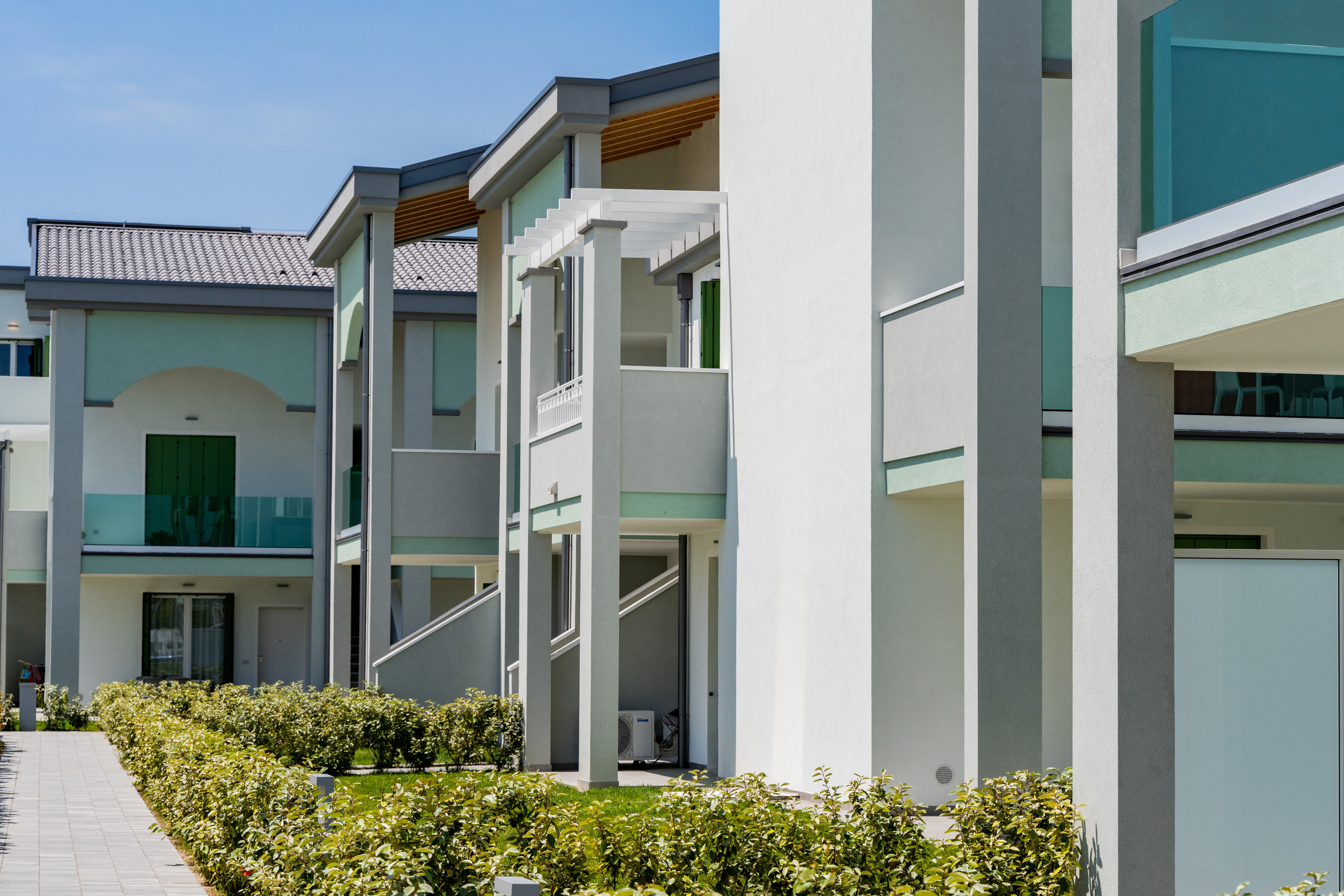 Il villaggio offre ampi giardini comuni con vialetti pedonali, piscina per adulti e piscina dedicata ai bambini, area giochi e zona barbecue. Sono presenti parcheggi scoperti e autorimessa, mentre il Wi-Fi è disponibile gratuitamente nelle aree comuni.