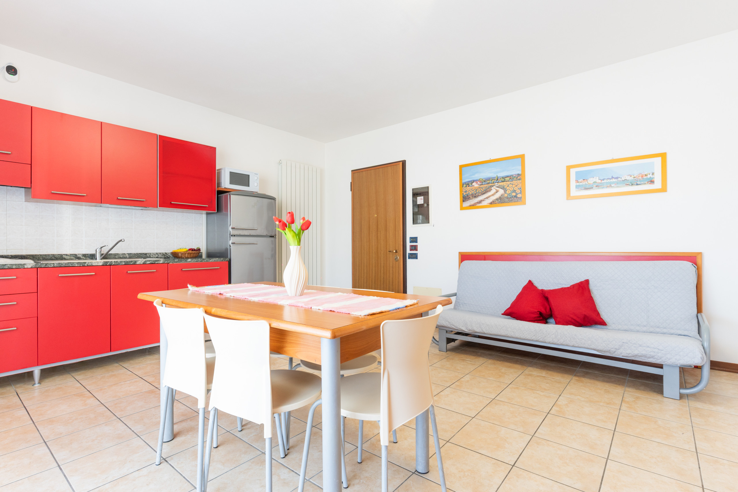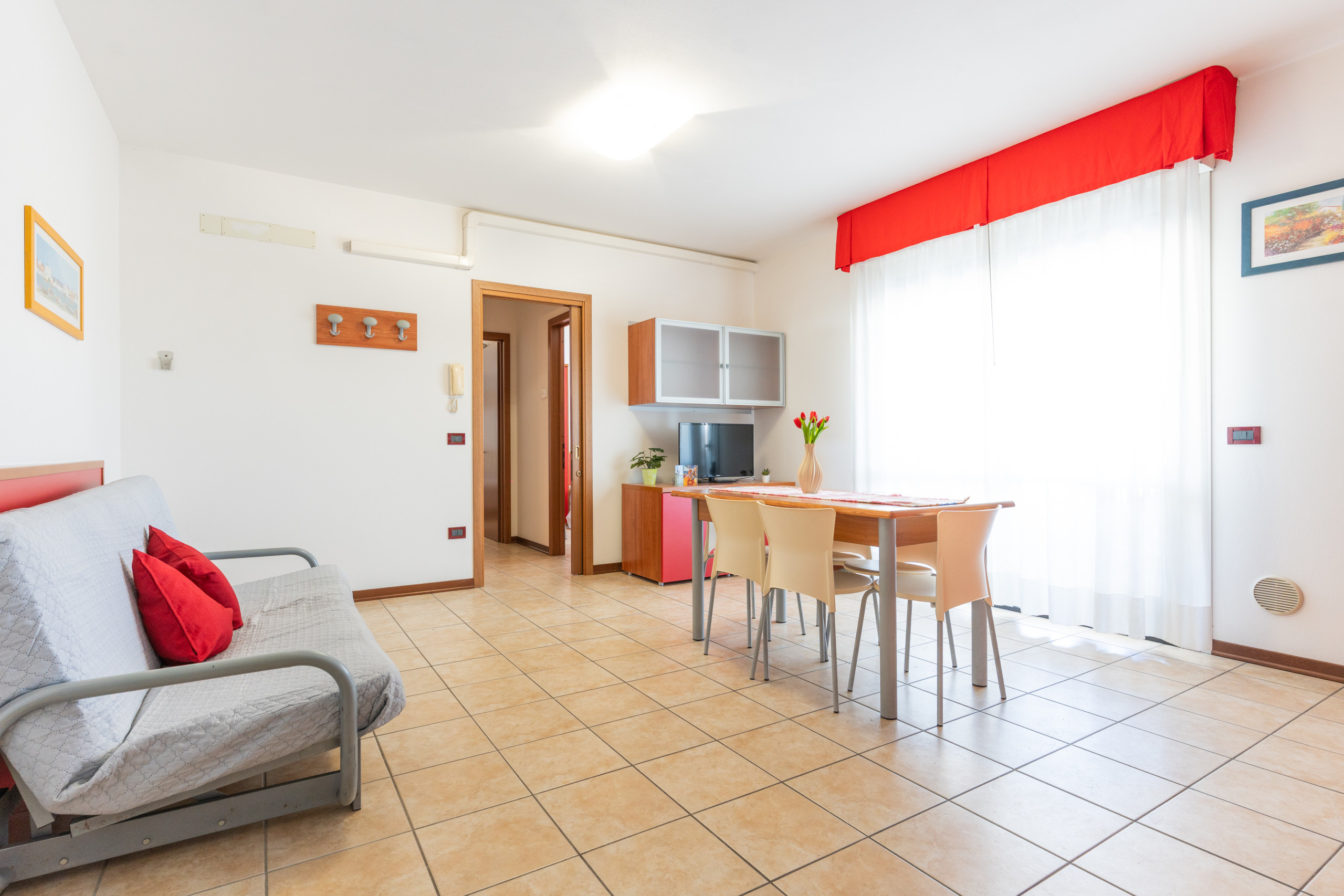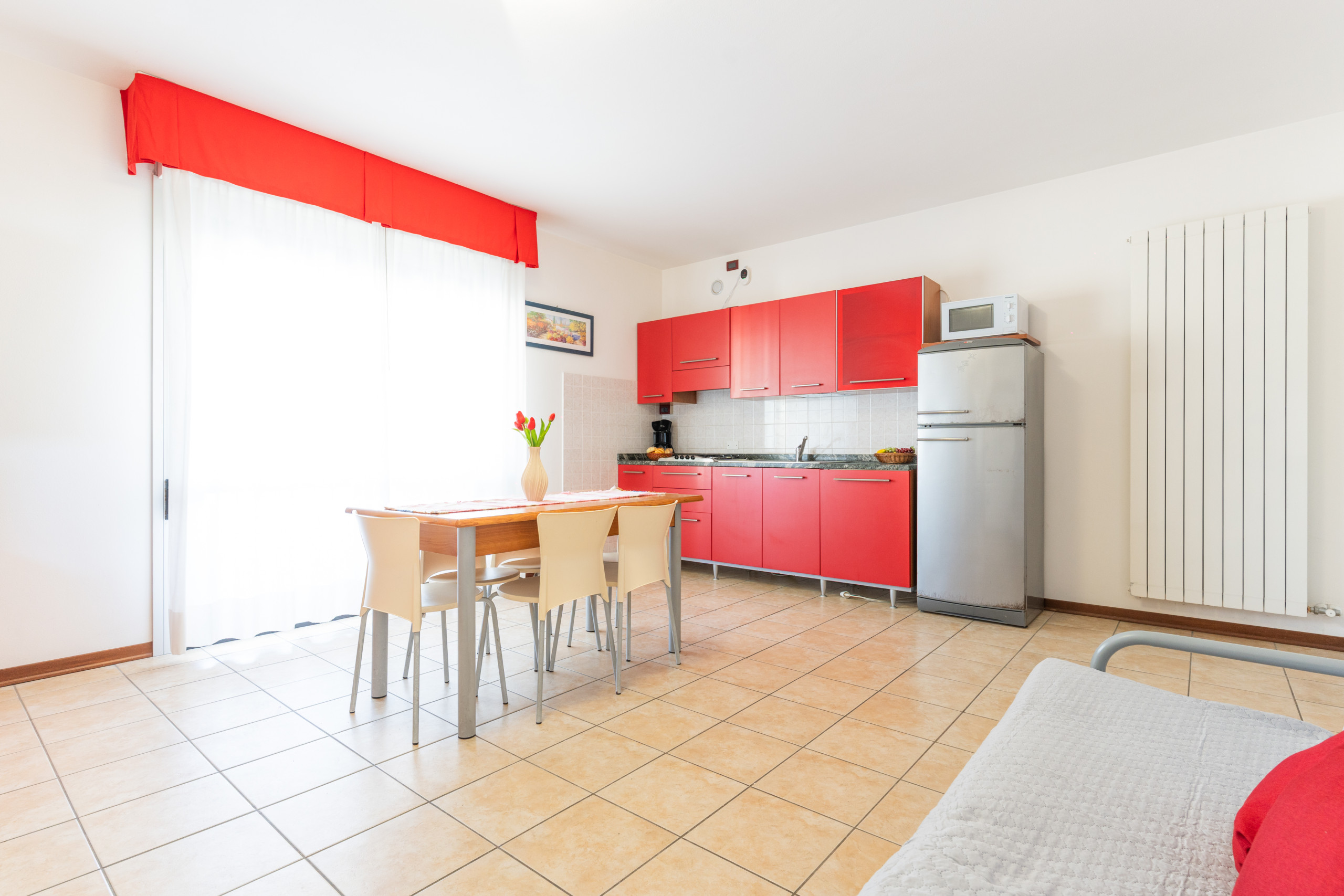 • soggiorno luminoso con angolo cottura attrezzato, tavolo da pranzo, divano letto matrimoniale alla francese e accesso a terrazzo o balcone;