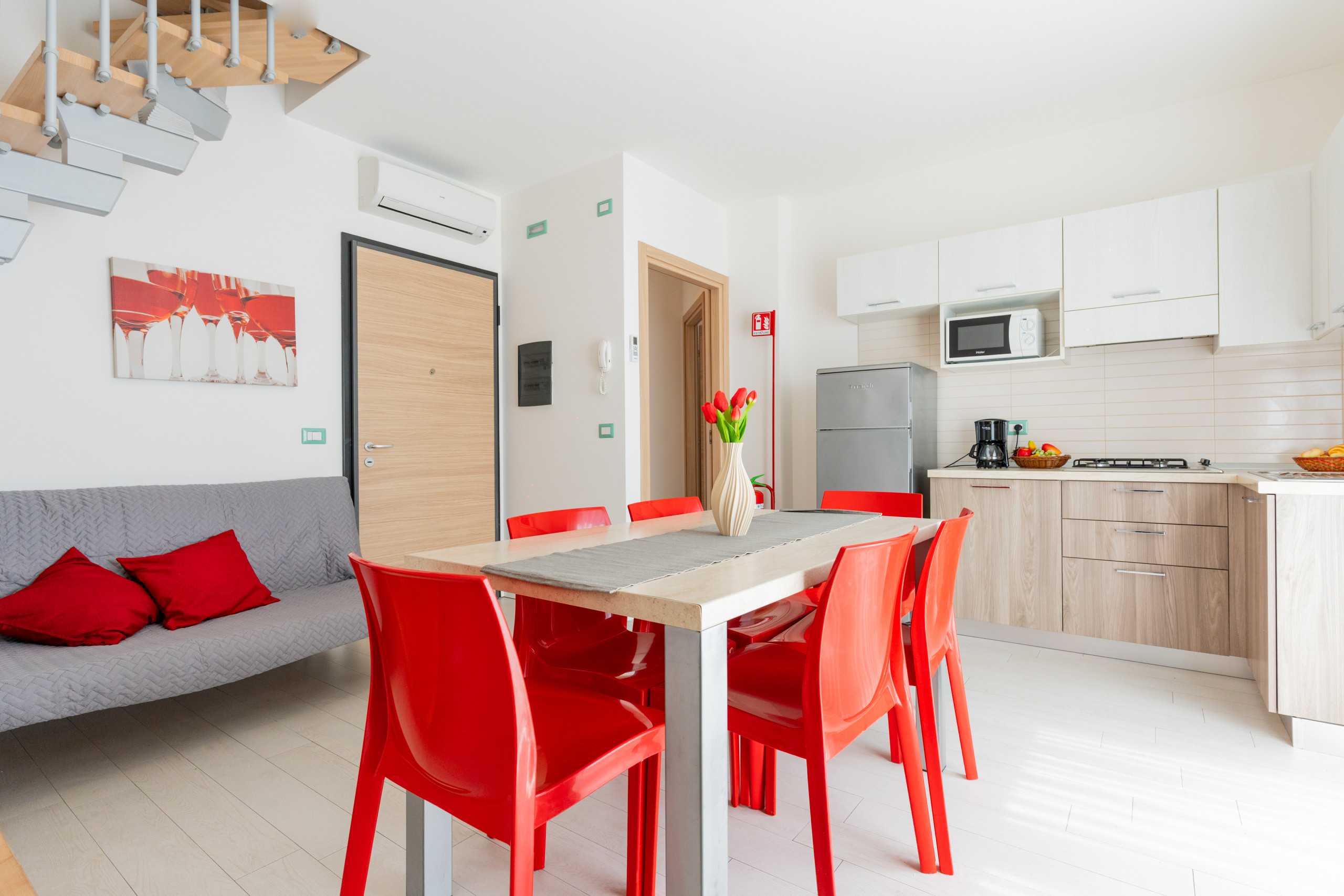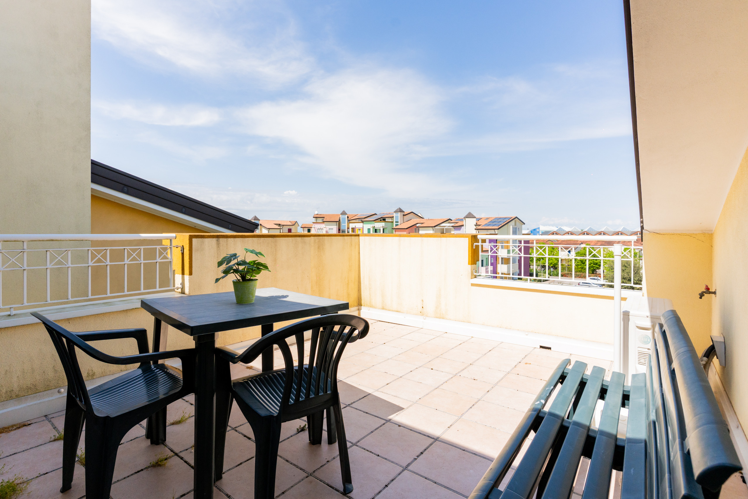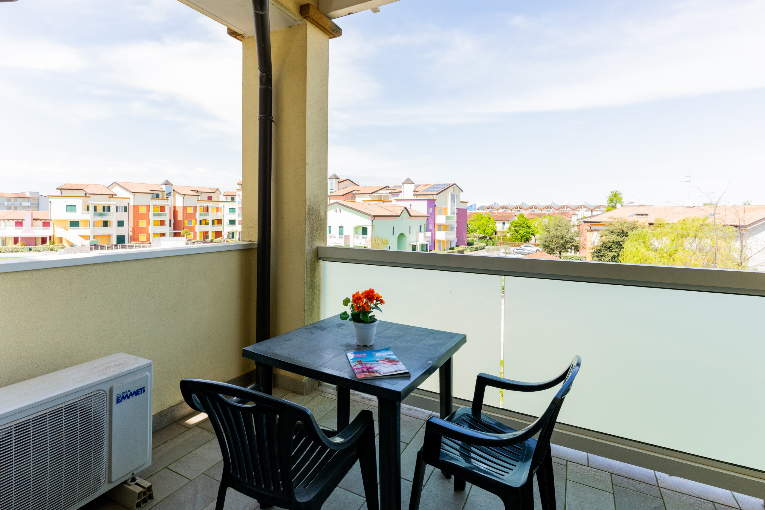 Gli appartamenti trilocali da 55 mq, situati al 1° o 2° piano, dispongono di un ampio balcone arredato con mobili da esterno, perfetto per colazioni, pranzi e cene all’aperto. Le unità sono servite da ascensore, per un accesso ancora più comodo.