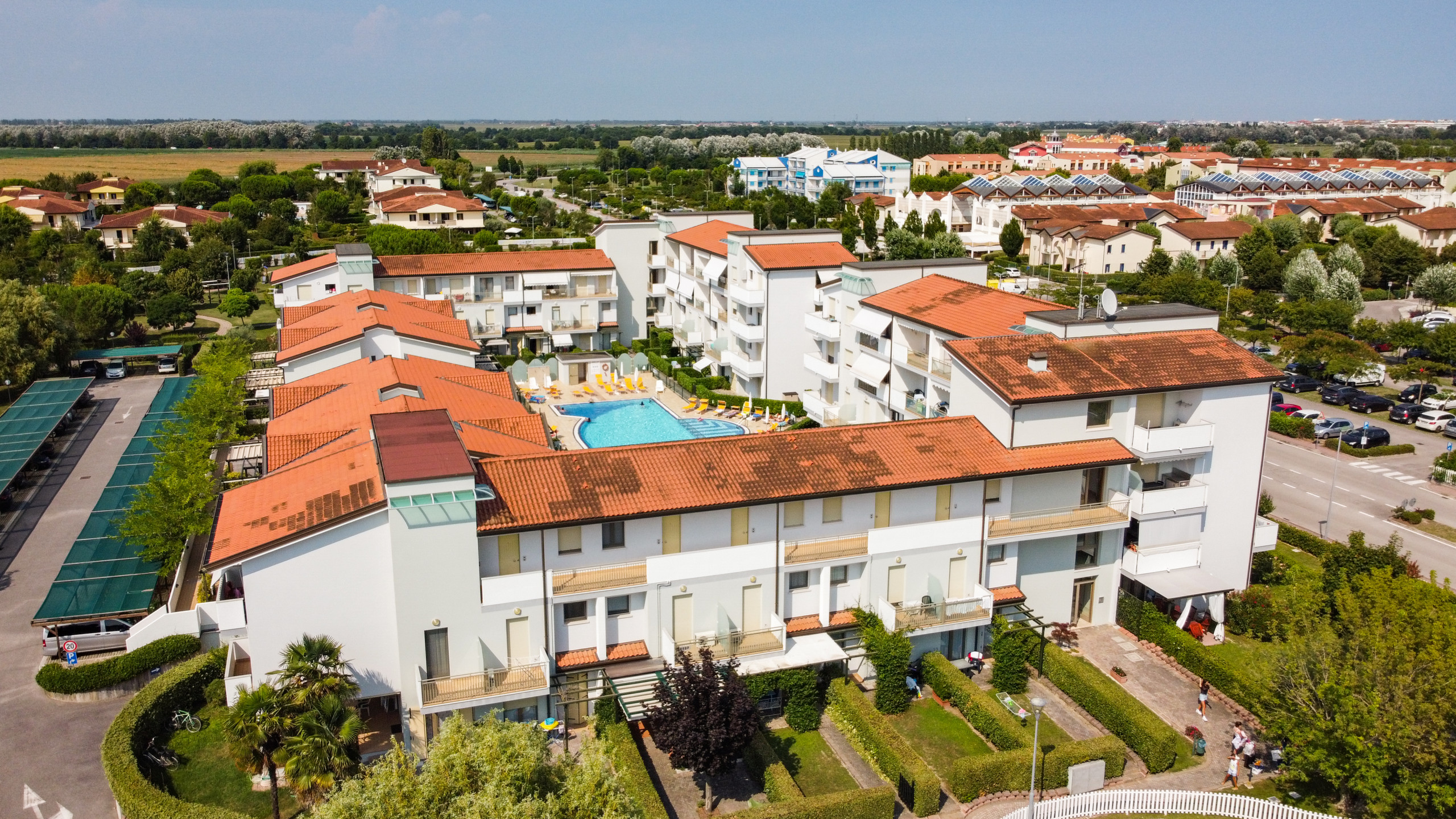 Il complesso residenziale si sviluppa intorno a un’ampia area centrale con piscina per adulti e bambini, circondata da un luminoso solarium con lettini e ombrelloni. Questa disposizione crea una corte accogliente e riservata, dove tranquillità ed eleganza si fondono con l’atmosfera estiva di Lido Altanea.