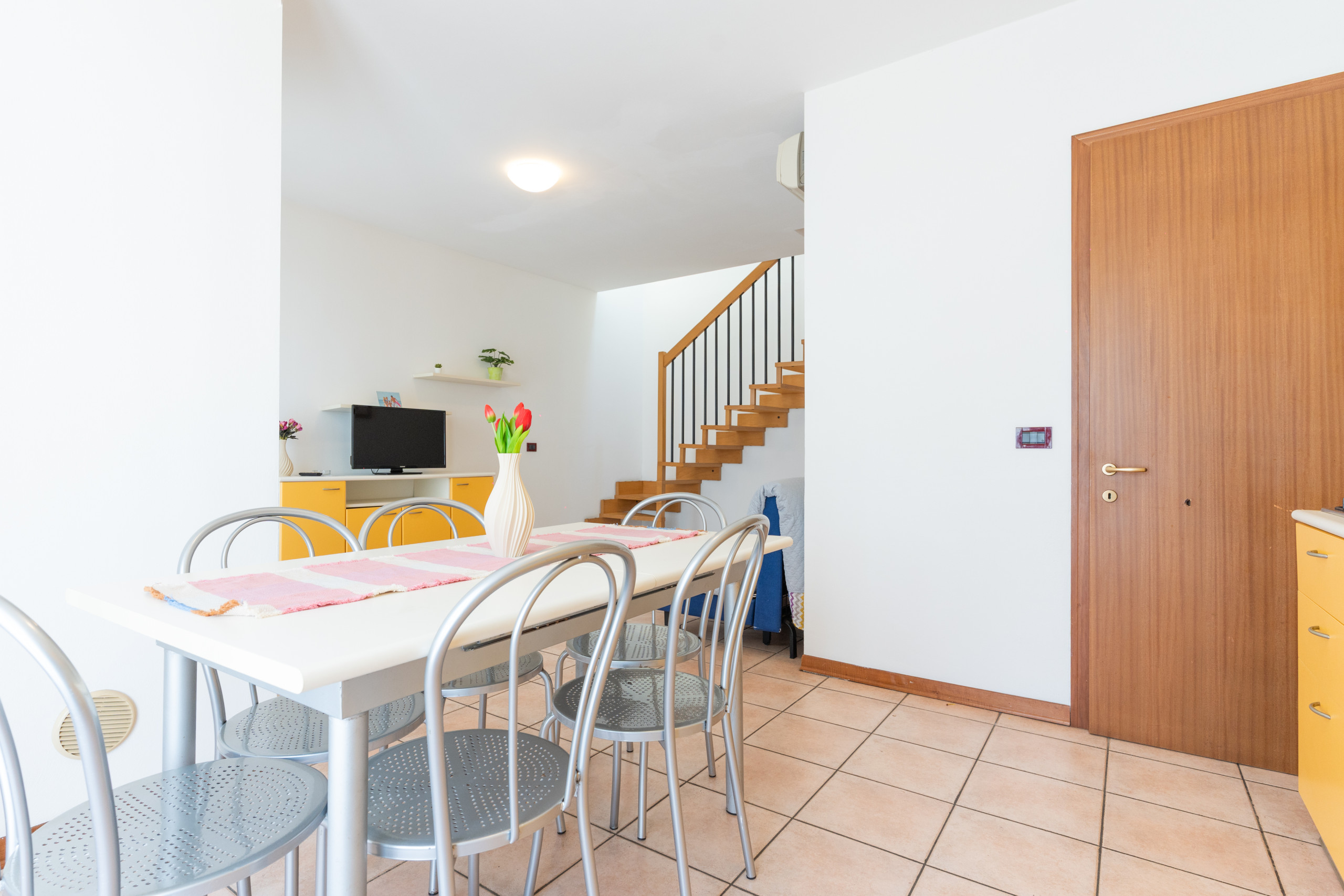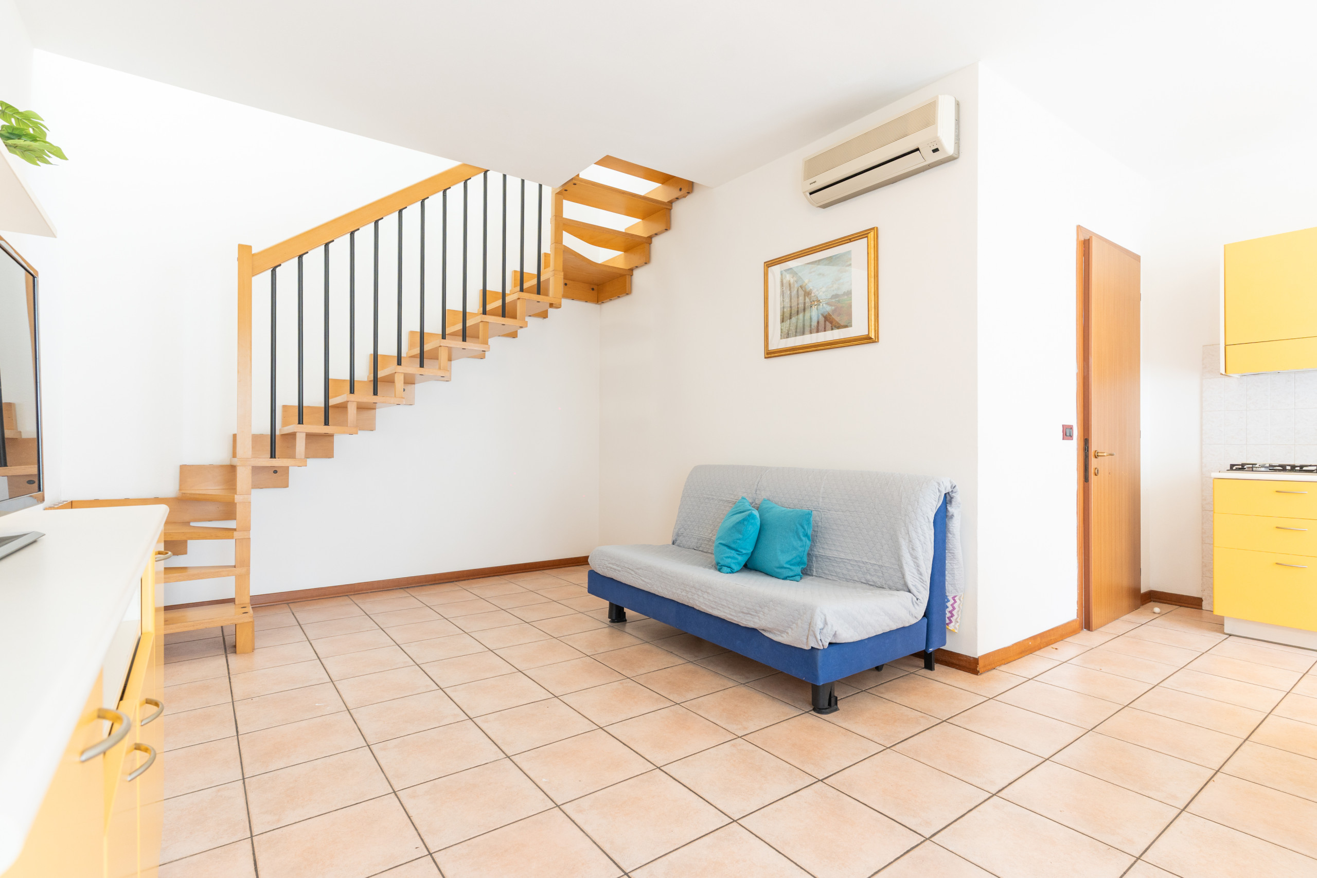 Al piano terra si trovano un soggiorno luminoso con angolo cottura attrezzato e divano letto matrimoniale, oltre a un bagno di servizio. Al primo piano, raggiungibile tramite scala interna, si trovano una camera matrimoniale, una seconda camera con due letti singoli e un secondo bagno.