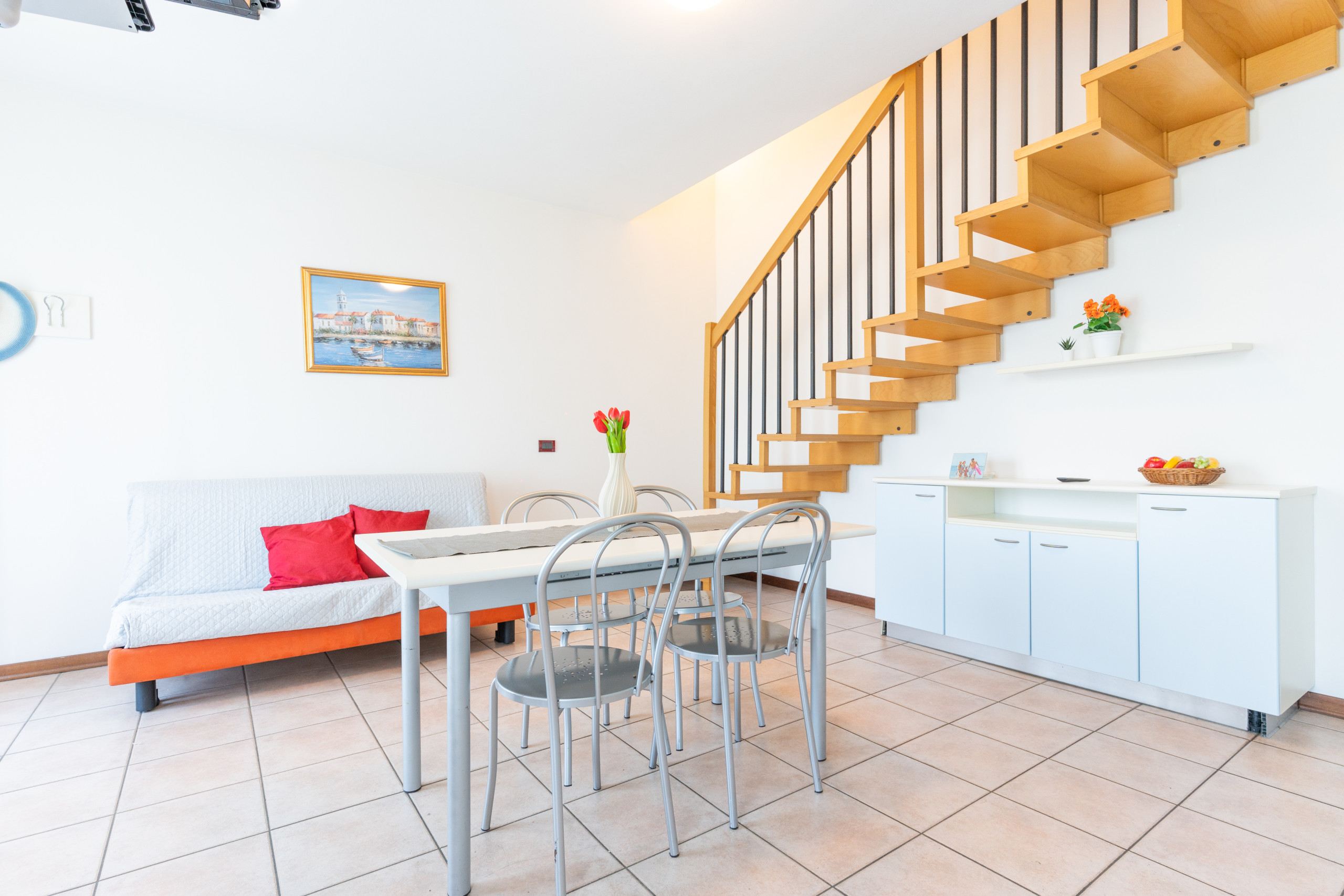 L'appartamento disposto su due piani con scala interna, dispone di un'ampia camera da letto con un letto matrimoniale queen size e bagno al primo piano e un divano letto in soggiorno al piano terra, ideale per ospitare comodamente fino a 4 persone. In camera potete trovare unche una cassaforte.