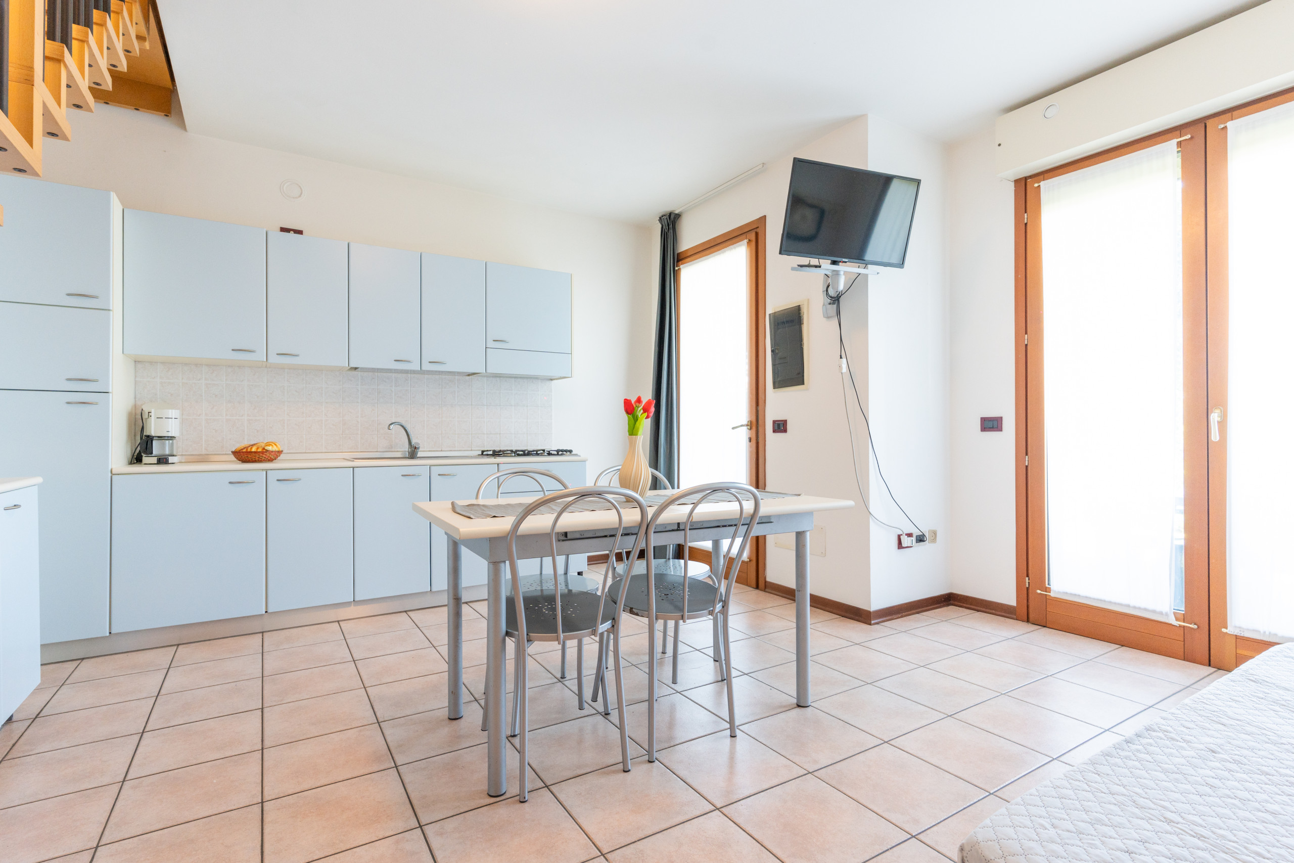 • soggiorno con angolo cottura attrezzato e divano letto matrimoniale alla francese;