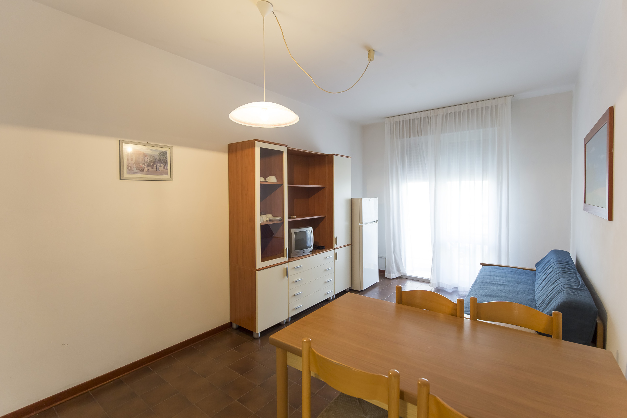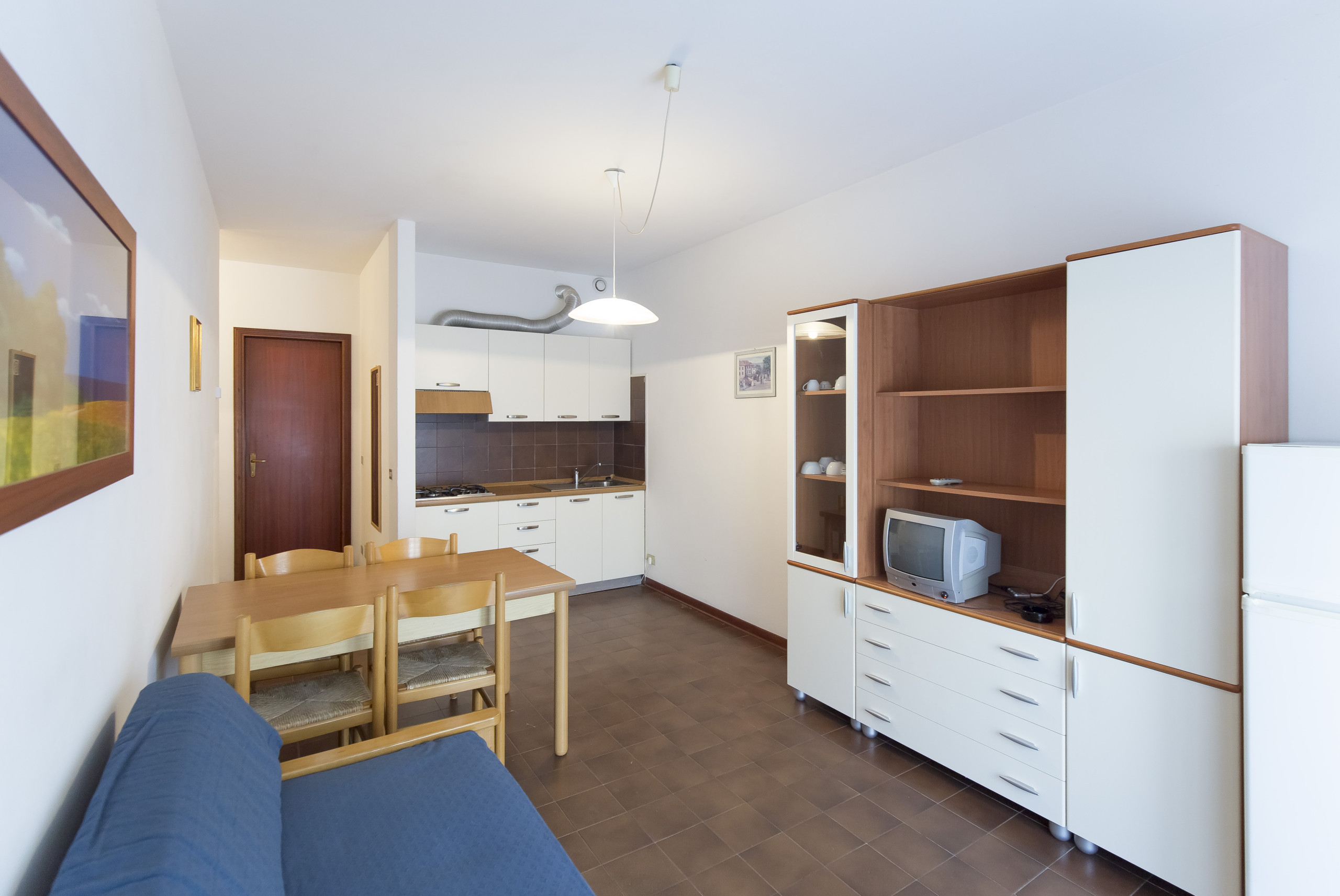 - Un soggiorno con angolo cottura attrezzato, tavolo, sedie e divano letto doppio.
