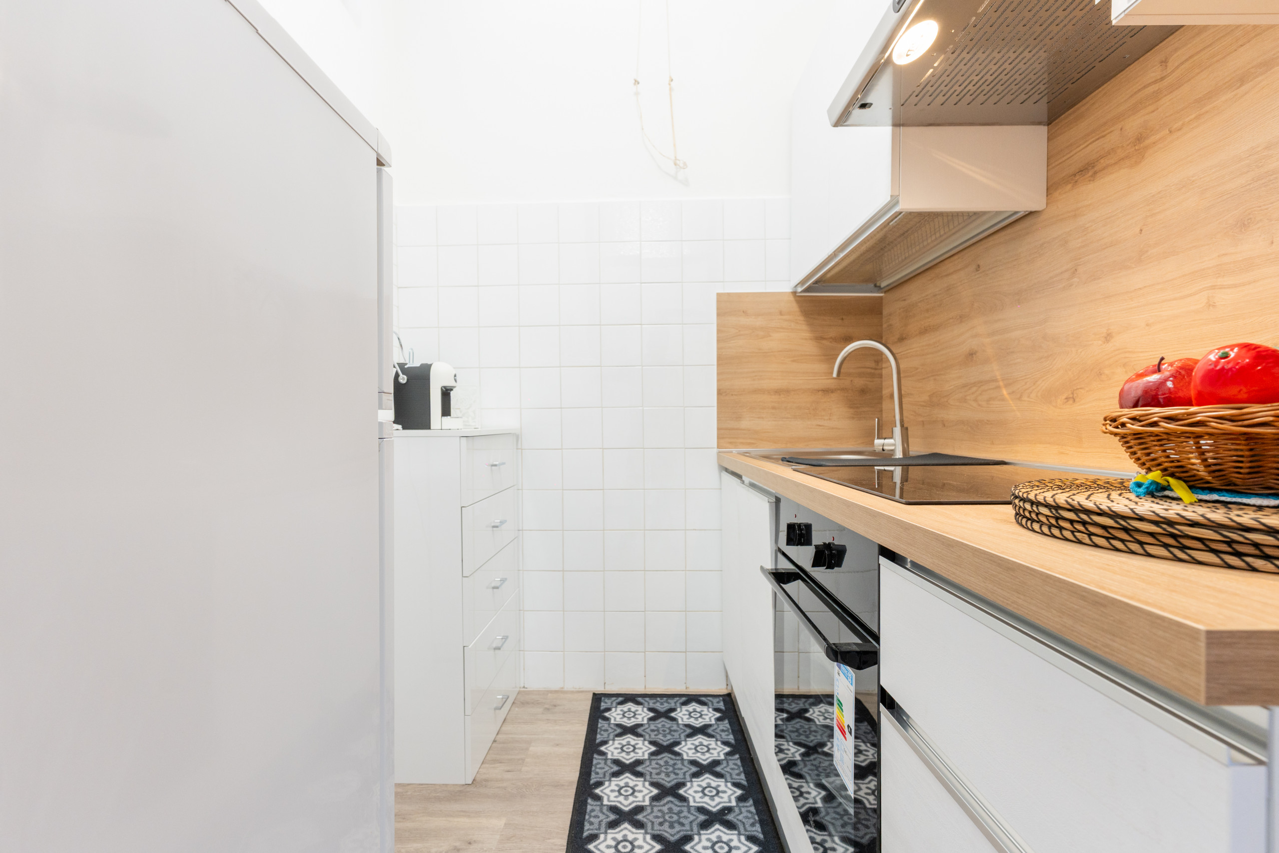 - un soggiorno con angolo cottura attrezzato, tavolo, sedie e un divano letto doppio.