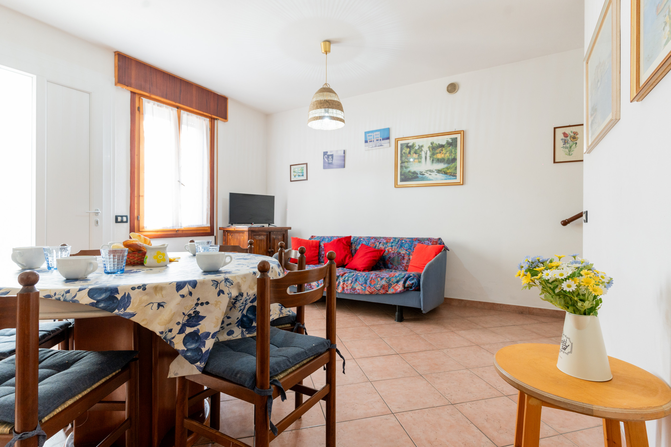 - Un soggiorno con angolo cottura attrezzato, tavolo, sedie e divano letto doppio.