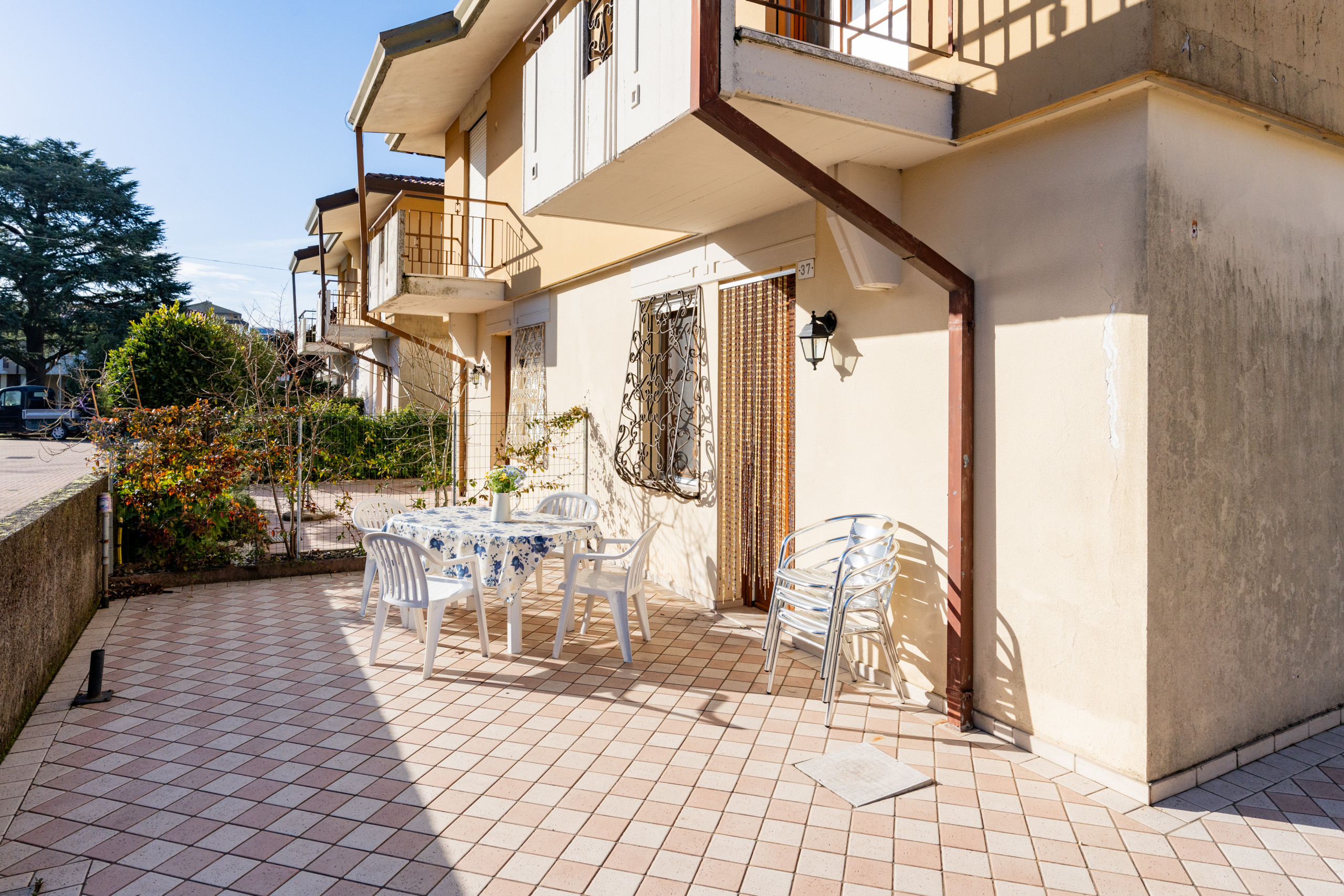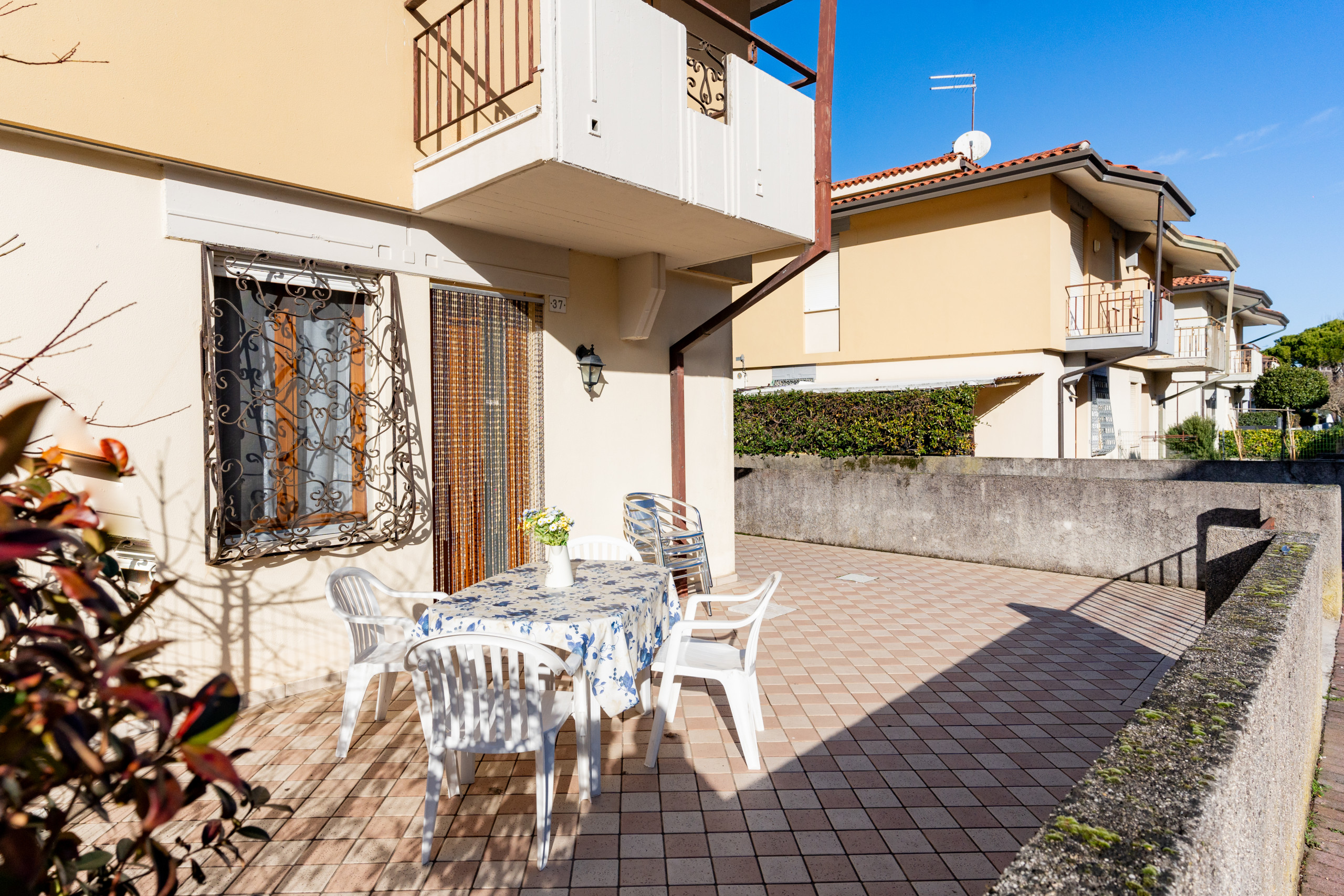 La villetta si trova esposta ad sud-est e con vista sulla corte interna, si erge su due livelli e vanta un bello spazio esterno arredato con tavolo e sedie.