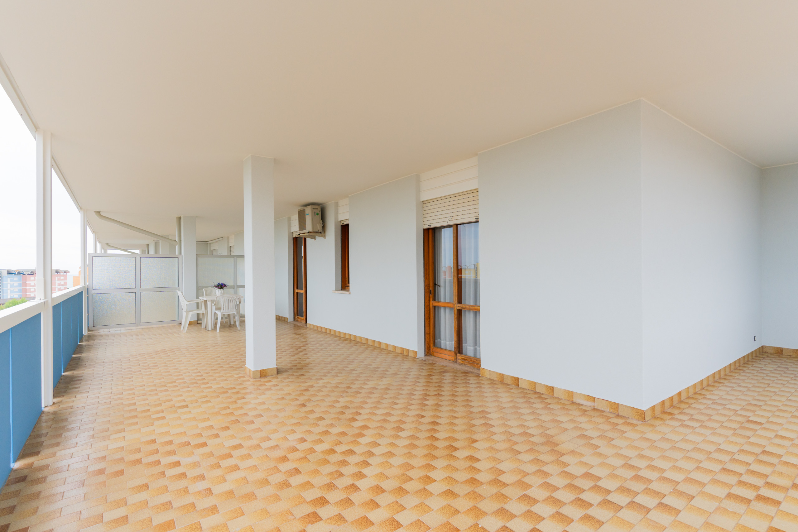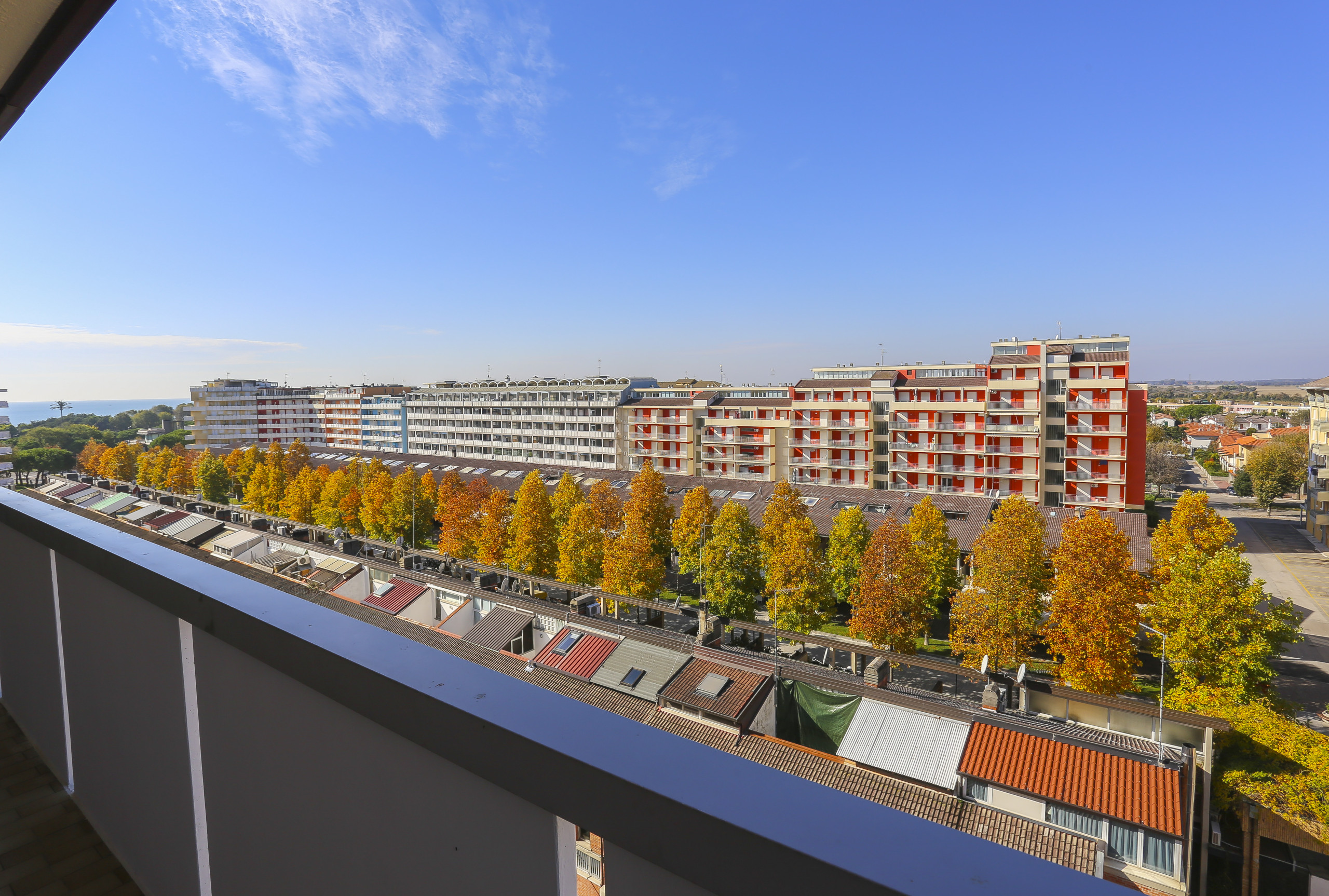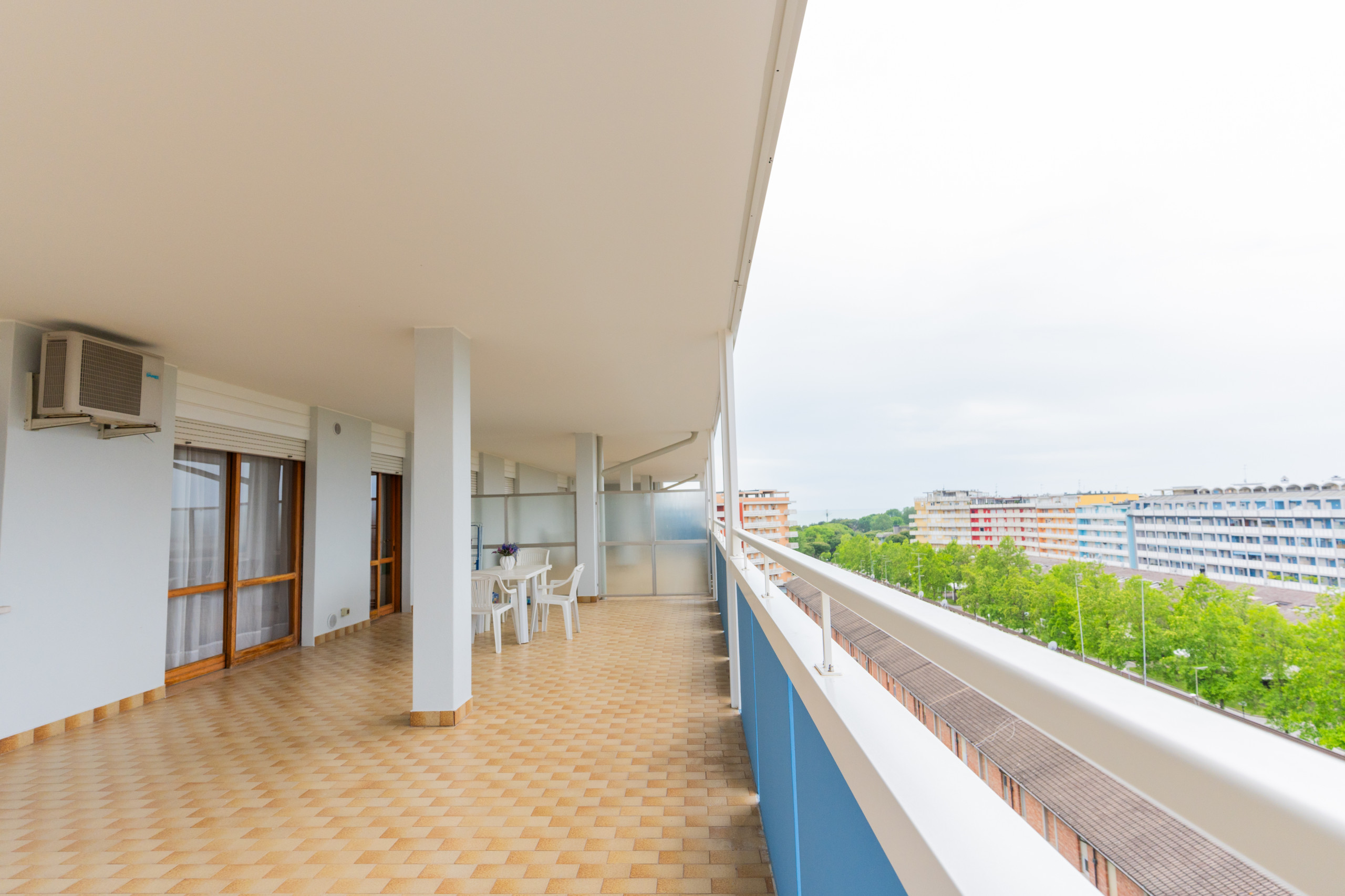 L’appartamento quadrilocale si trova al 7° piano del residence e offre 84 mq di spazio accogliente e funzionale. È arricchito da due ampie terrazze esposte a est, con vista sul mare e sulla piscina.