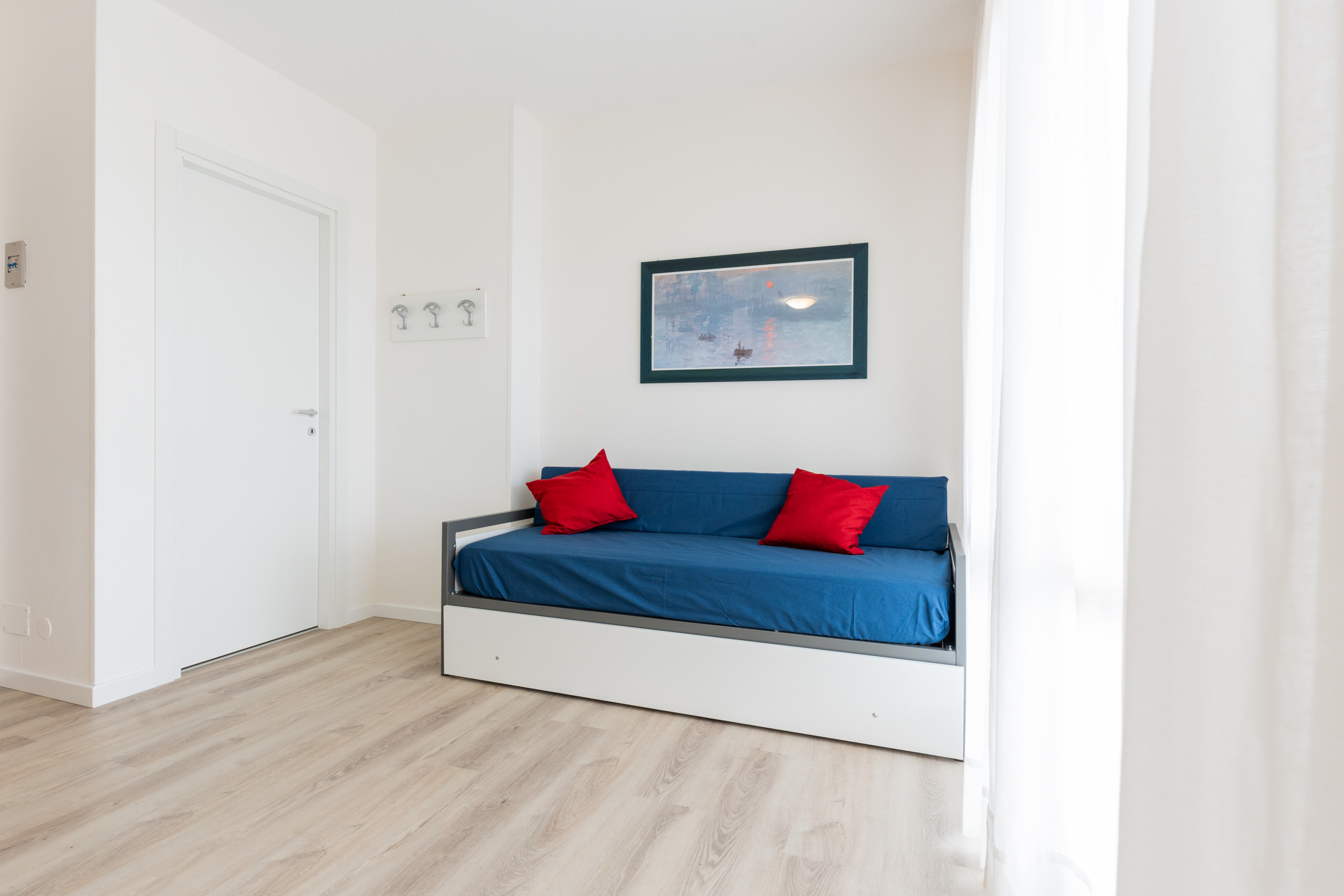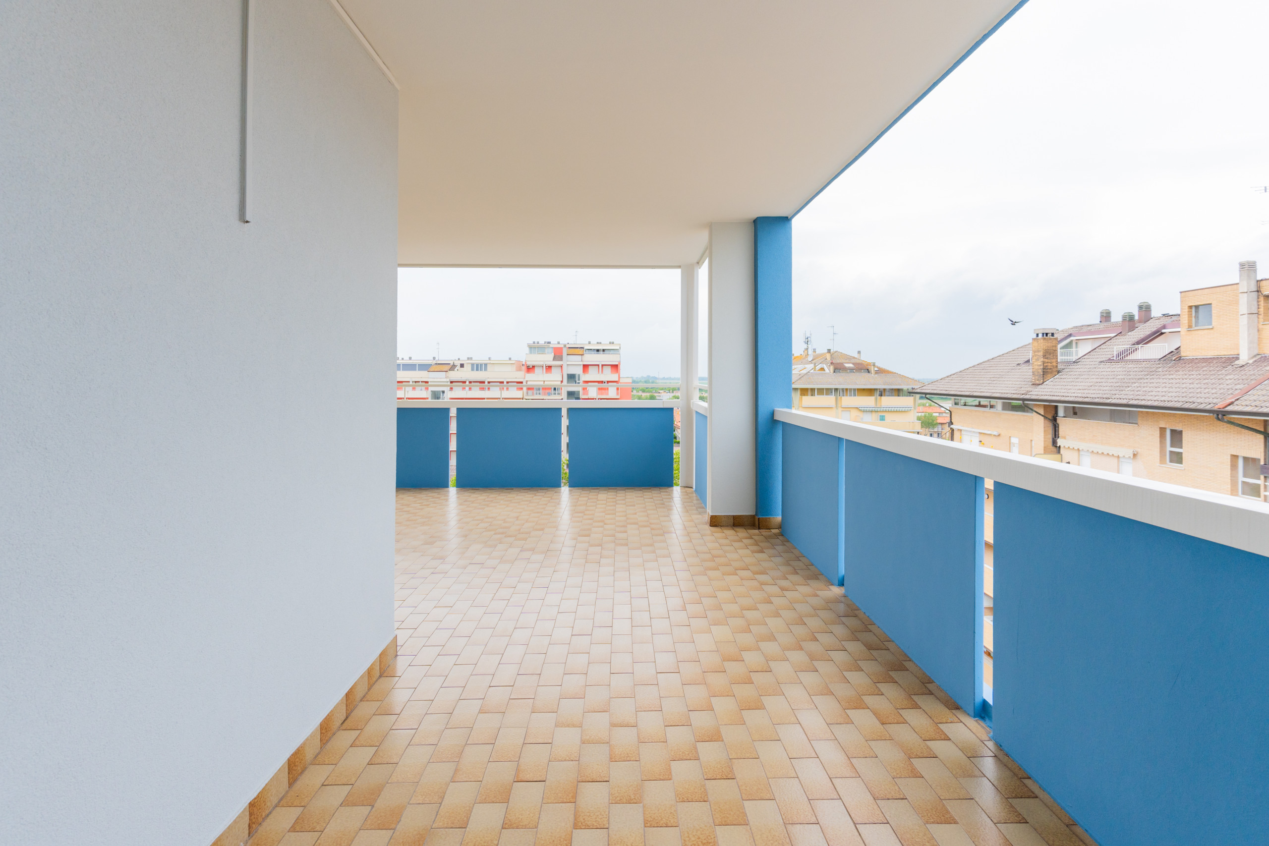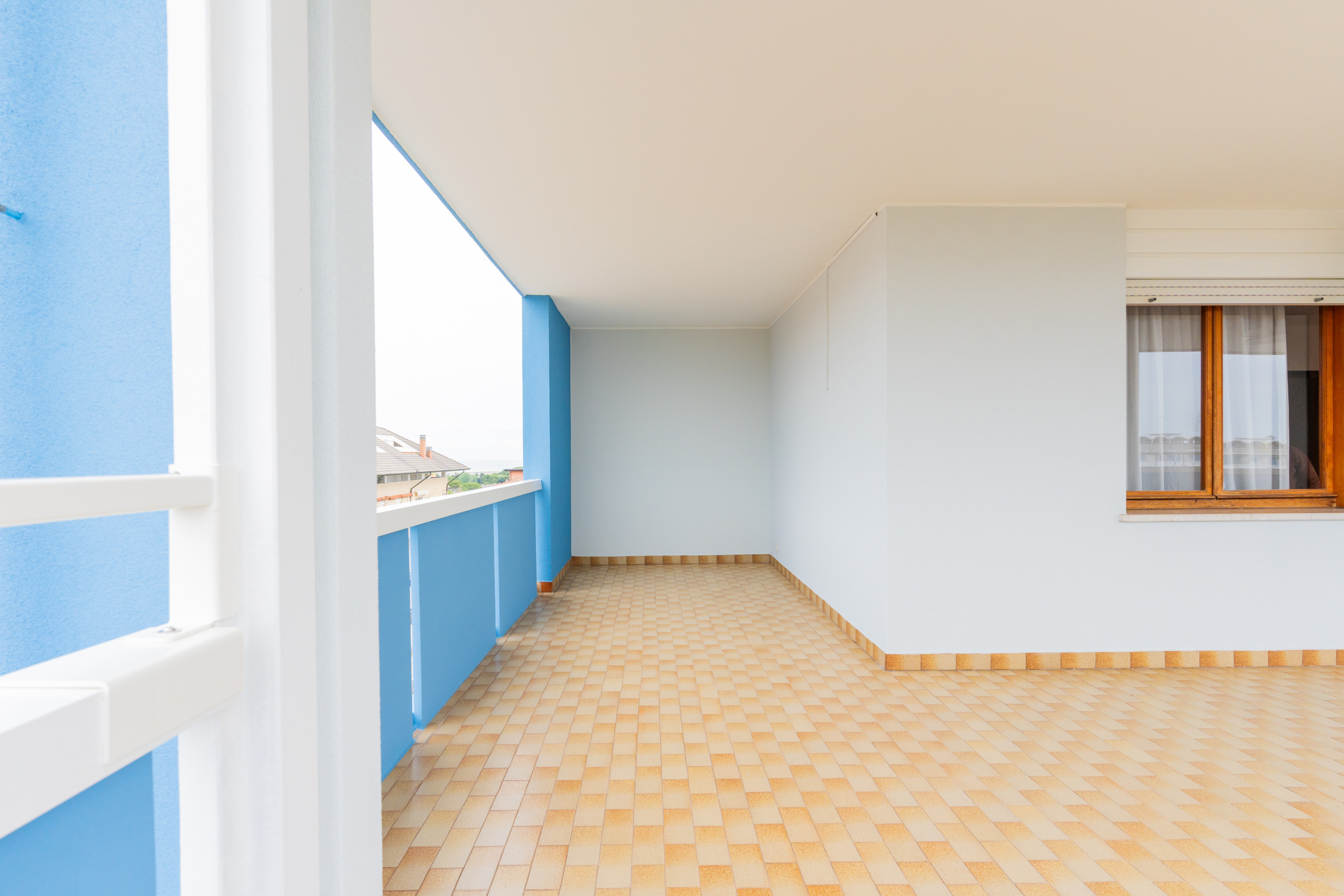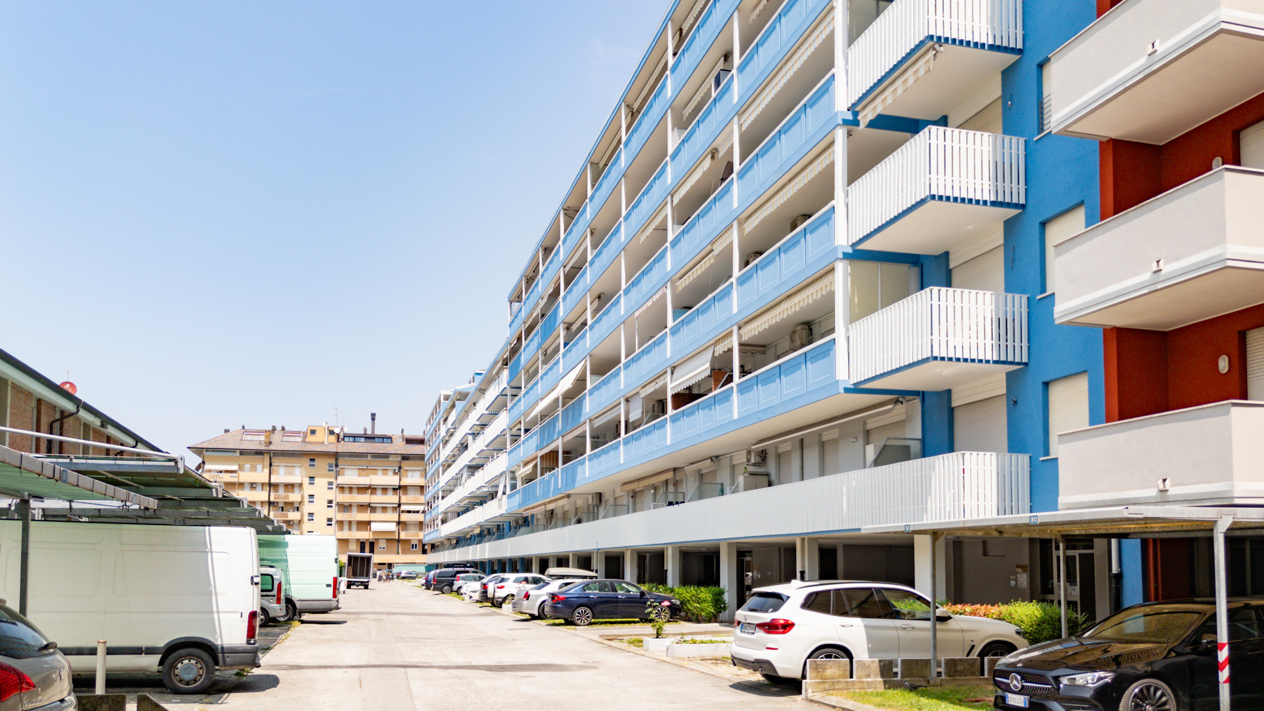L’appartamento quadrilocale si trova al 7° piano del residence e offre 84 mq di spazio accogliente e funzionale. È arricchito da due ampie terrazze esposte a est, con vista sul mare e sulla piscina.