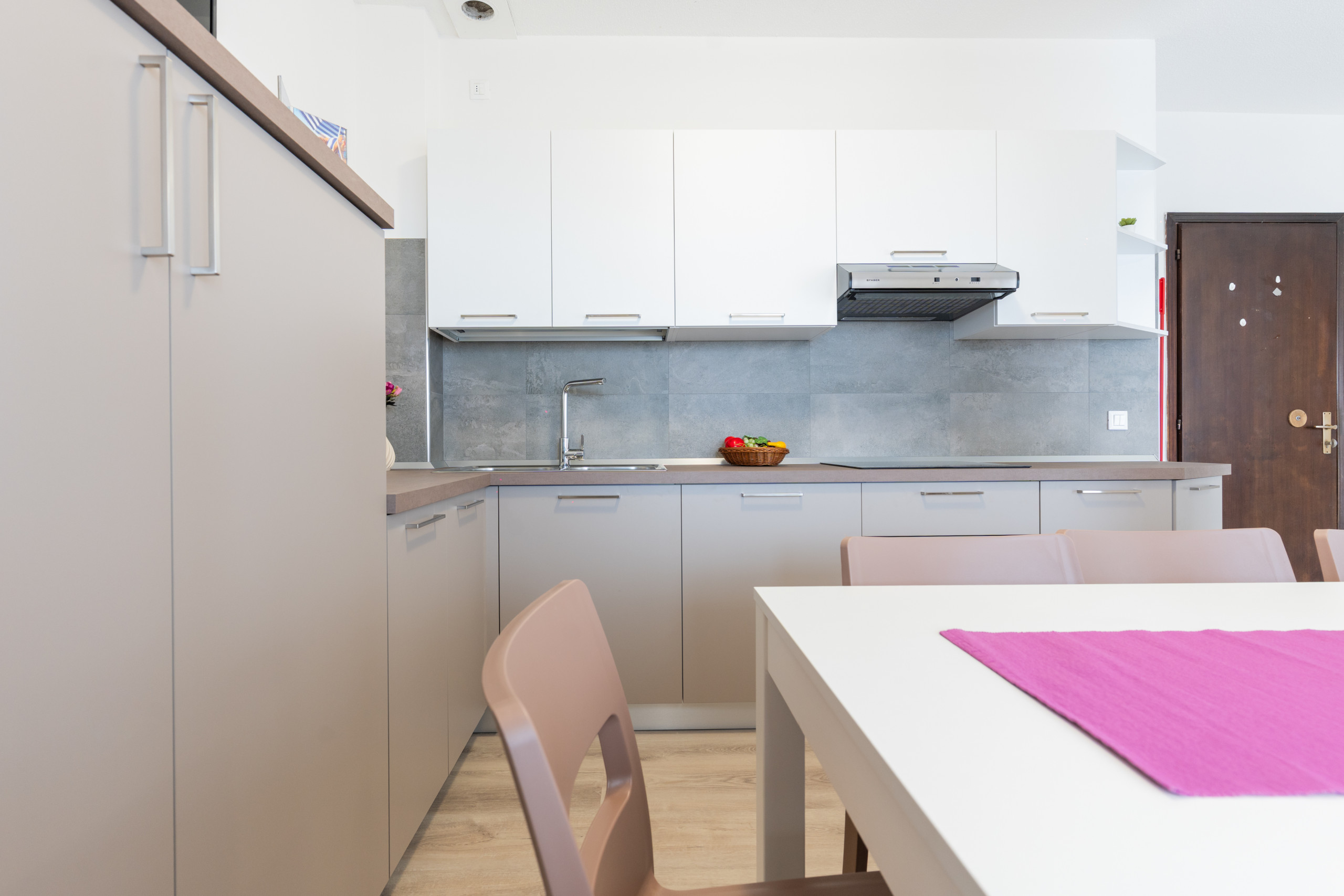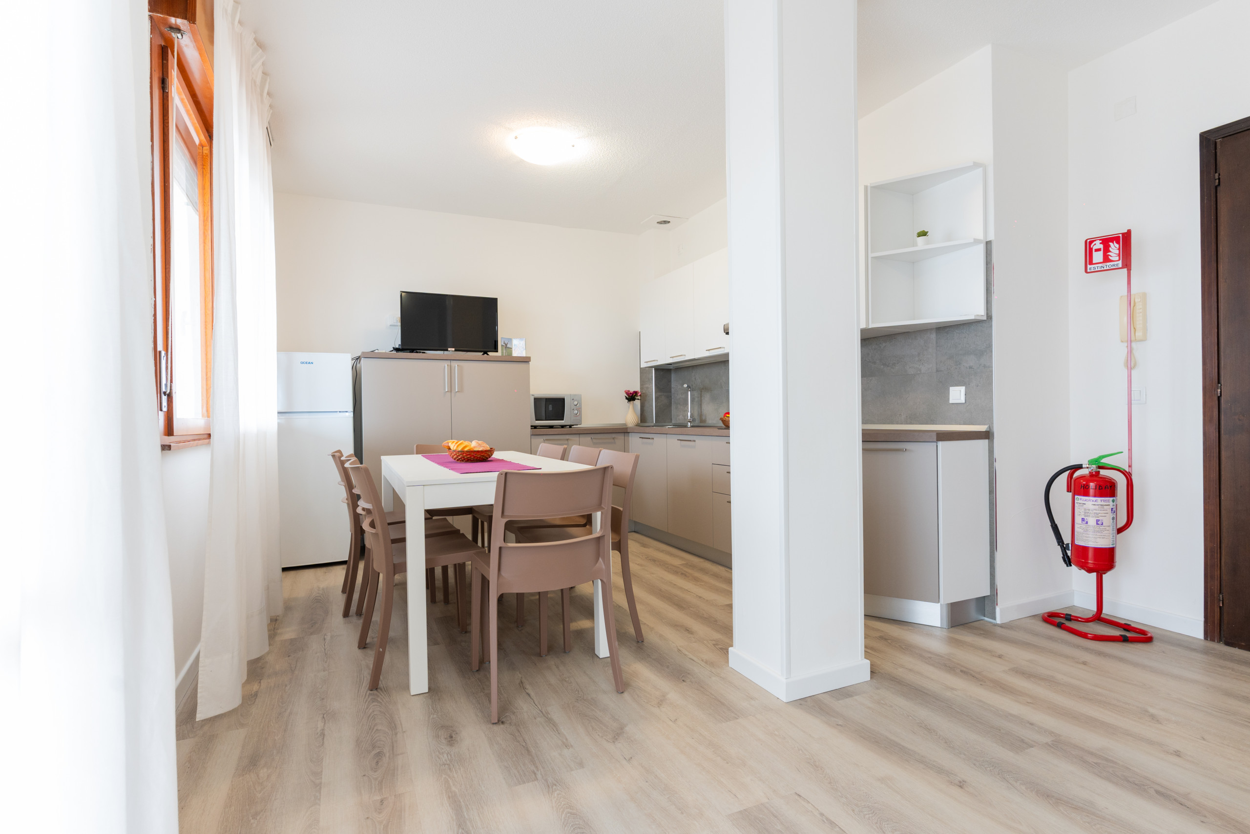 - Il soggiorno, che ospita un angolo cottura attrezzato, tavolo, sedie e un divano letto doppio.
