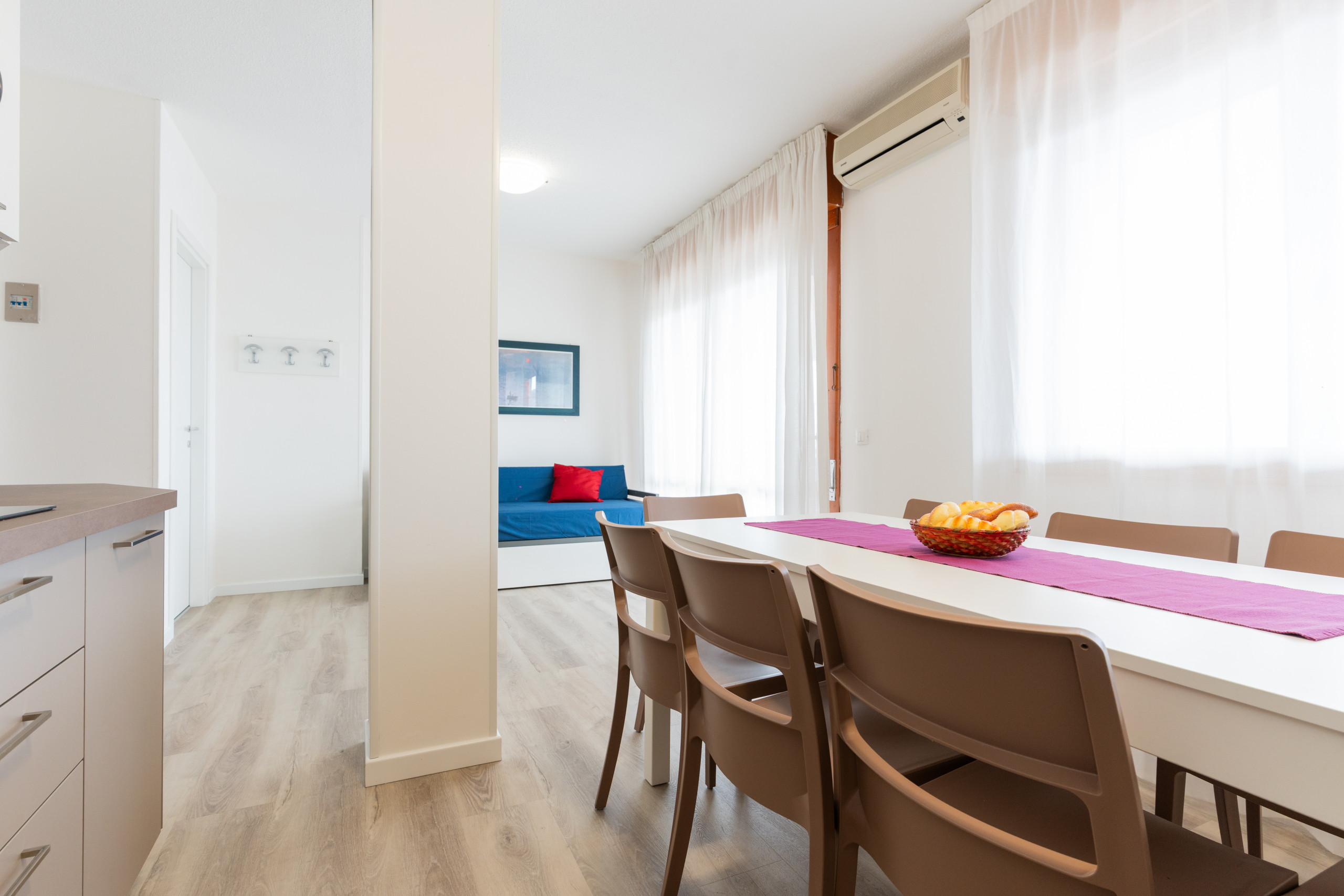- Un soggiorno con angolo cottura attrezzato, tavolo, sedie e un divano letto doppio.