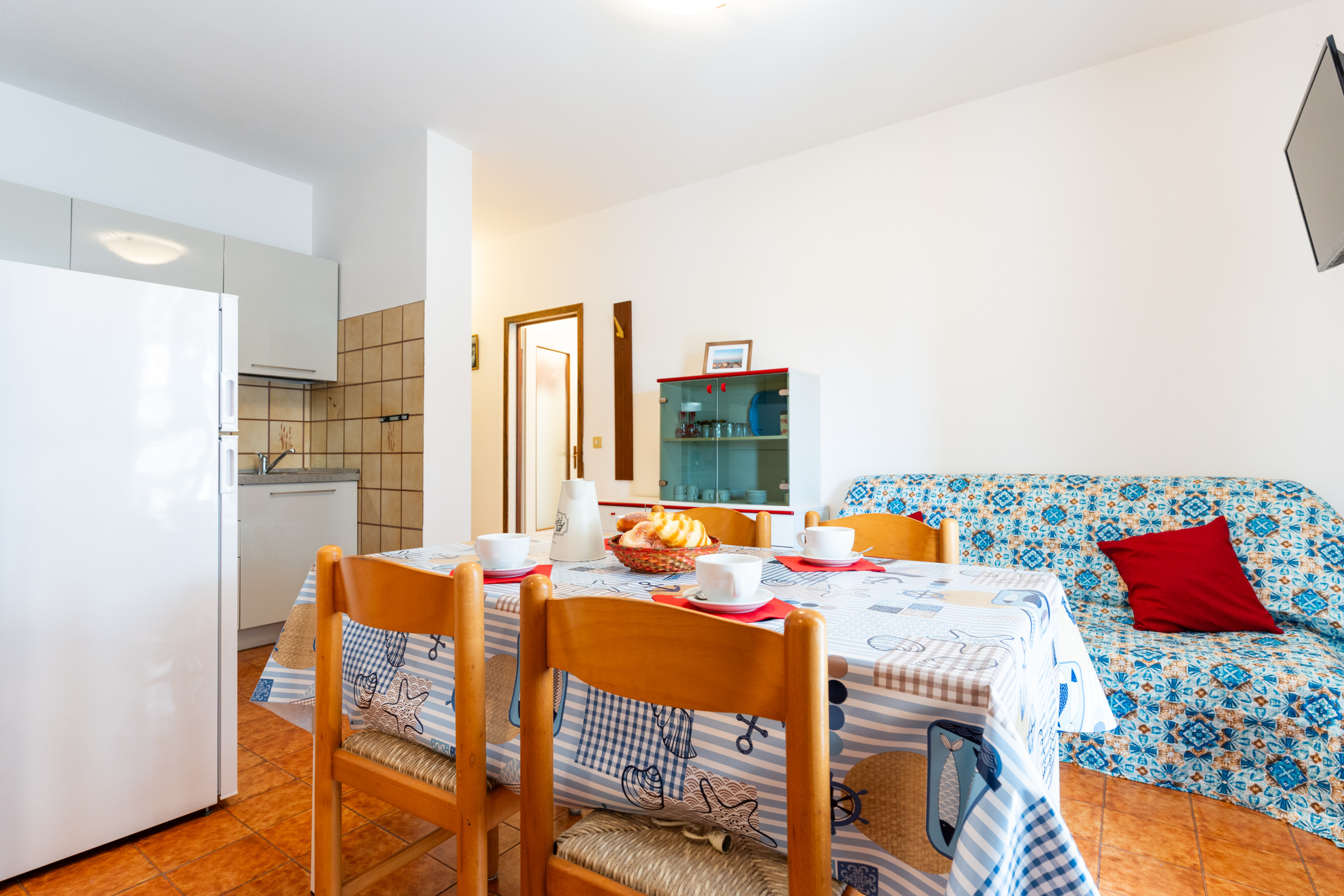 - Un soggiorno con angolo cottura completamente attrezzato, tavolo, sedie e un divano letto matrimoniale.