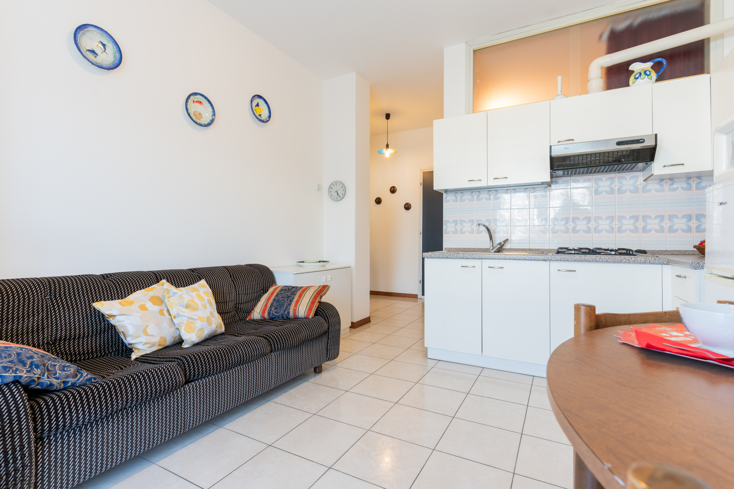 - Un soggiorno con angolo cottura attrezzato, tavolo, sedie e divano letto doppio.