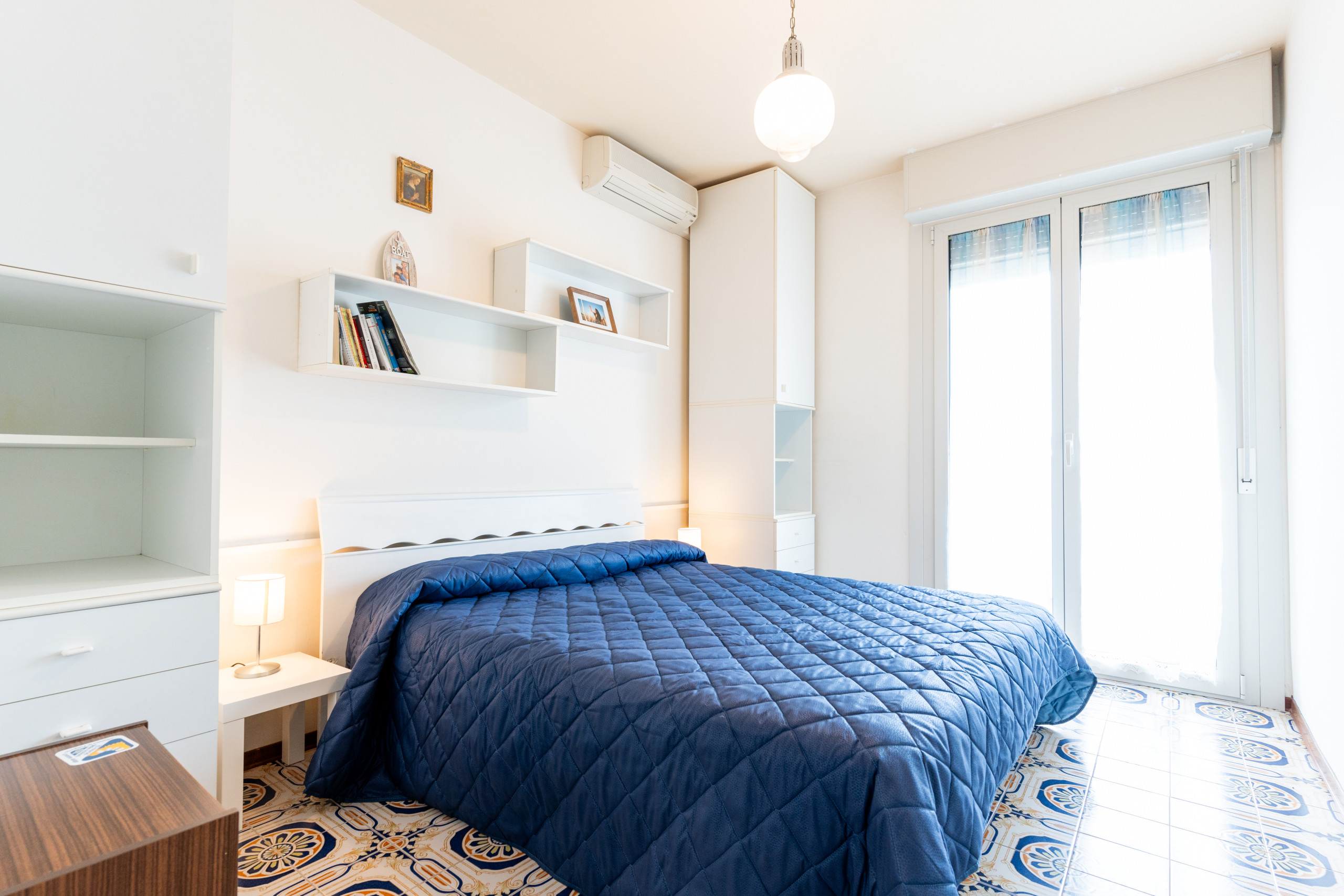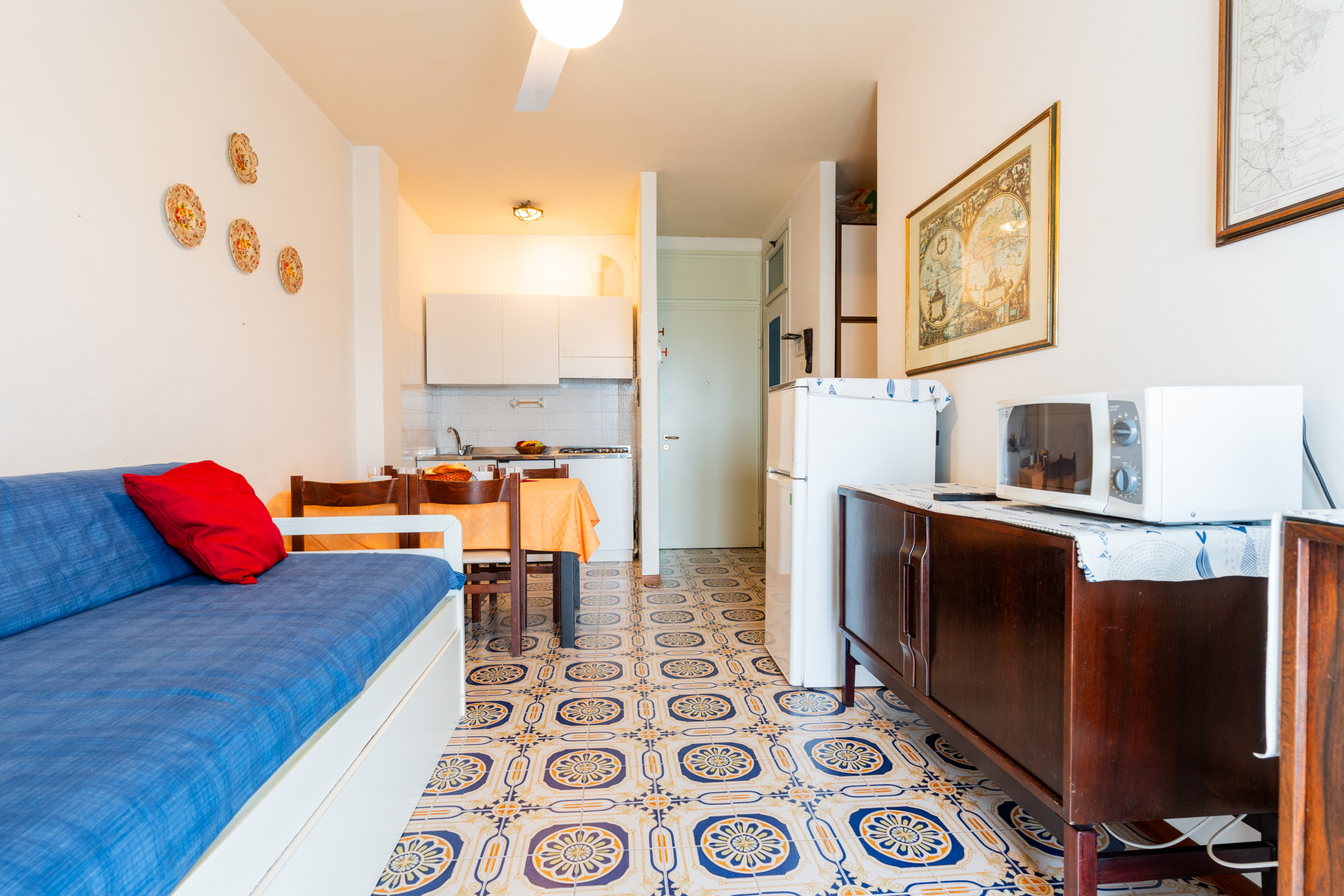 L’appartamento bilocale, situato al 4° piano, offre una superficie di 43 mq e, grazie al balcone esposto a ovest, potrai godere di una splendida vista sul mare.