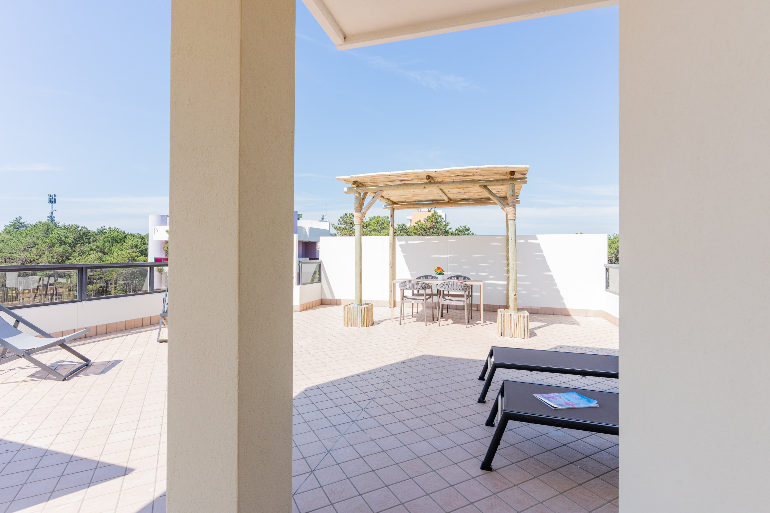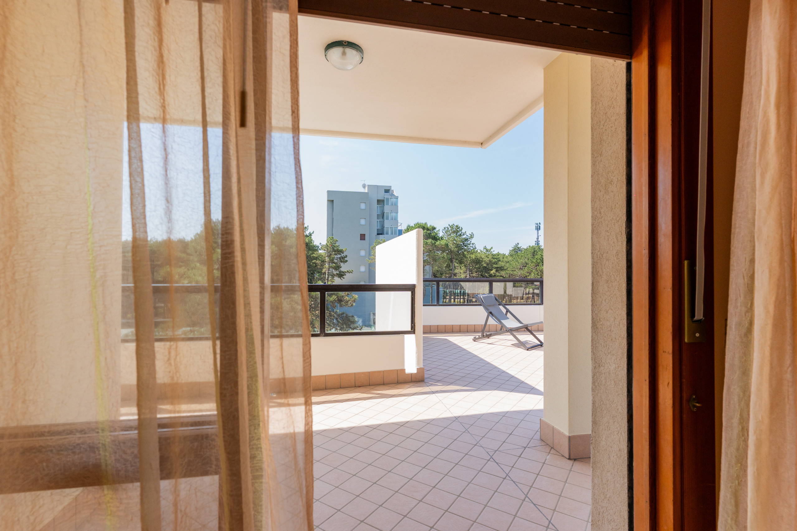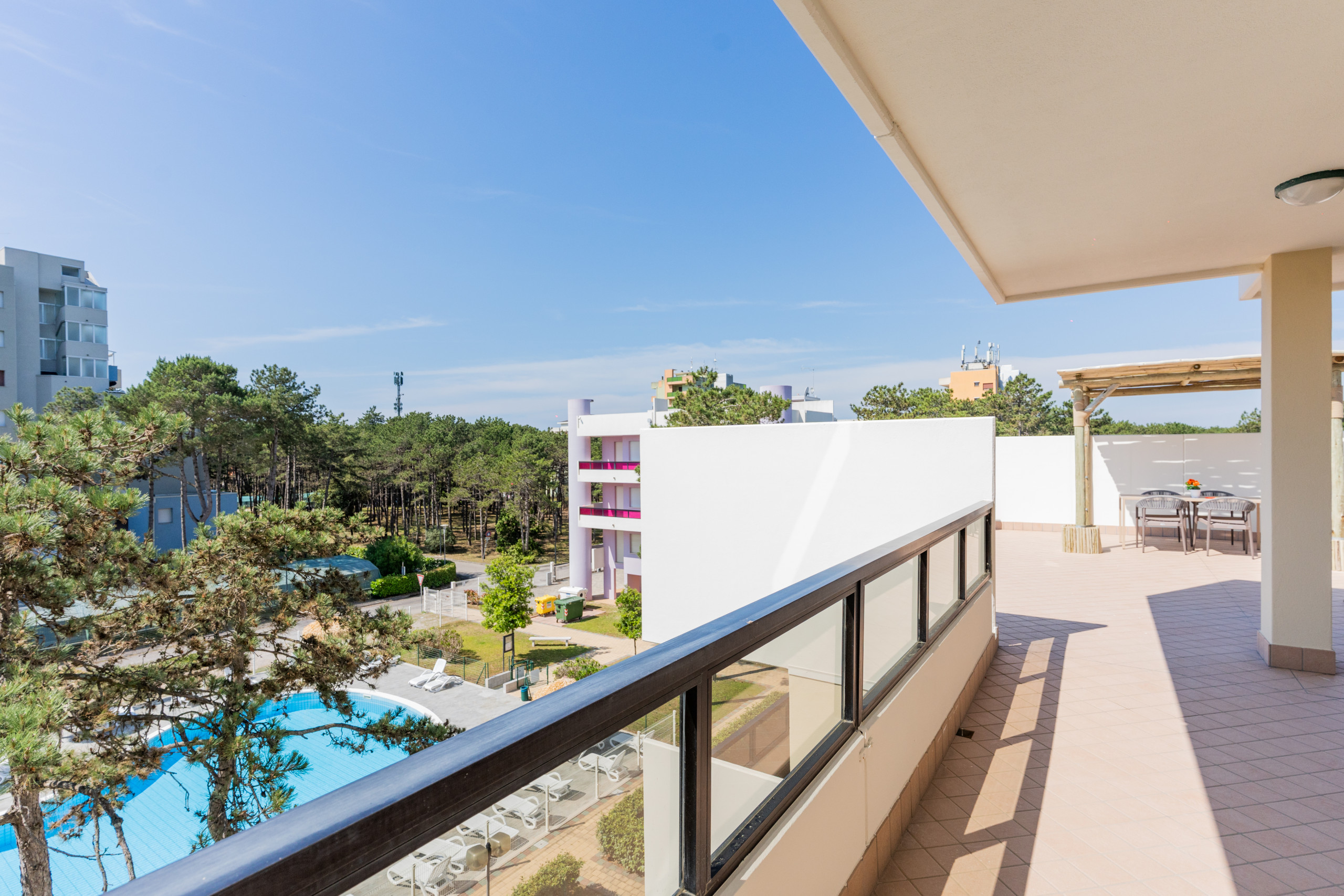 Die renovierten Dreizimmerwohnungen, die sich zwischen dem zweiten und dritten Stock befinden, bieten geräumige Terrassen oder Balkone mit Ausrichtung nach Süden oder Nordwesten, ideal zum Genießen eines Kaffees in der Sonne oder eines Abendessens im Freien mit Blick auf verschiedene Ausblicke von Bibione.