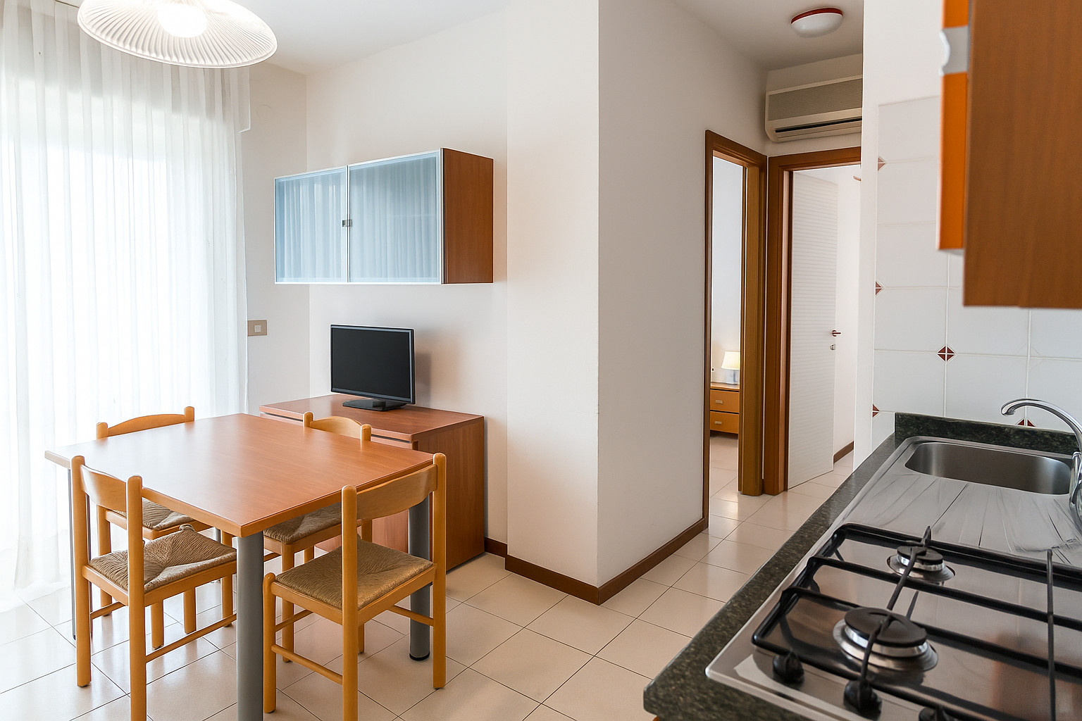 Jede Wohnung verfügt über Klimaanlage, TV, Sicherheitstür und Standkühlschrank, um Ihnen Praktikabilität und Entspannung während des gesamten Aufenthalts zu garantieren.