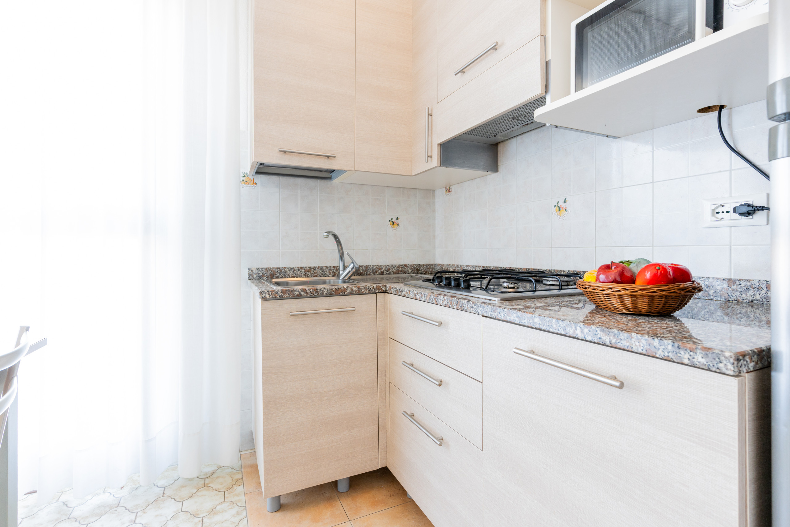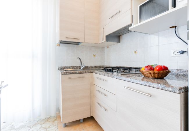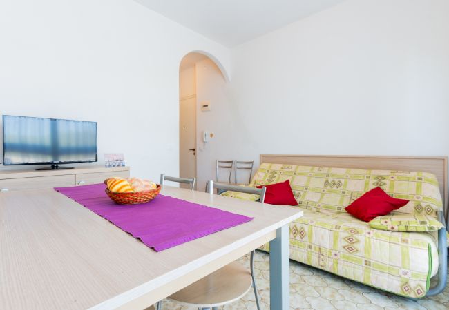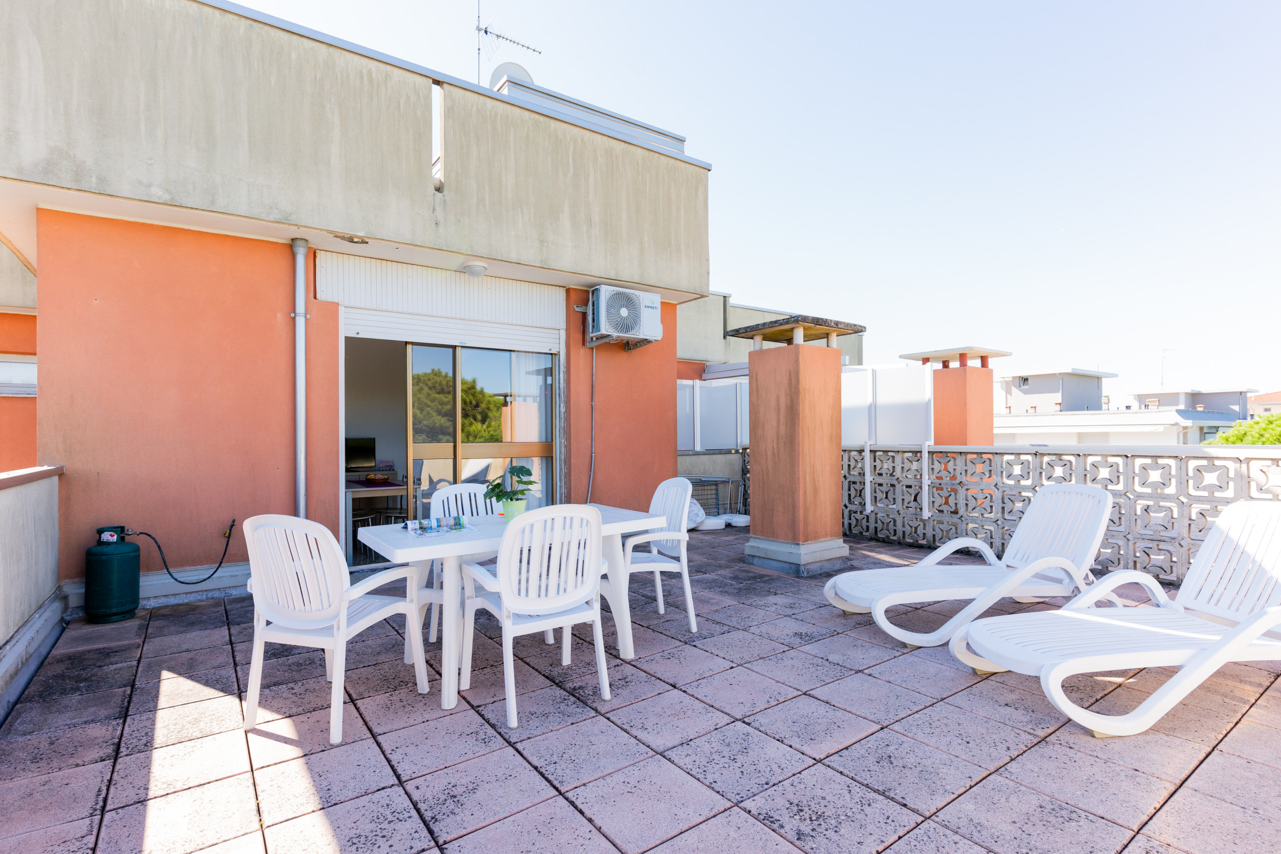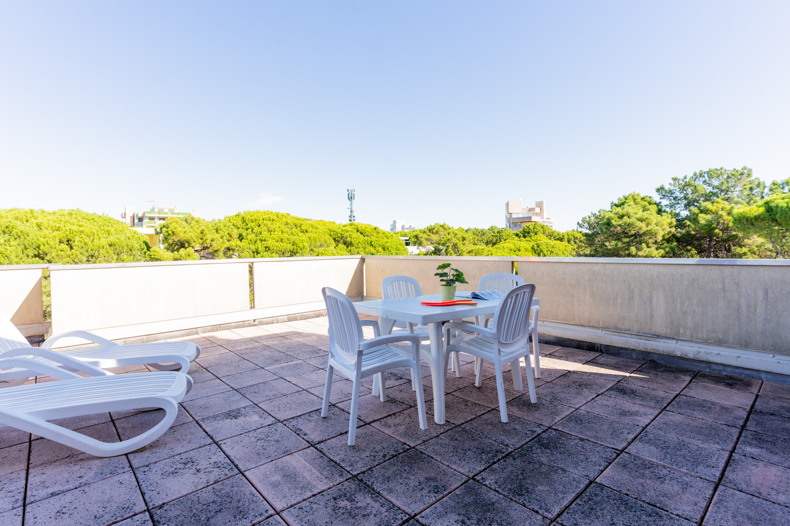 Die Zweizimmerwohnung im vierten Stock bietet lichte Räume und eine große Terrasse, die nach Nordosten ausgerichtet ist, perfekt zum Genießen des Frühstücks im Freien oder zum Entspannen nach einem Tag am Meer.