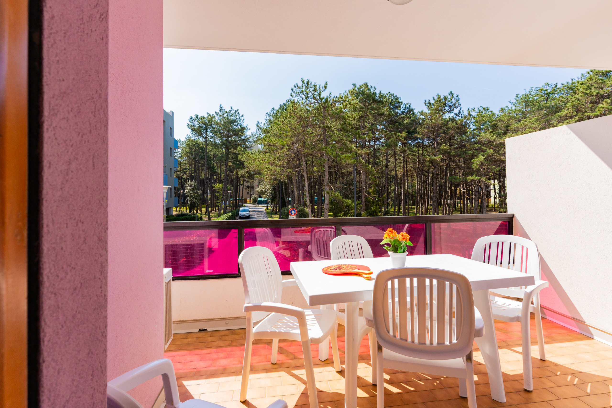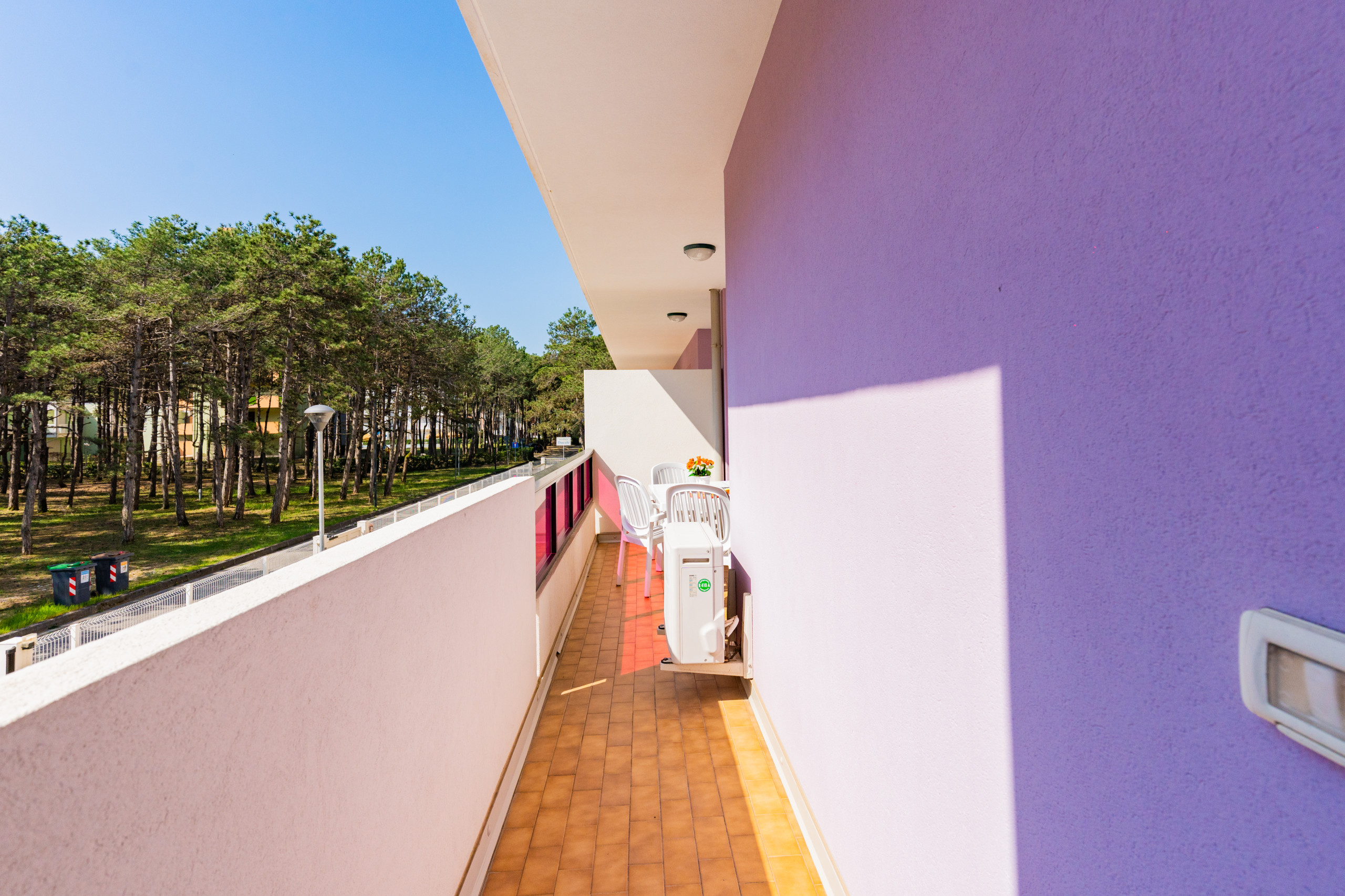 Die renovierten Dreizimmerwohnungen, die sich zwischen dem zweiten und dritten Stock befinden, bieten geräumige Terrassen oder Balkone mit Ausrichtung nach Süden oder Nordwesten, ideal zum Genießen eines Kaffees in der Sonne oder eines Abendessens im Freien mit Blick auf verschiedene Ausblicke von Bibione.