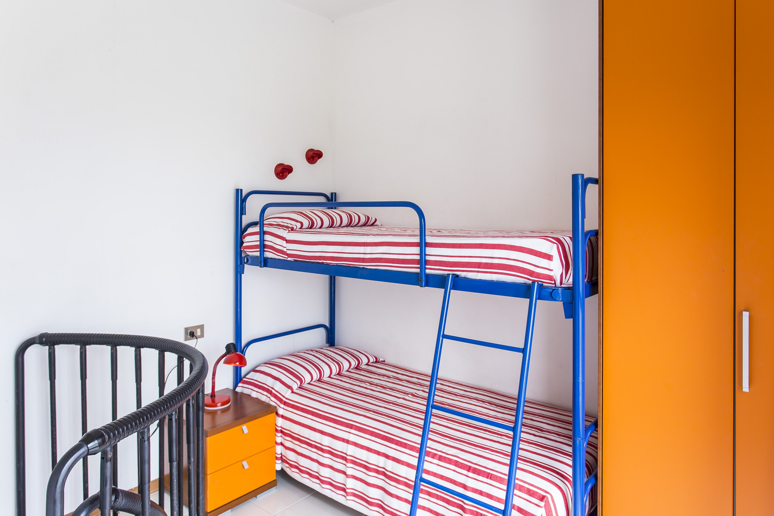 Vierzimmerwohnung mit Dachterrasse. Bestehend aus Wohnraum mit Kochnische und Doppelschlafcouch, Schlafzimmer mit Doppelbett, Zimmer mit 2 Stockbett, Zimmer mit 2 Einzelbetten, Badezimmer mit Duschkabine. Die Wohnung verfuegt ueber Klimaanlage, Kuehlschrank mit Gefrierfach, deutsche Kaffeemaschine, Mikrowelle, Sicherheitstuer und WIFI,SAT-TV. Nummerierter nicht ueberdachter Parkplatz.