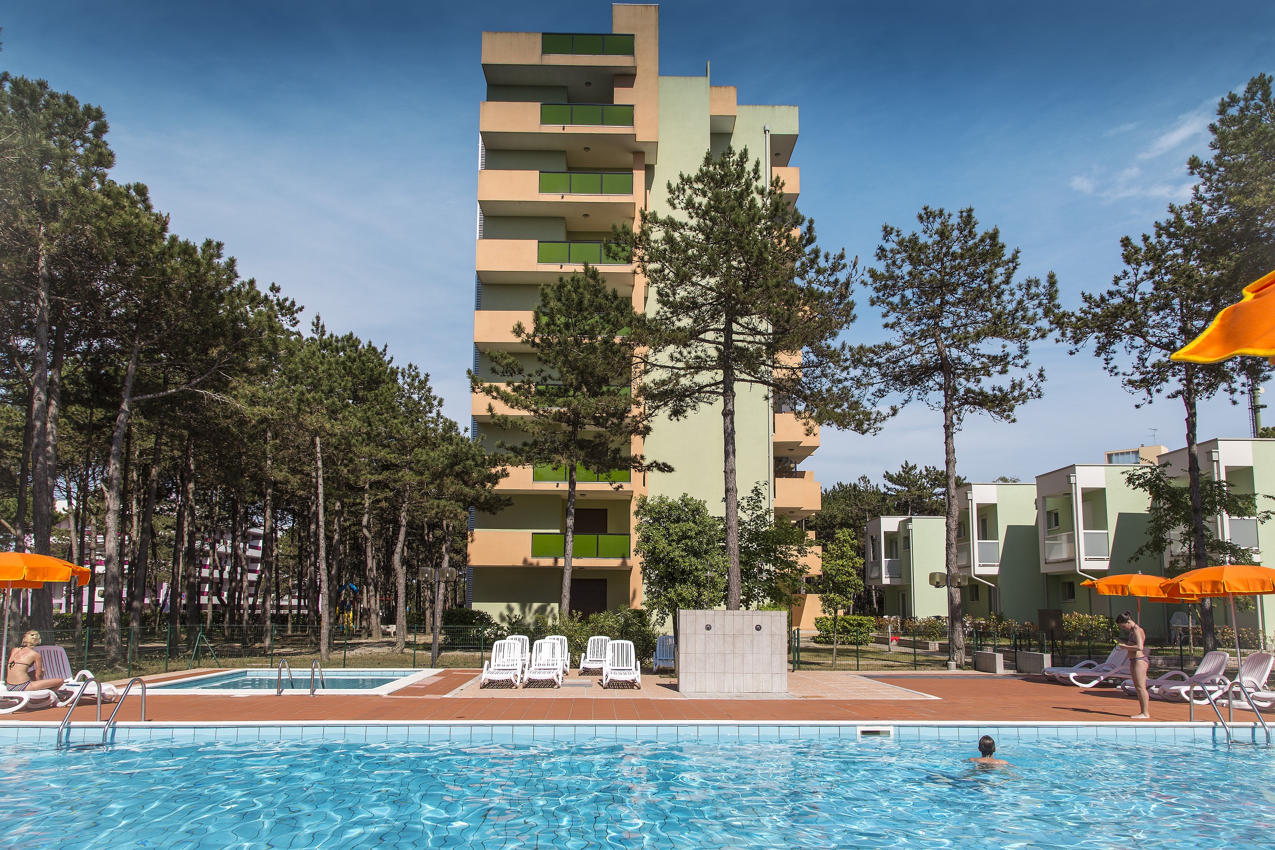 Eingebettet in eine Oase der Ruhe und umgeben von Grün ist das Dorf Tivoli ein einladendes Wohnkomplex mit Schwimmbad für Erwachsene und Kinder, das sich etwa 800 Meter vom Meer entfernt befindet. Die Lage ist ideal für diejenigen, die einen erholsamen Urlaub in der Nähe der lebhaften Atmosphäre von Bibione Spiaggia wünschen: Nur wenige Schritte entfernt befinden sich der Vergnügungspark und die Hauptstraße, die von Geschäften, Restaurants, Bars, Eiscafés und Spielhallen belebt wird und in etwa zehn Minuten bequem zu Fuß erreichbar ist.