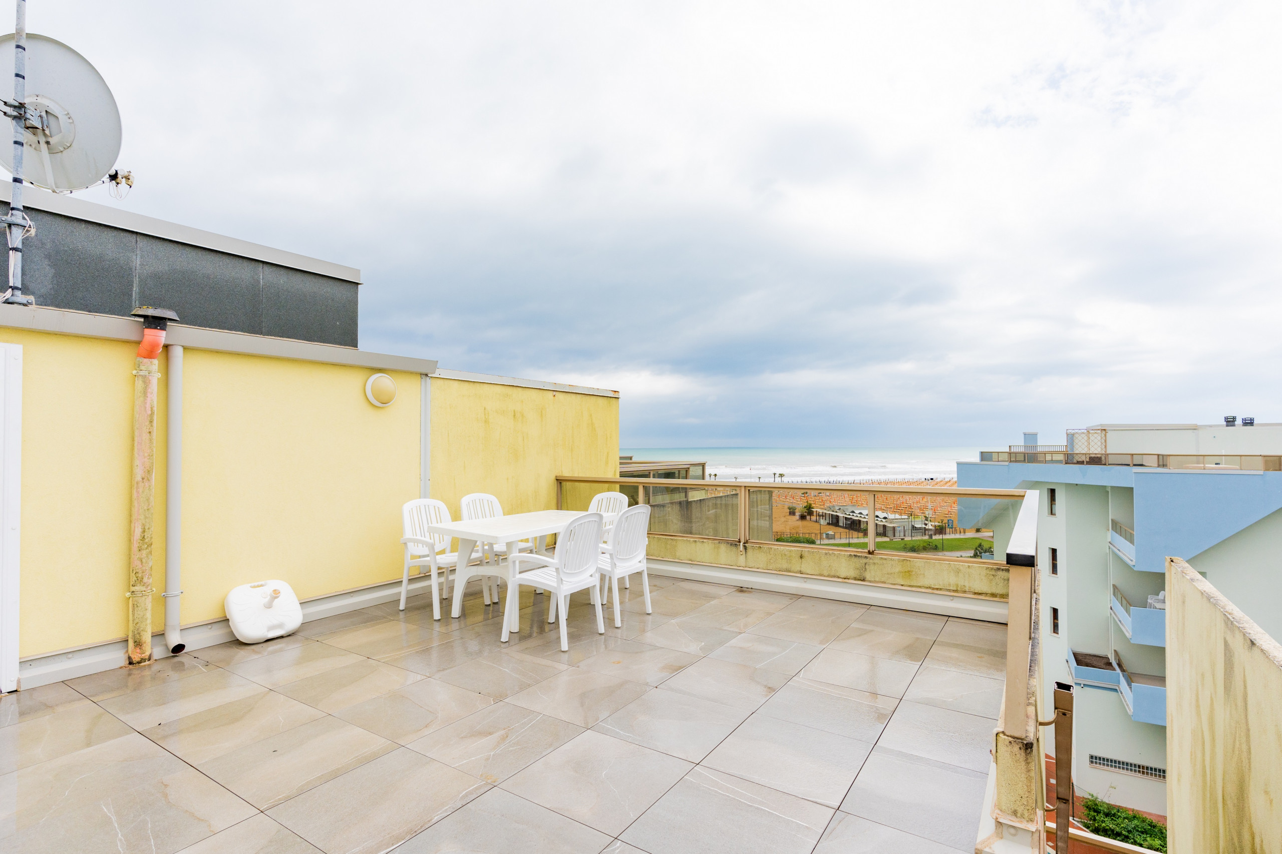 Dreiraumwohnung mit Balkon im vierten Stock mit Dachterrasse (Toilette und Kamin) mit seitlichen Meerblick Richtung Westen.