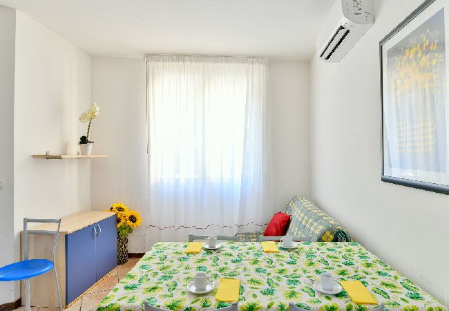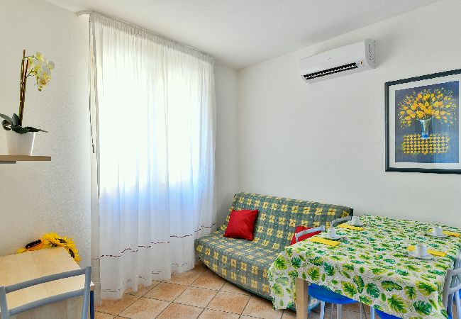 Dreiraumwohnung auf zwei Etagen mit Garten und Balkon. Wohnraum mit Kochnische und Doppelschlafcouch im Erdgeschoss mit Toilette, Schlafzimmer mit Doppelbett und Einzelbett, Schlafzimmer mit zwei Einzelbetten, Bad im ersten Stock. Villaggio Girasoli ist eine Ferienanlage mit Pool für Erwachsene und Kinder ungefähr 500 Meter vom Strand entfernt bestehend aus Reihenhäusern auf 2 Etagen, modern und komfortabel ausgestattet, fast alle mit einem kleinen Privatgarten, Tiefgaragenplatz oder nicht überdachtem Parkplatz. Alle Wohneinheiten verfügen über Klimaanlage, SAT-TV, deutsche Kaffeemaschine, Fön, Wandtresor und grosser Kühlschrank mit Gefrierfach. Gemeinschaftsspielplatz für Kinder. Strandservice im Preis imbegriffen.