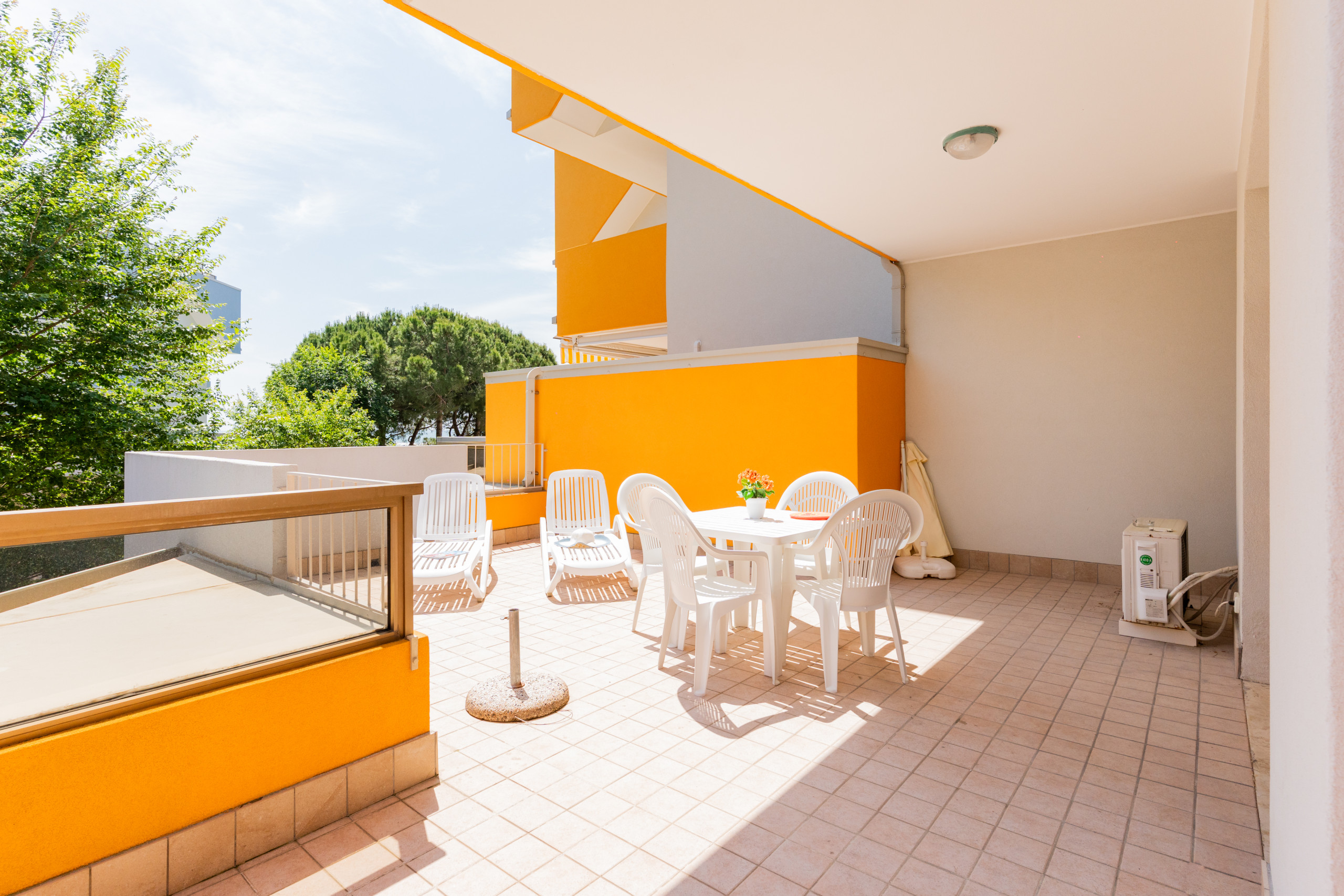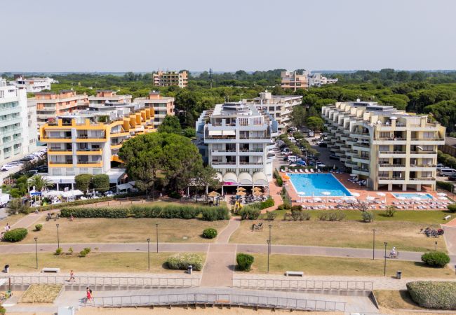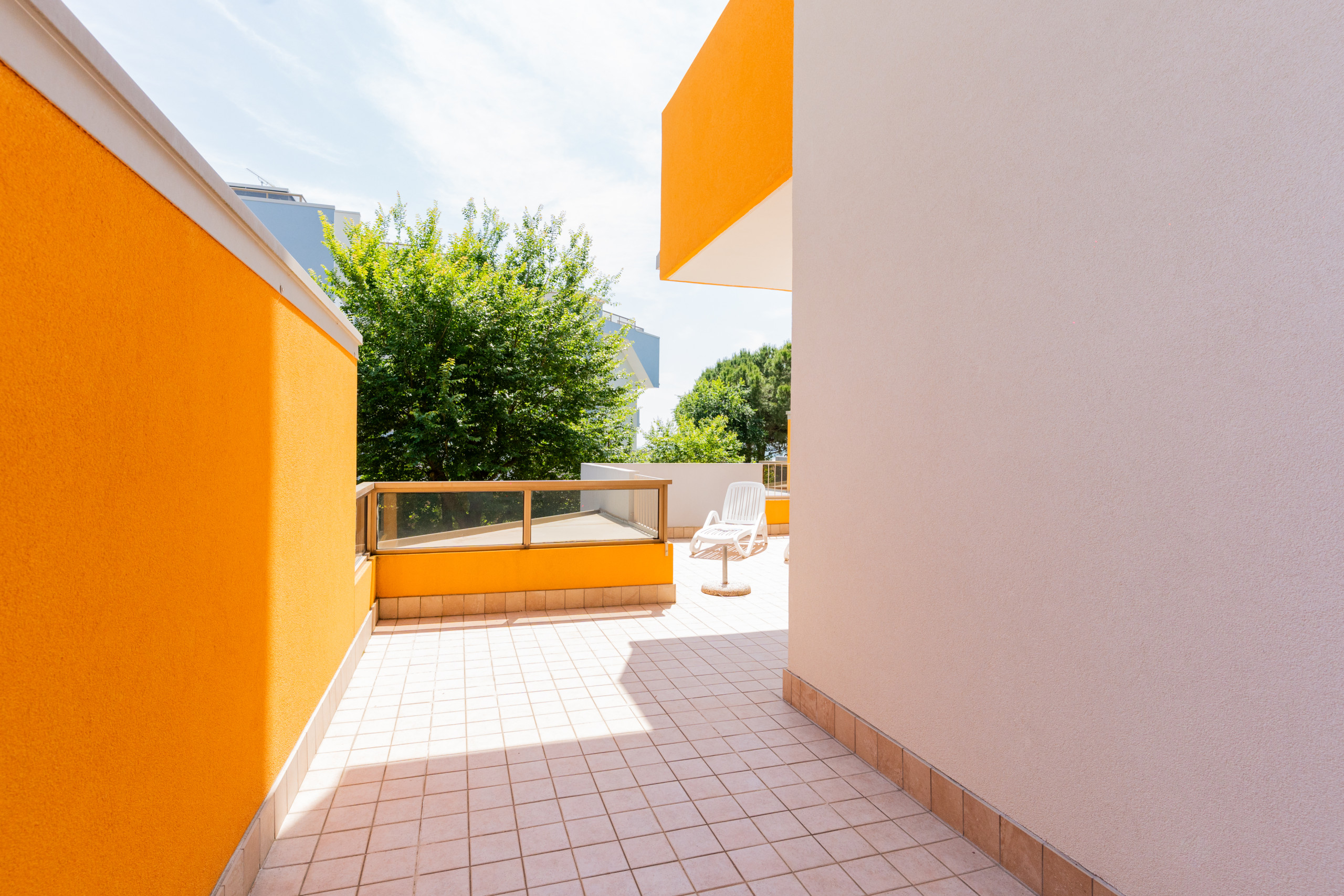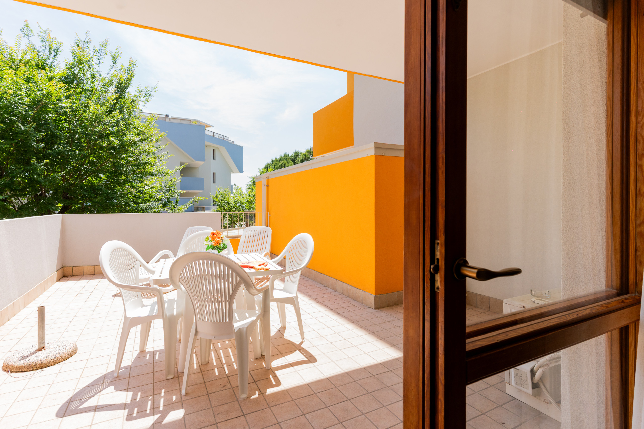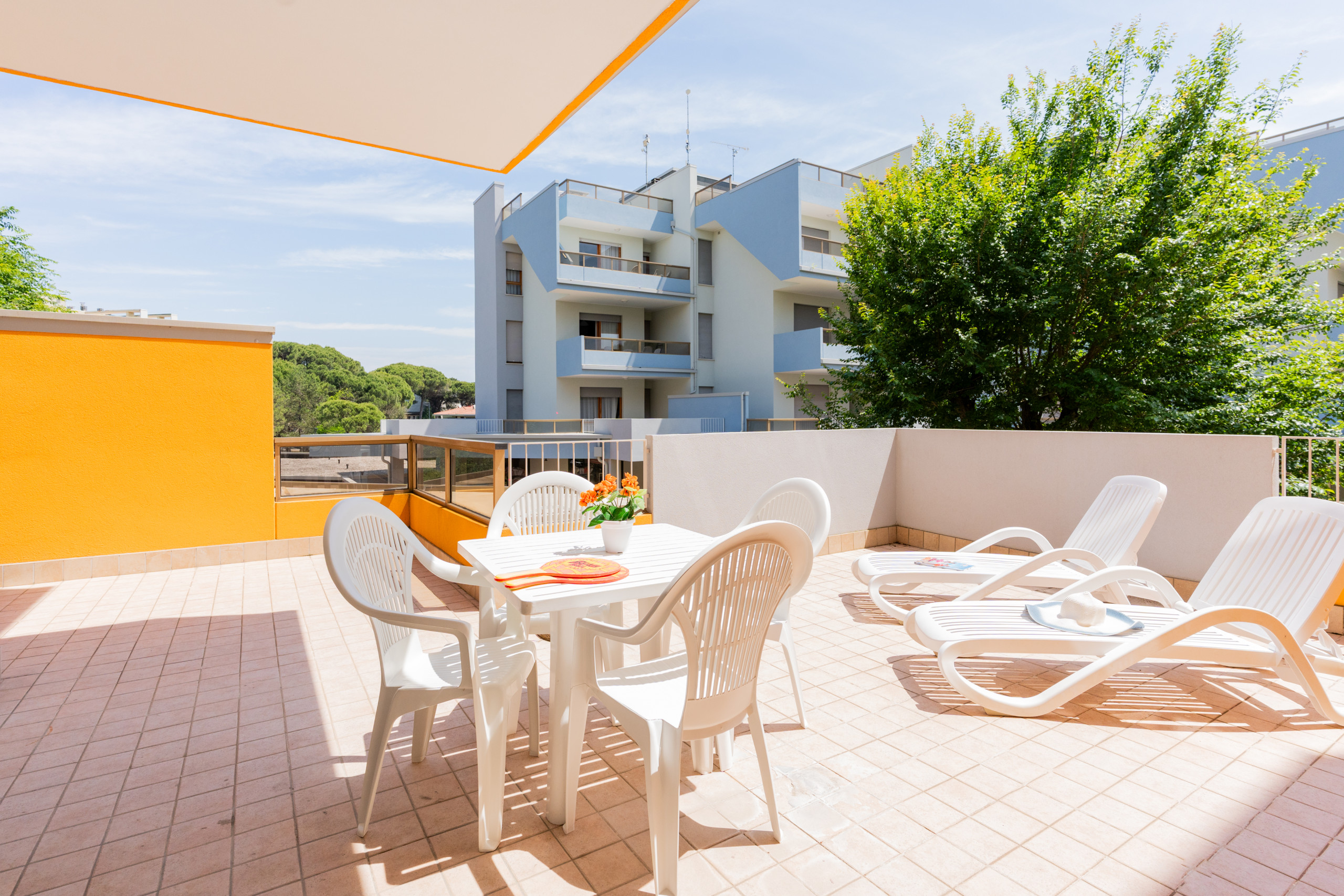 Die renovierten Dreizimmerwohnungen, die sich zwischen dem zweiten und dritten Stock befinden, bieten geräumige Terrassen oder Balkone mit Ausrichtung nach Süden oder Nordwesten, ideal zum Genießen eines Kaffees in der Sonne oder eines Abendessens im Freien mit Blick auf verschiedene Ausblicke von Bibione.